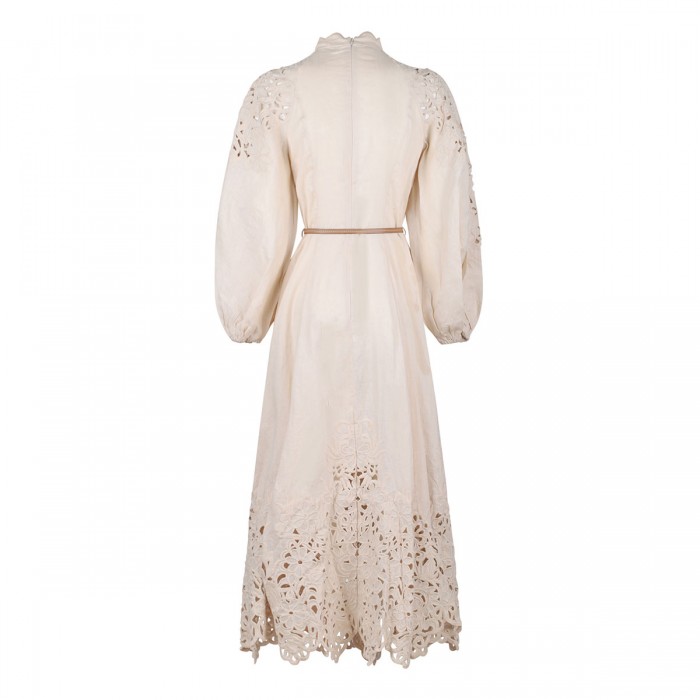 Cream-hue linen Wylie Embroidered midi dress from Zimmermann featuring long blouson sleeves with elastic cuffs, rouleau loops with buttons on front, embroidery throughout, high neck and concealed zip fastening at back.