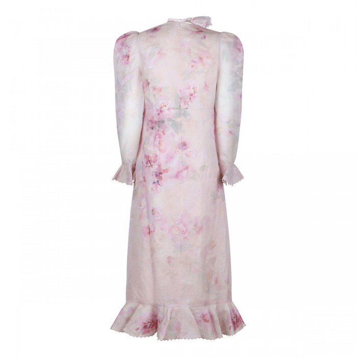 Pink silk linen Crush Flower midi dress from Zimmermann featuring floral motif, frilled detail on hem and cuffs, gathered sleeve head with tulle insert, crew neck with detachable ruffle flower brooch, concealed zip fastening at back.