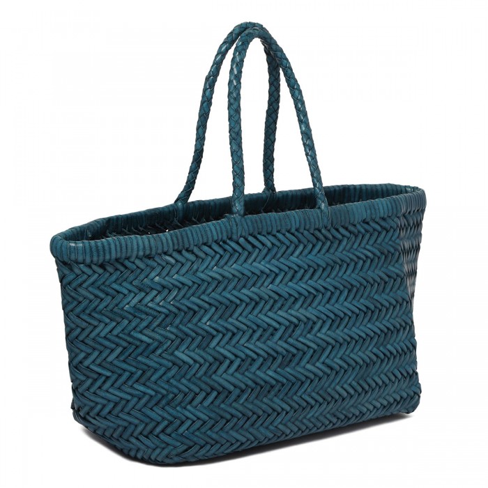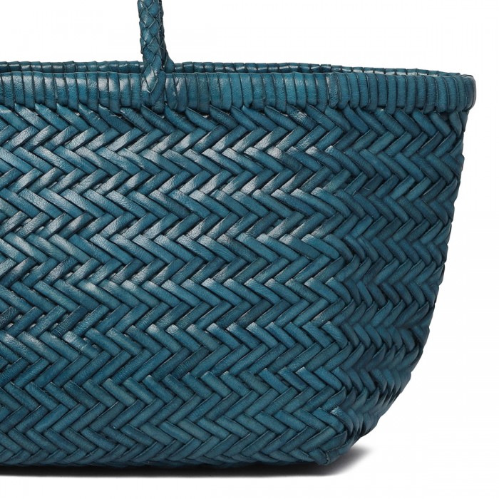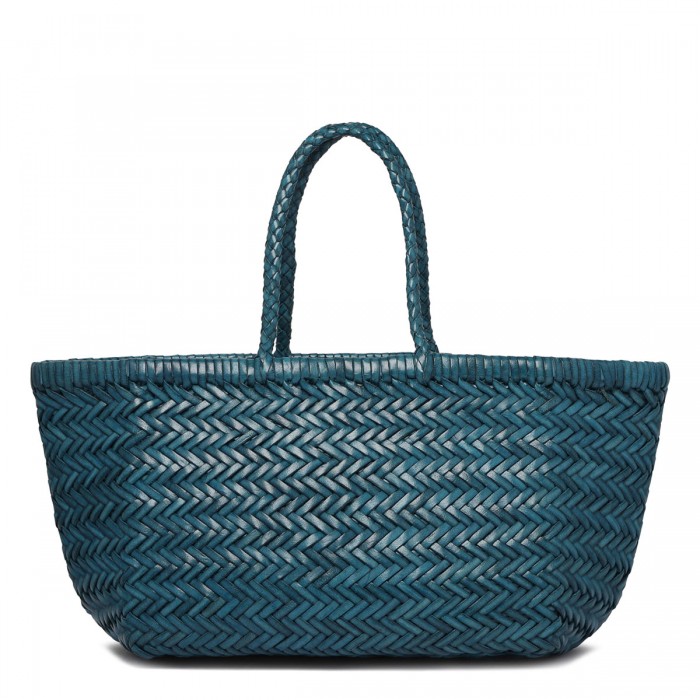Ocean Blue handwoven leather Bamboo Triple Jump tote bag from Dragon Diffusion featuring? iconic diagonal chevron weave, double top handle, St. Christopher medal charm hand-sewn inside the bag, open top. Unlined.
