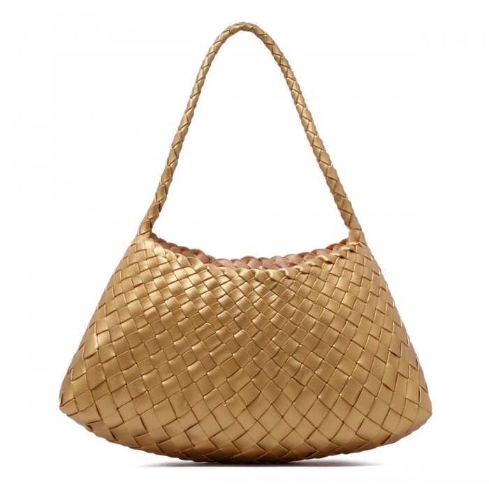 Gold hue hand-woven leather Rosanna mini shoulder bag from Dragon Diffusion featuring intricate weaving pattern, irregular leather weaving straps that taper towards the brim, St. Christopher medal charm hand-sewn inside the bag, open top. Unlined.