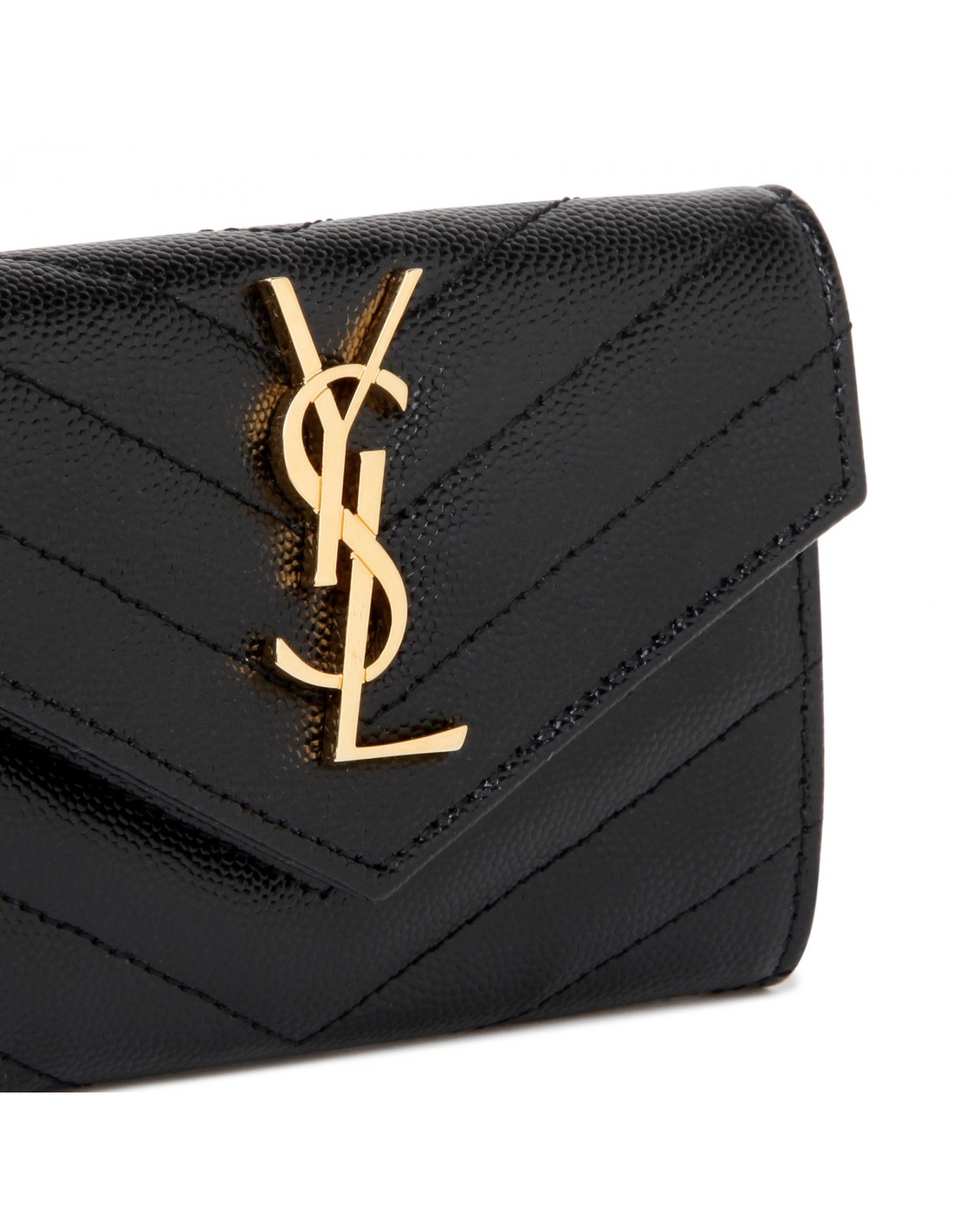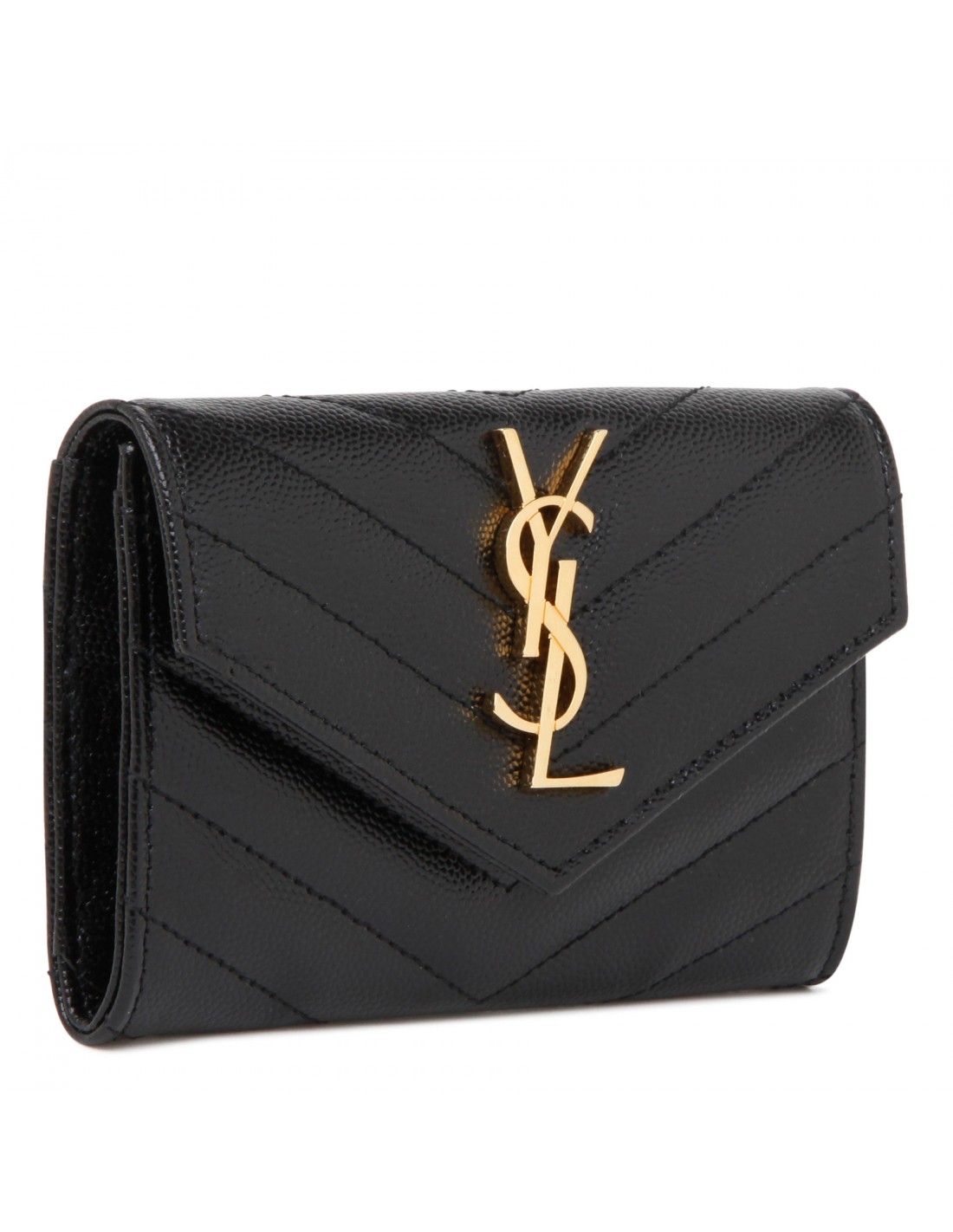 Black grain de poudre matelasse leather Cassandre small envelope wallet from Saint Laurent featuring iconic chevron quilting, cassandre embellishment, snap closure, external back slot pocket, four card slots, one open compartment.