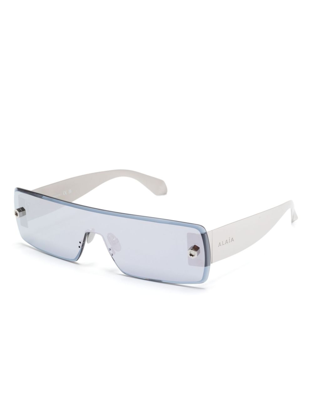 Silver colour, metal, shiny finish, mask, mirrored lenses, temples with engraved logo, straight temples and temples with curved tip.