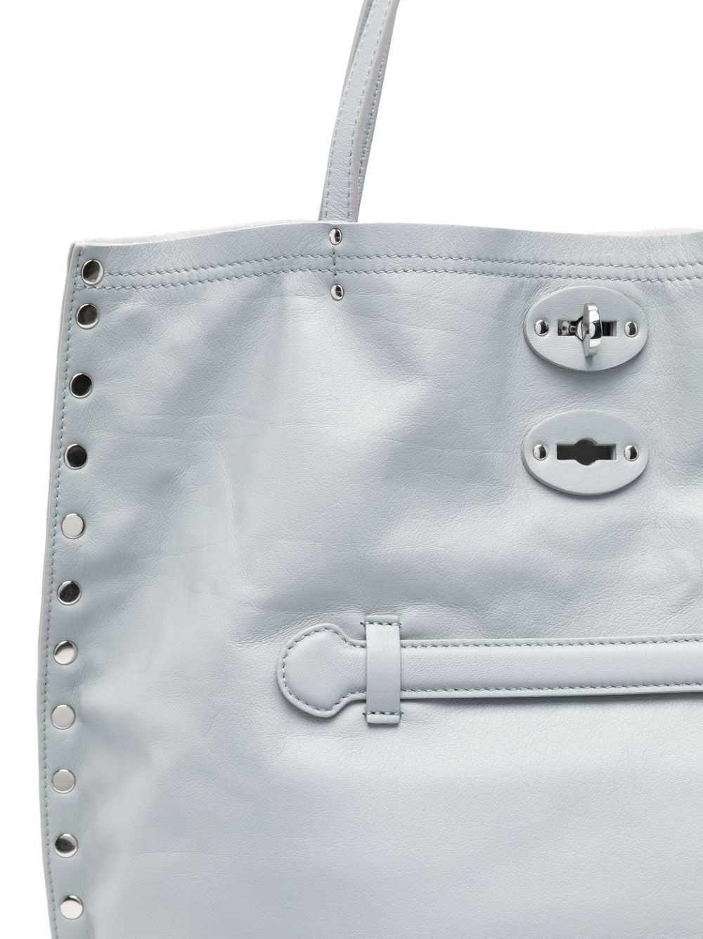 blue-grey foldover top turn-clasp fastening two flat top handles metal feet
