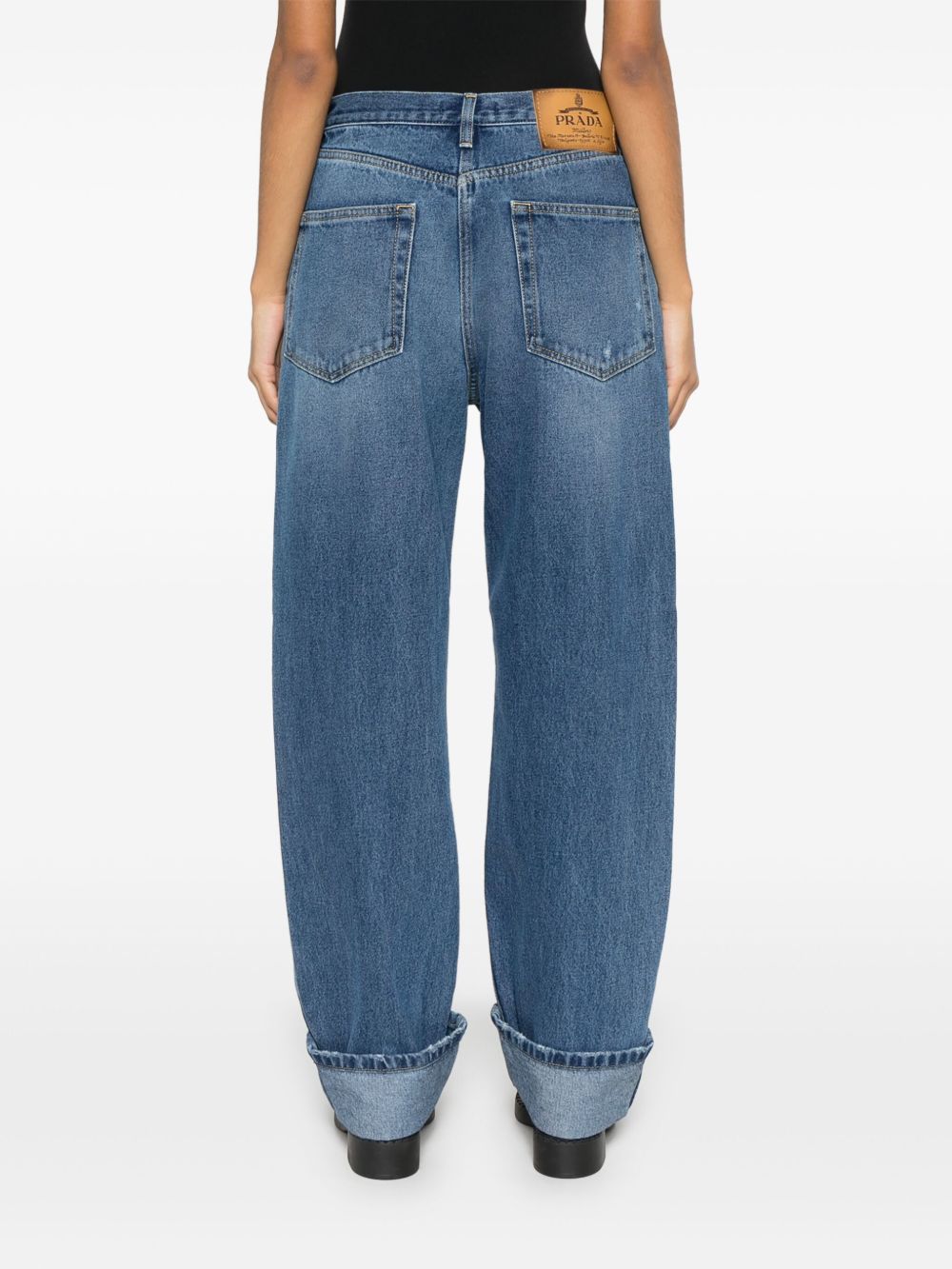 blue button fly fastening belt loops classic five pockets logo patch to the rear