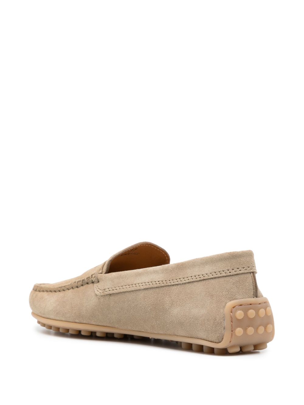 Beige, suede, slip-on design, diamond cut vamp, round toe and rubber sole.
