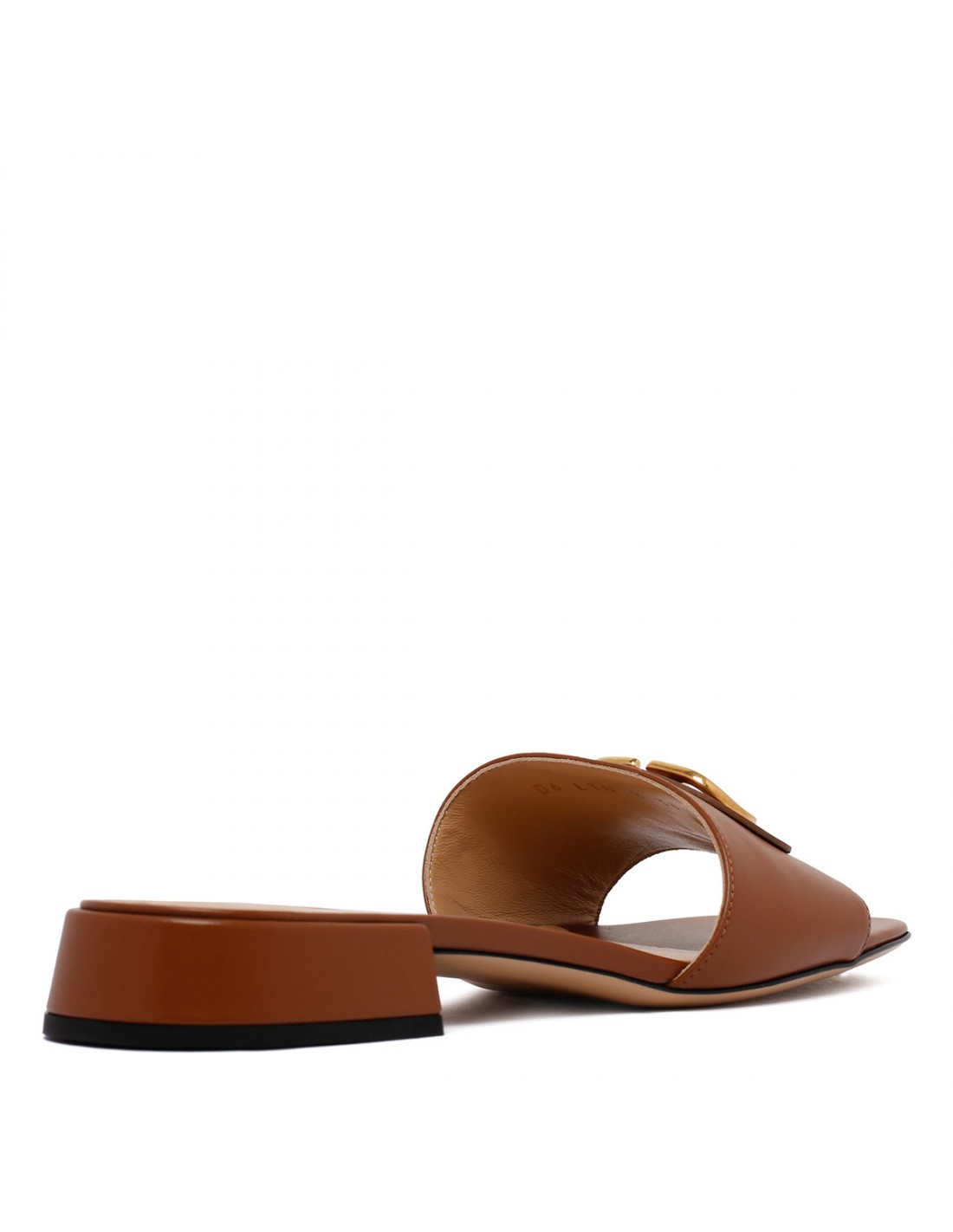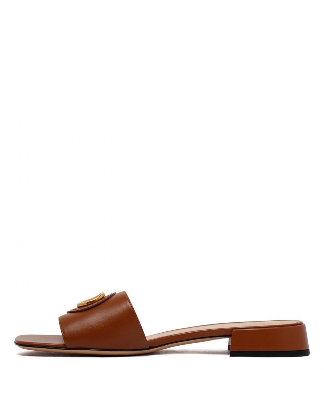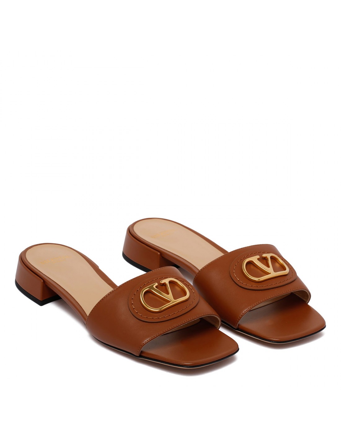 Brown leather slide sandals from Valentino Garavani featuring gold-tone VLogo signature detail, square open toe, slip on design, flat heel, leather insole and sole.