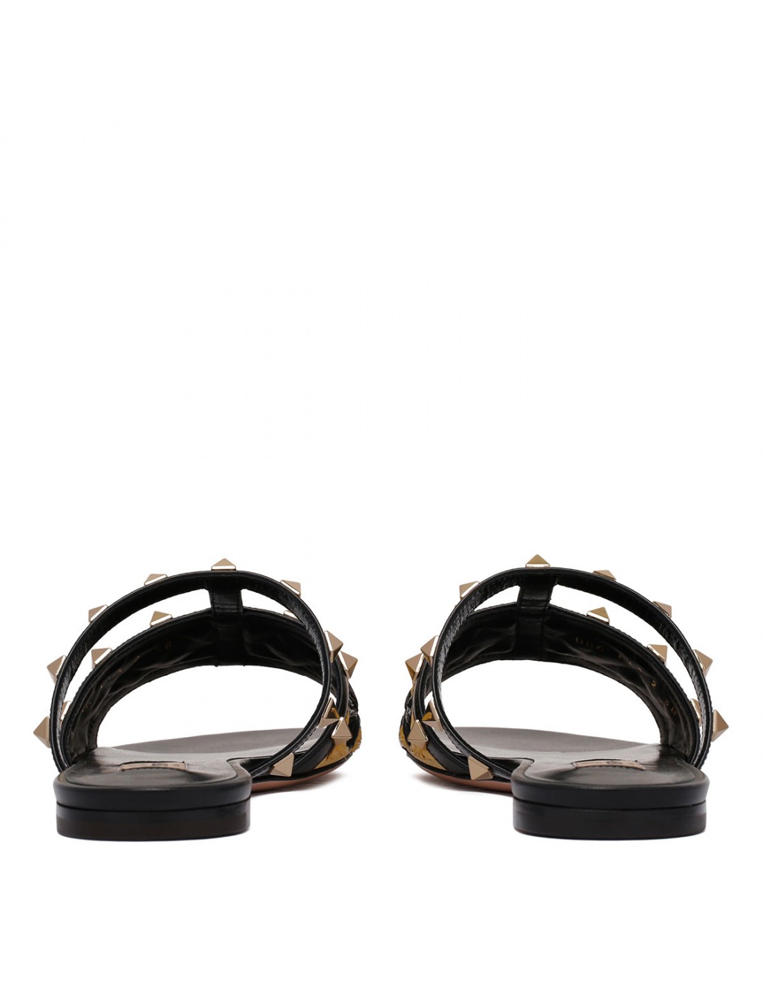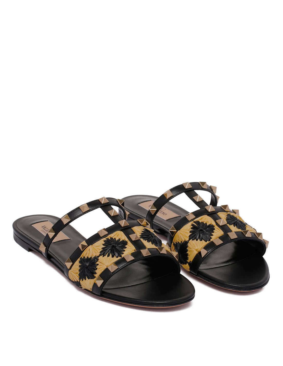 Black lightweight PVC Rockstud flat slide sandals from Valentino Garavani featuring platinum finish signature pyramid-shaped studs, synthetic raffia inserts with geometric pattern, slip on design, almond open toe, flat sole.