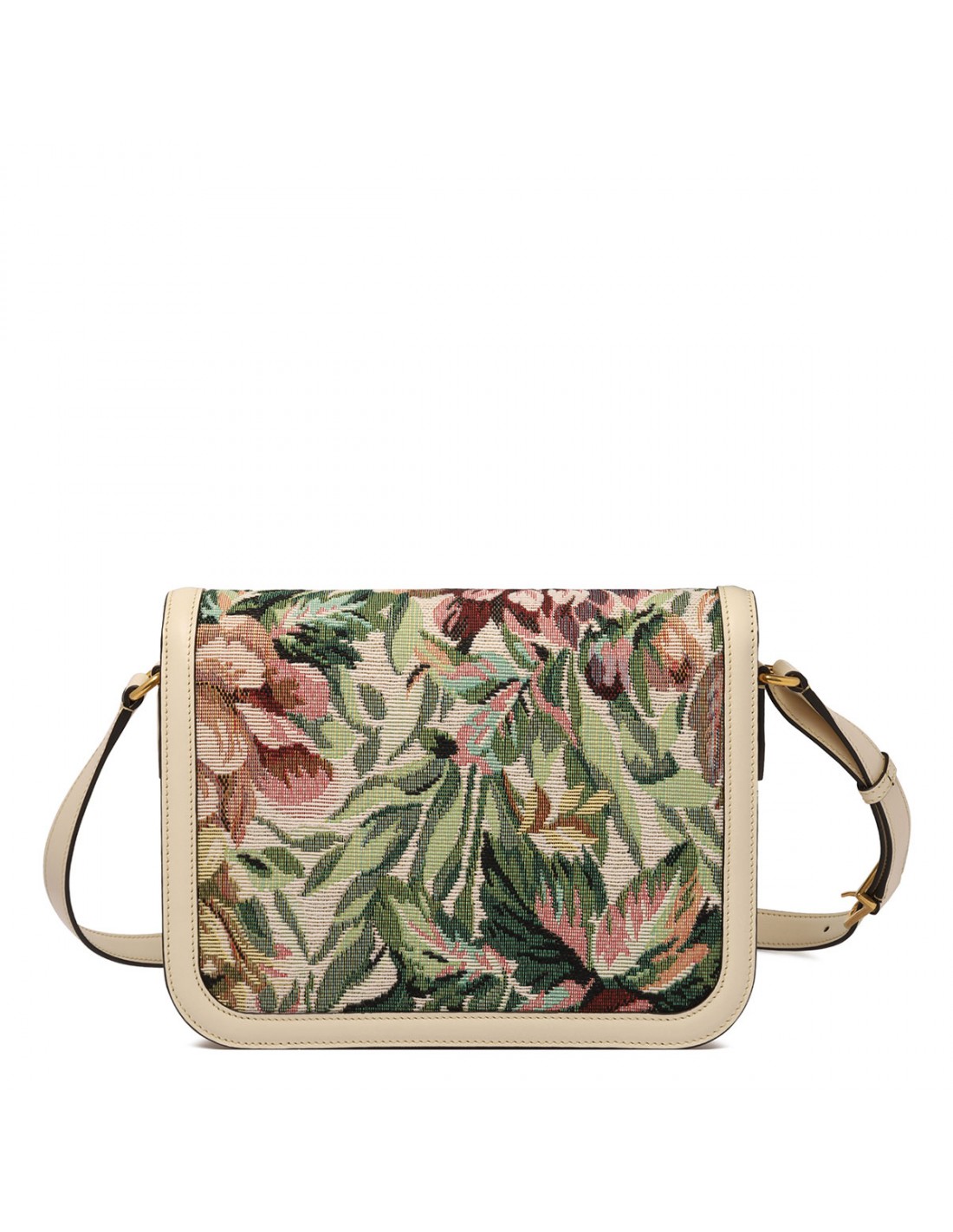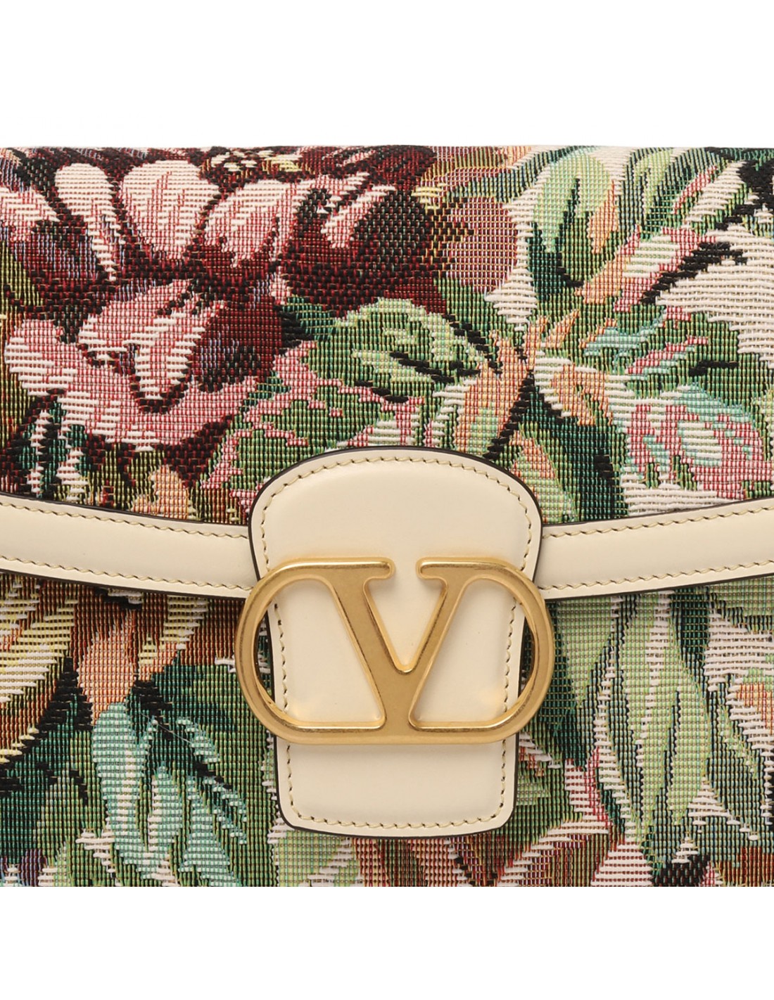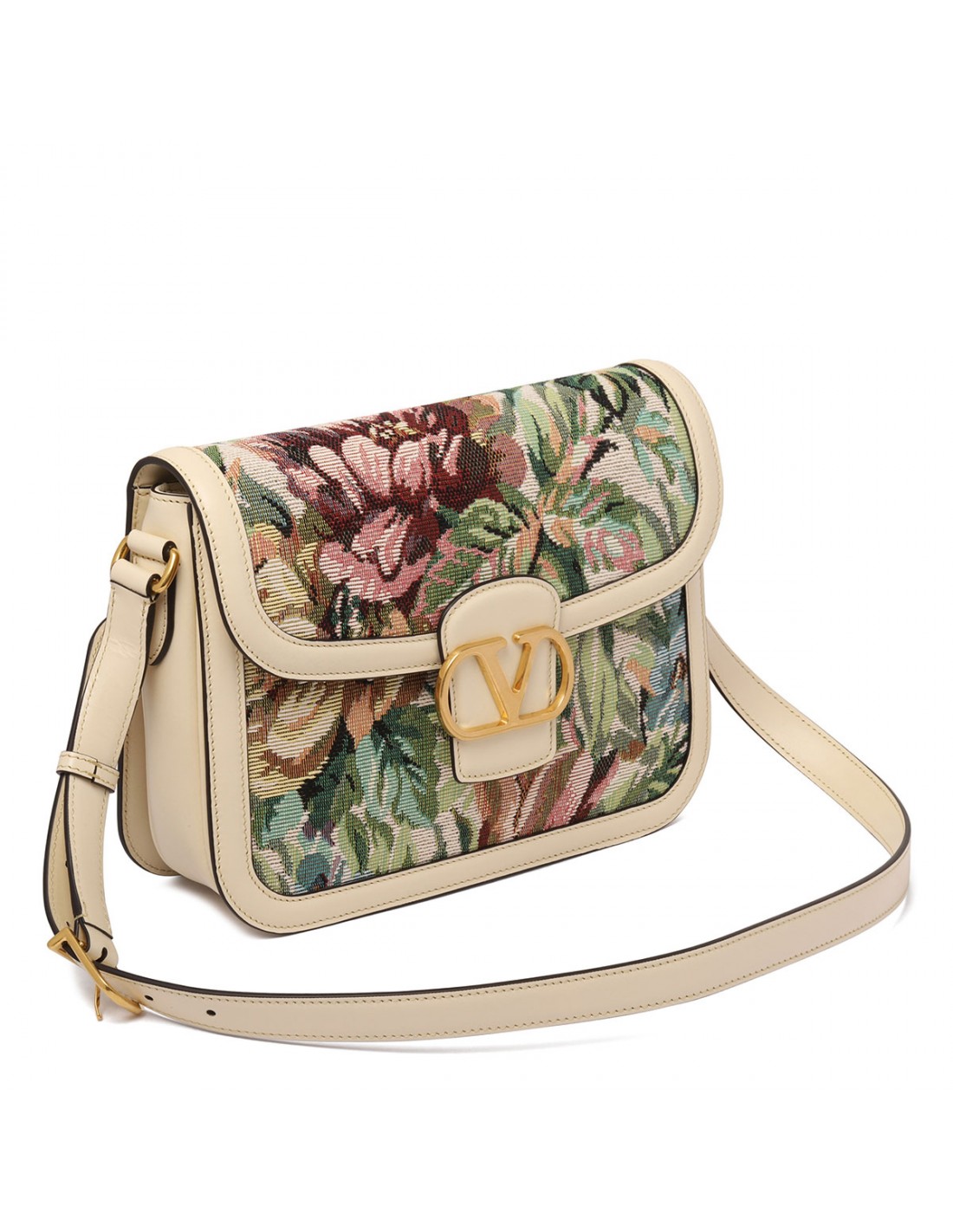 Voyage Imaginaire jacquard fabric 9TO5 shoulder bag from Valentino Garavani featuring butter white leather trims, VLogo Signature, magnetic fastening, adjustable leather shoulder strap, antique brass-finish hardware, nappa leather lining, three internal compartments, slip pocket with button closure.