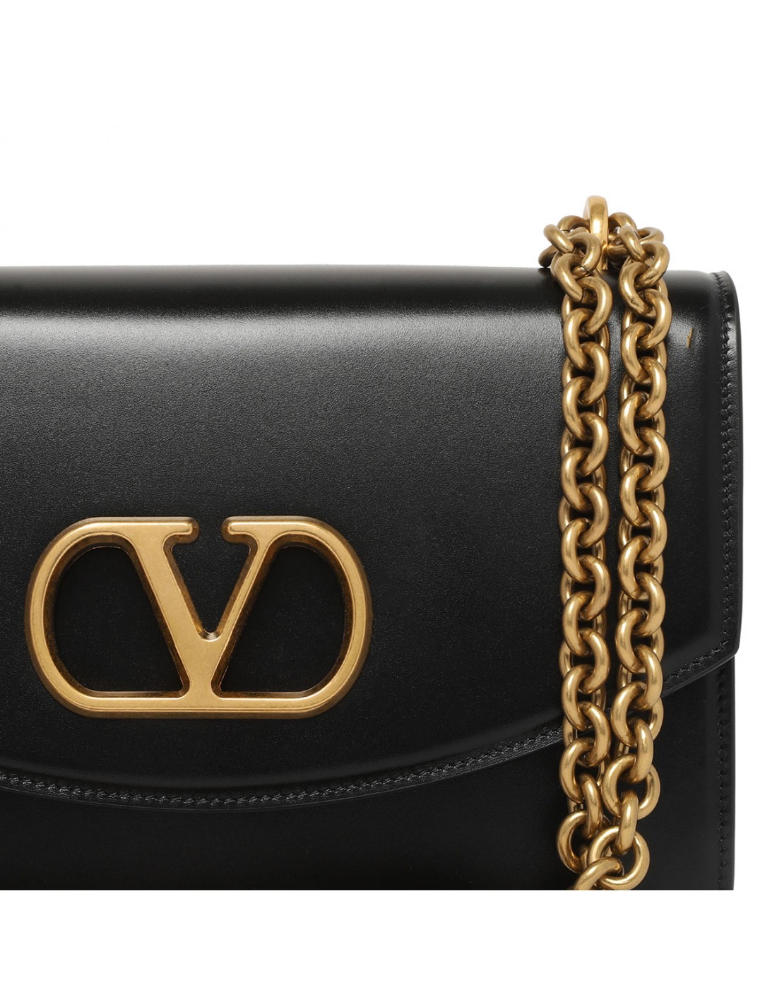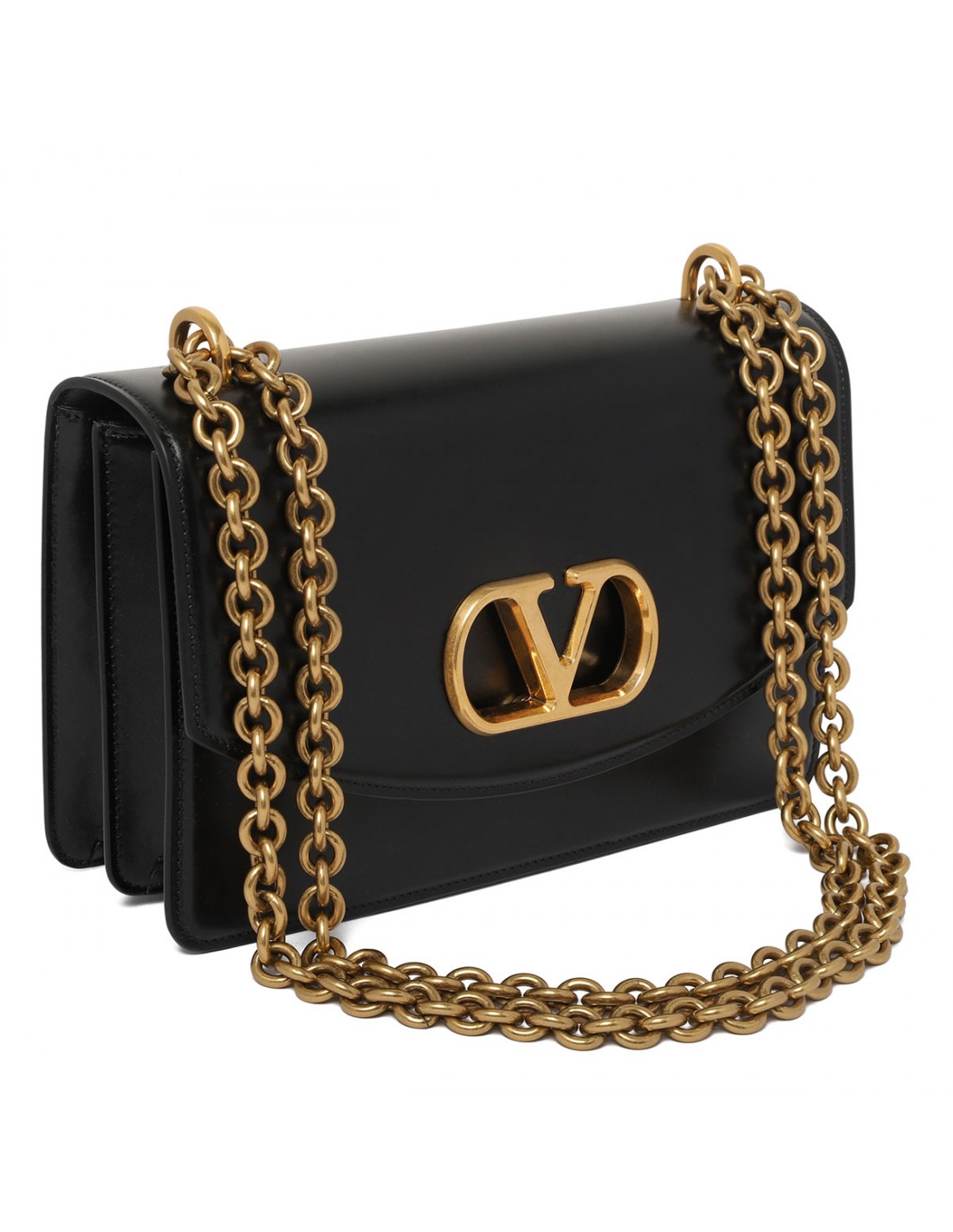 Black shiny calfskin Vain shoulder bag from Valentino Garavani metallic VLogo Signature detail, sliding chain shoulder strap, antique gold-finish hardware, magnetic fastening, nappa lining, two internal compartments, zipped pocket and slip pocket.