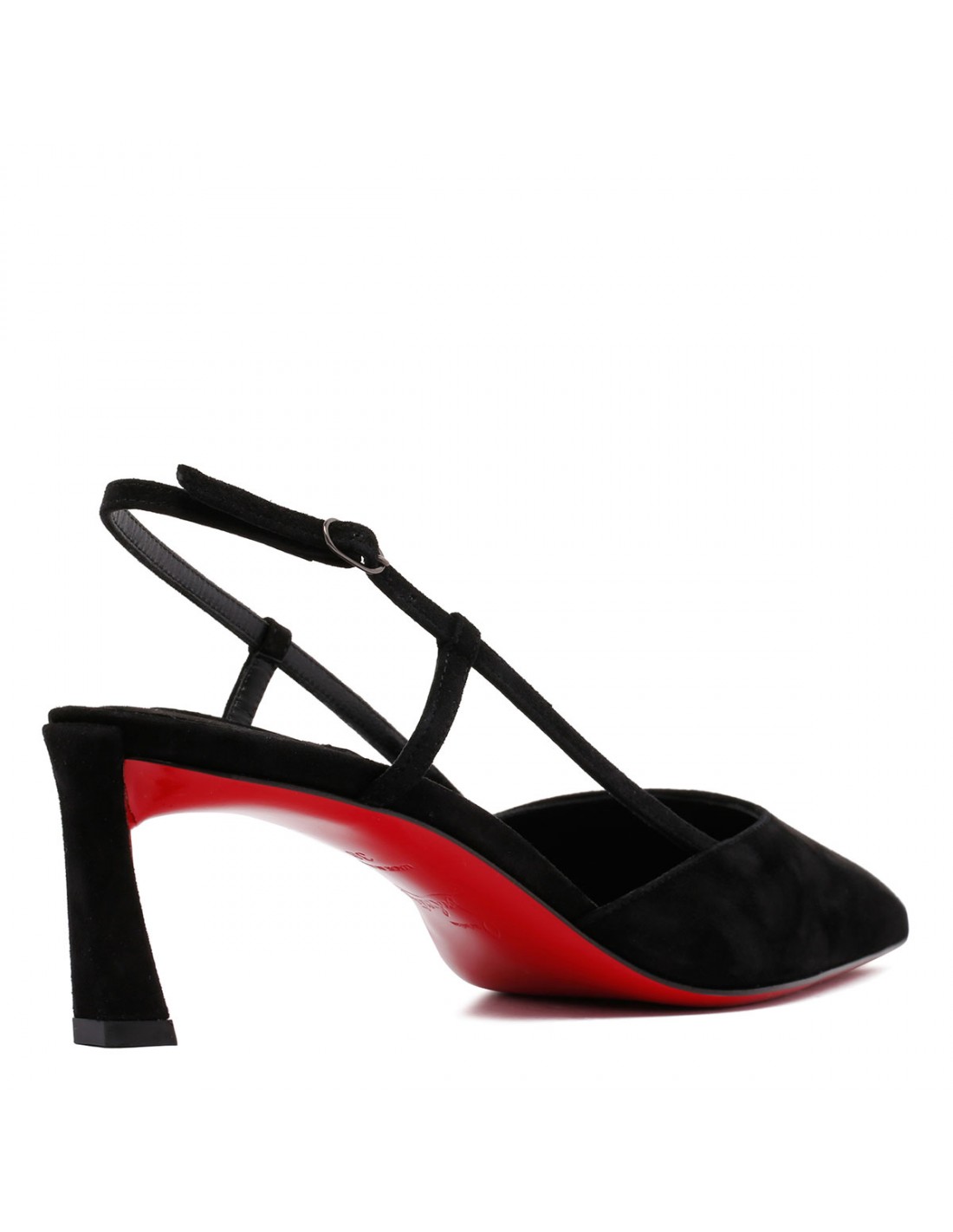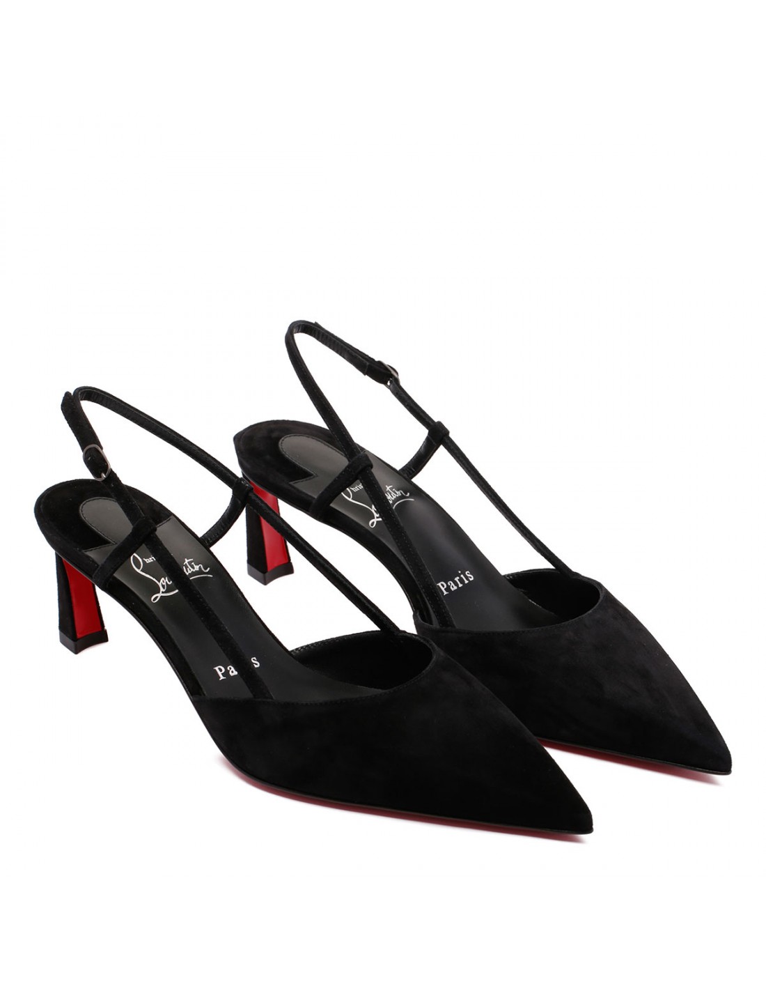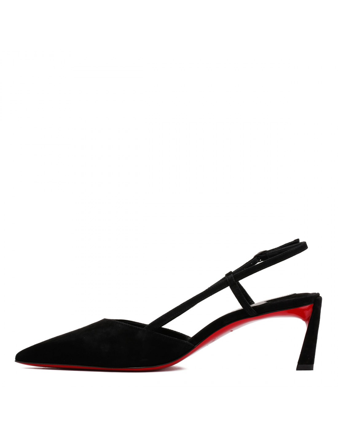 Black suede leather Condoroline slingback pumps from Christian Louboutin featuring slim side strap with adjustable buckle fastening, pointe toe, 55 slim heel, leather insole and iconic Loubi red sole.