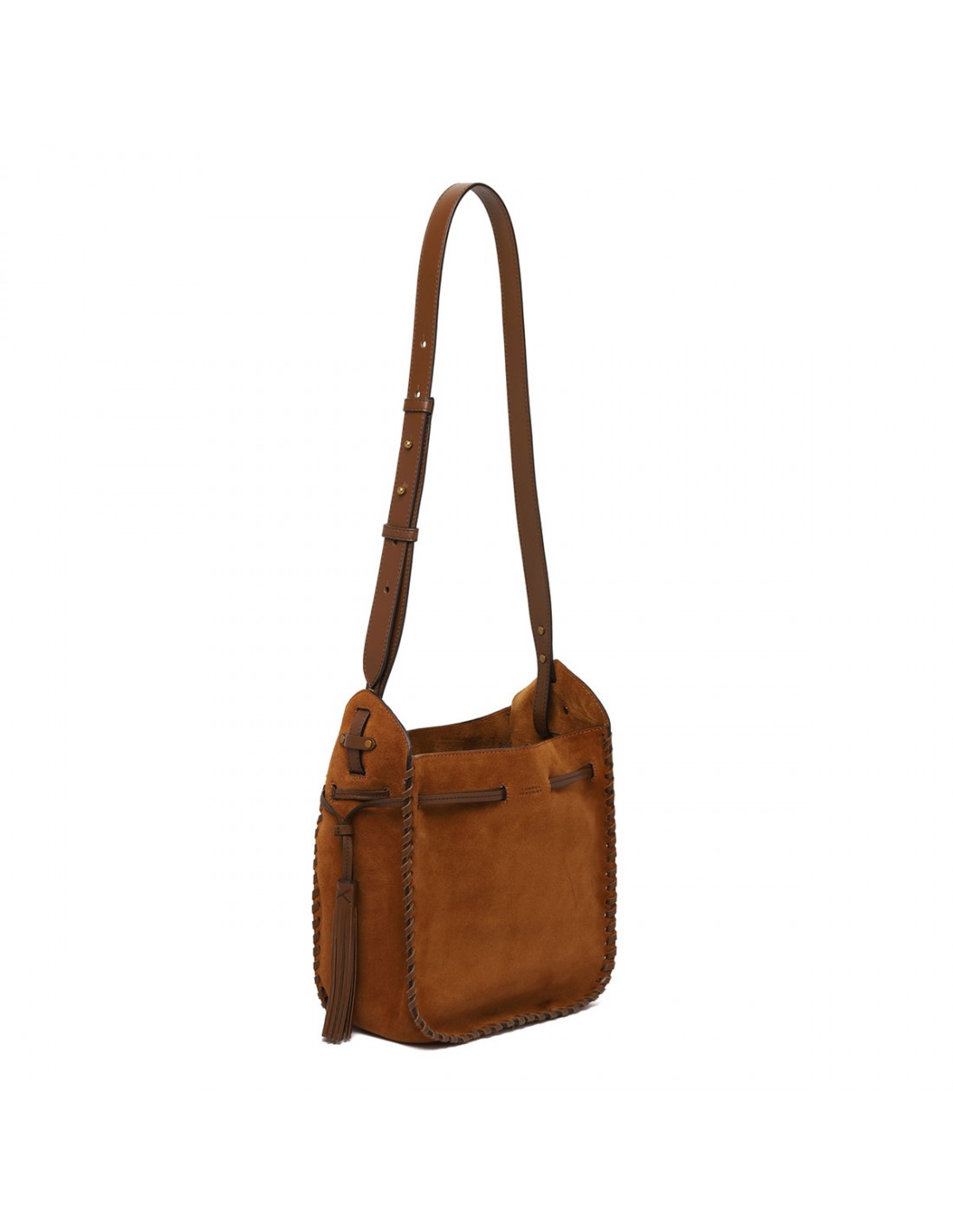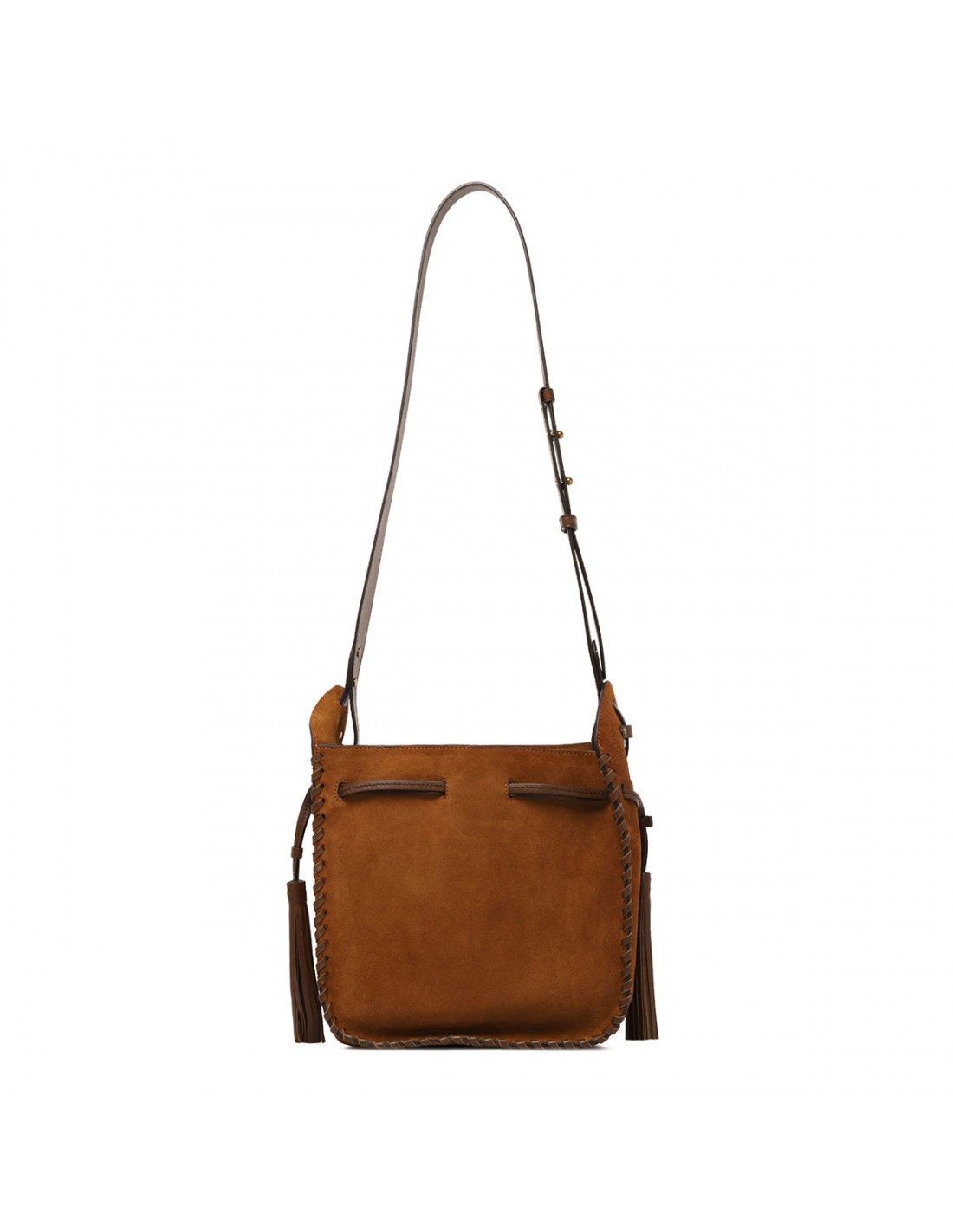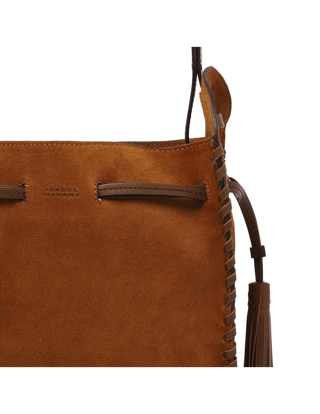 Cognac suede leather Silao bucket bag from Isabel Marant featuring braided trims, adjustable shoulder strap with studded buttons, drawstring closure, fringed leather tassels on sides, embossed logo.