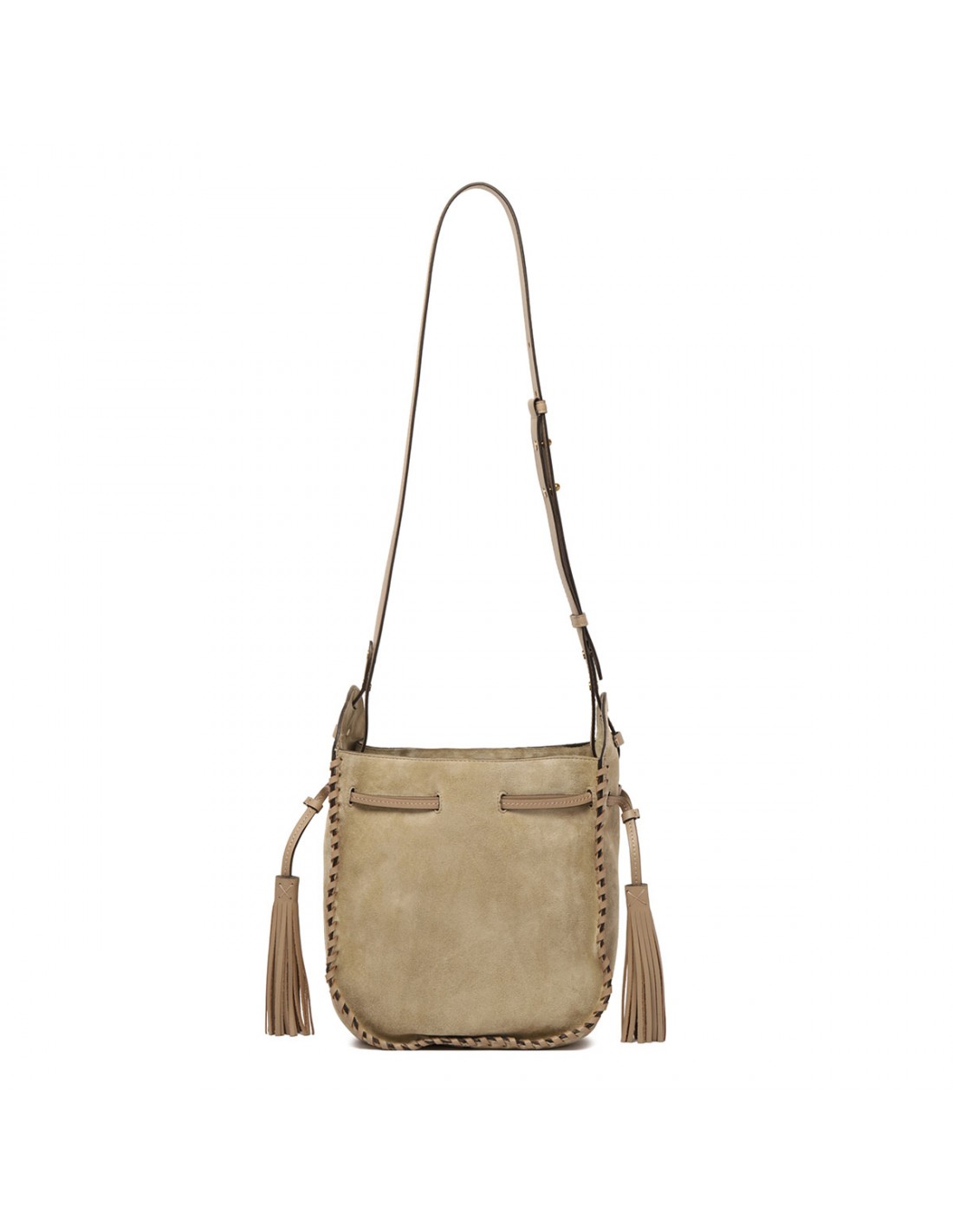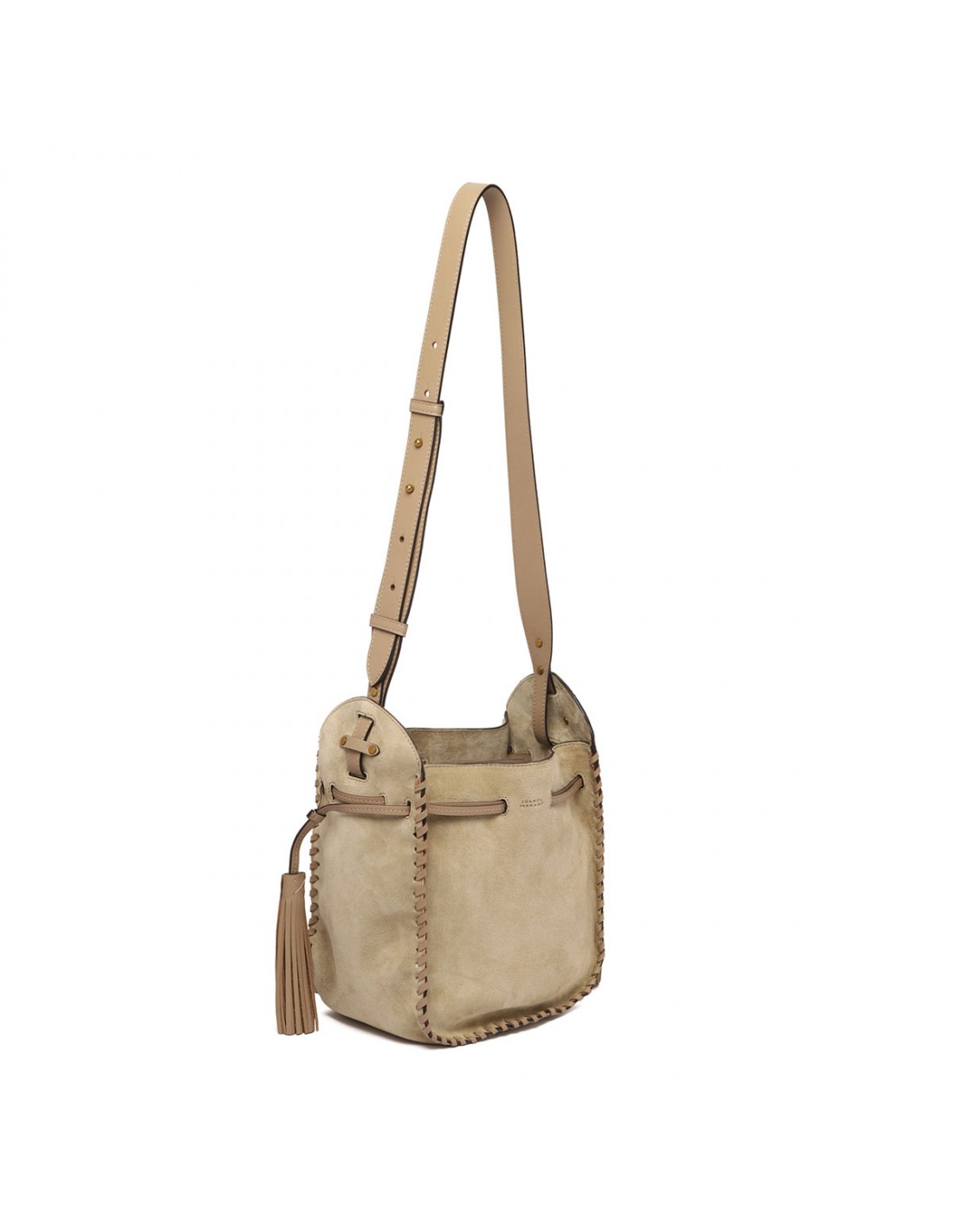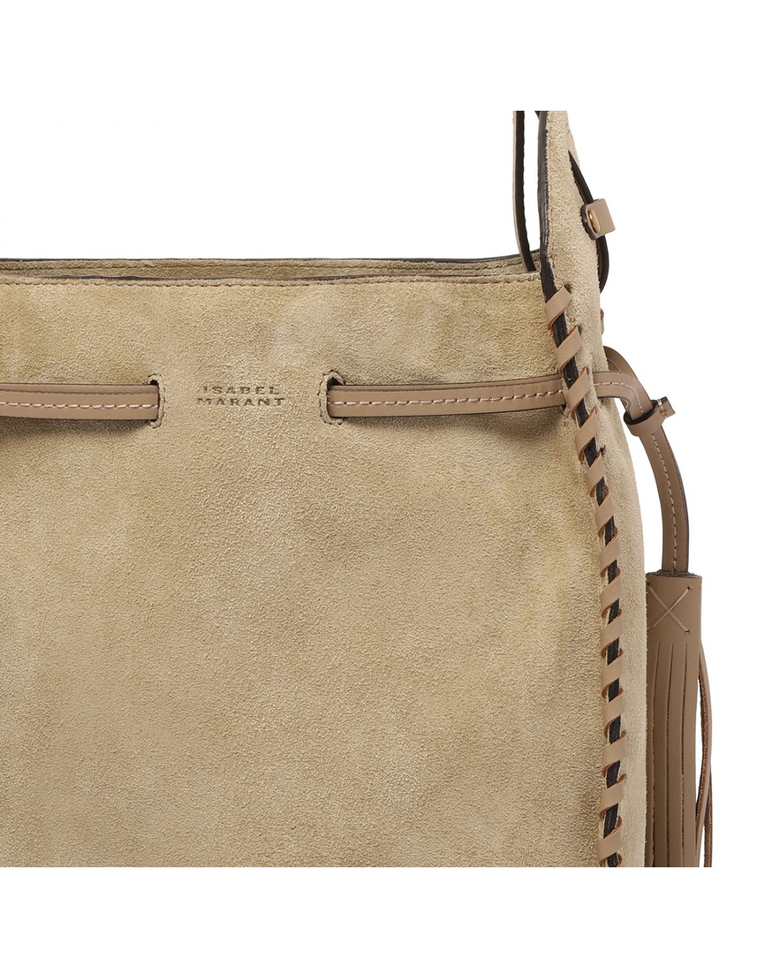 Light beige suede leather Silao bucket bag from Isabel Marant featuring braided trims, adjustable shoulder strap with studded buttons, drawstring closure, fringed leather tassels on sides, embossed logo.