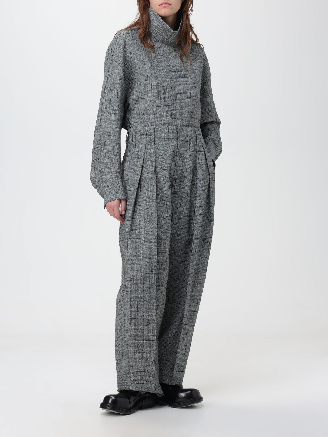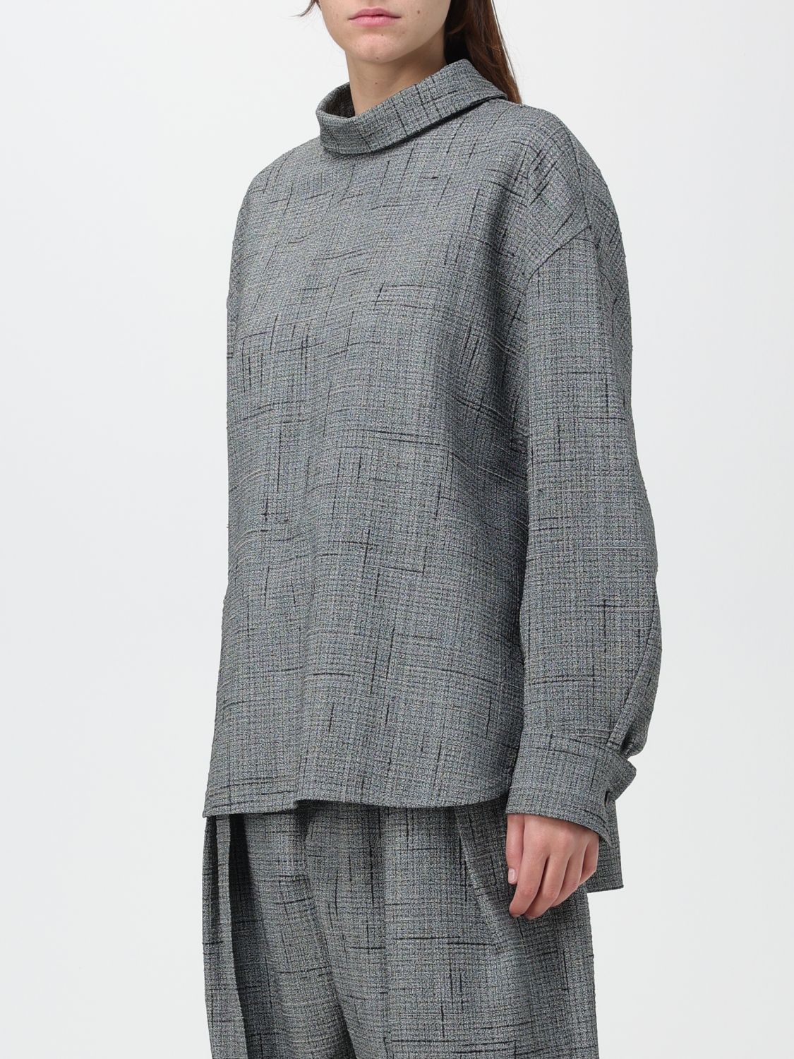 - Casual style - Relaxed fit - Viscose and silk - 3D crisscross pattern - Raised collar - Dropped shoulders - Long sleeves - Cuffs with button - Back button closure - Rear teardrop cut-out detail - Rounded hem - Made in Italy
