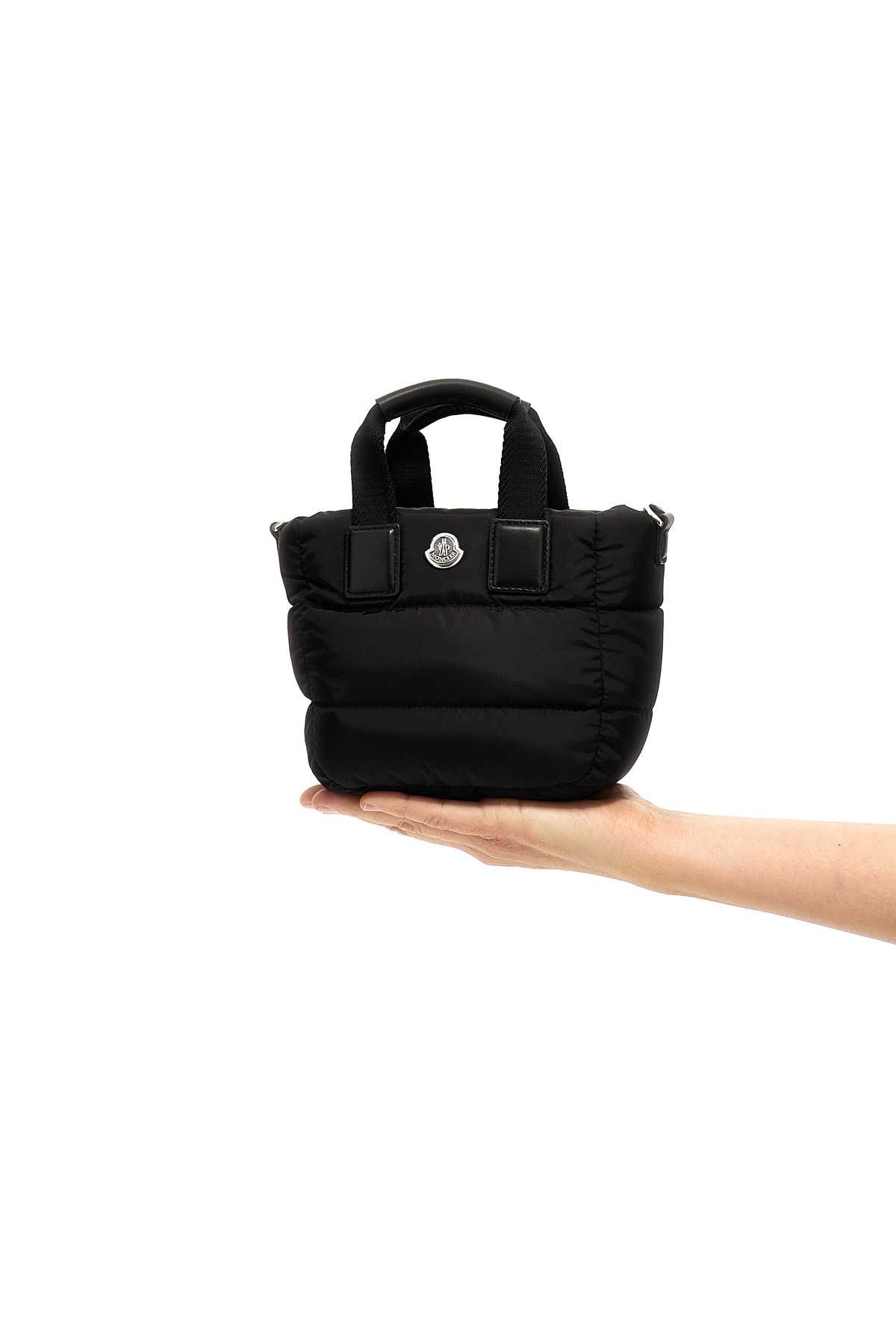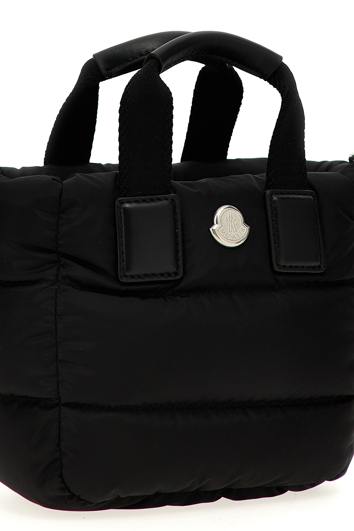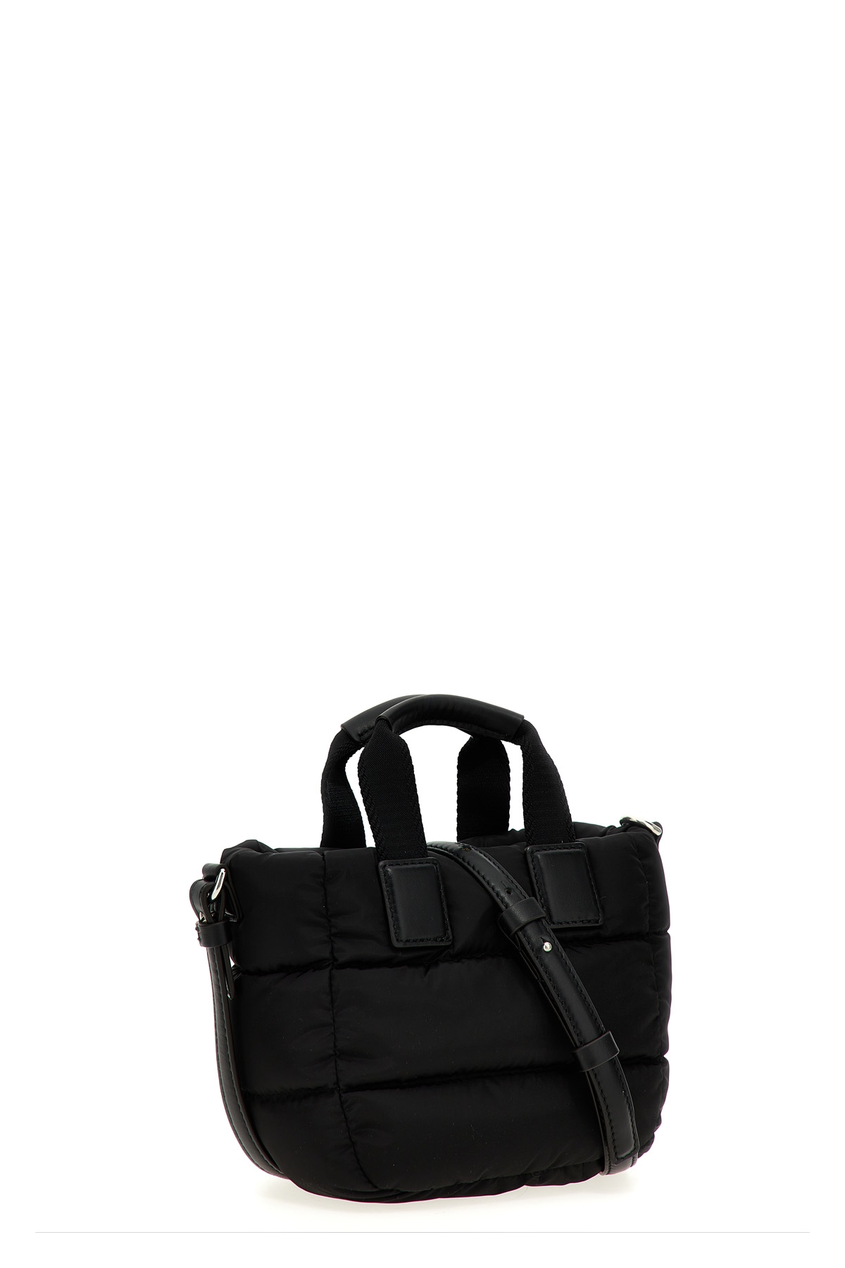 'Mini Caradoc' water-repellent padded quilted nylon handbag, front silver metal logo patch, cotton lining, double fixed handle with leather handle, zip closure, adjustable and removable leather shoulder strap.