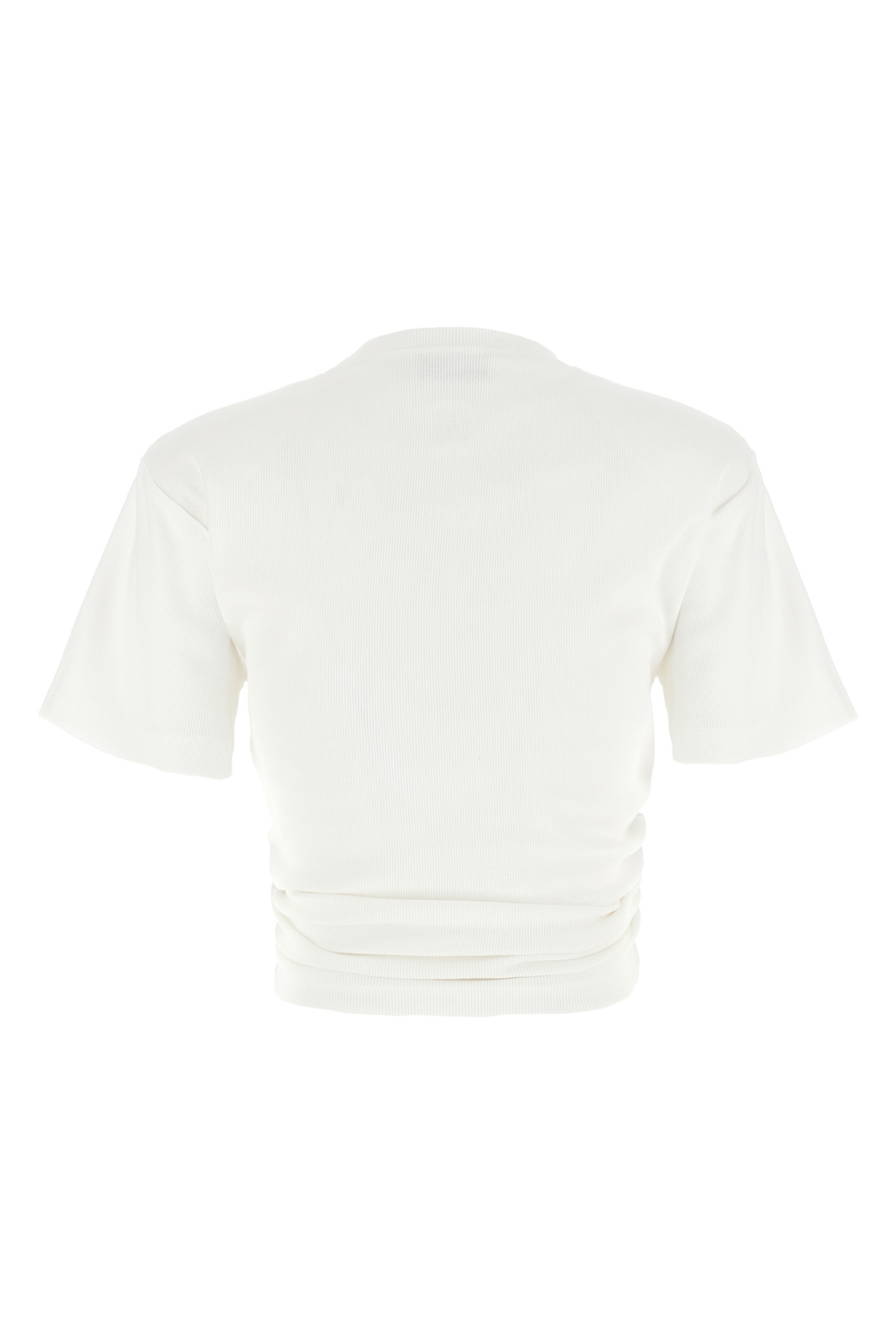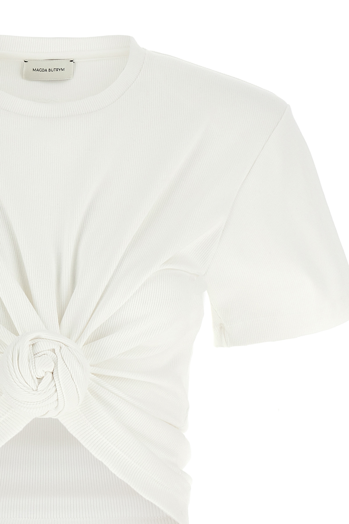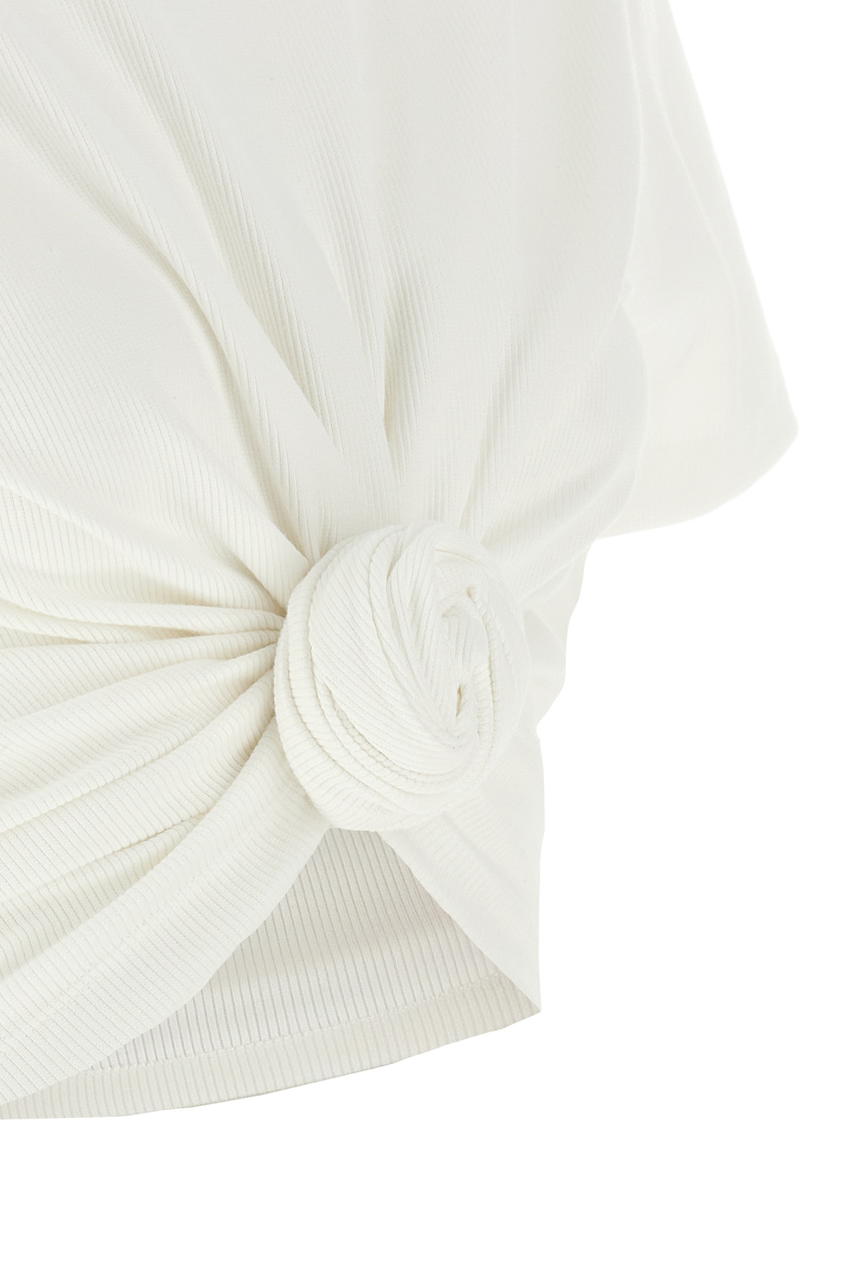 Ribbed stretch cotton T-shirt with front knot detail, crew neck, removable padded shoulder straps, short sleeves.