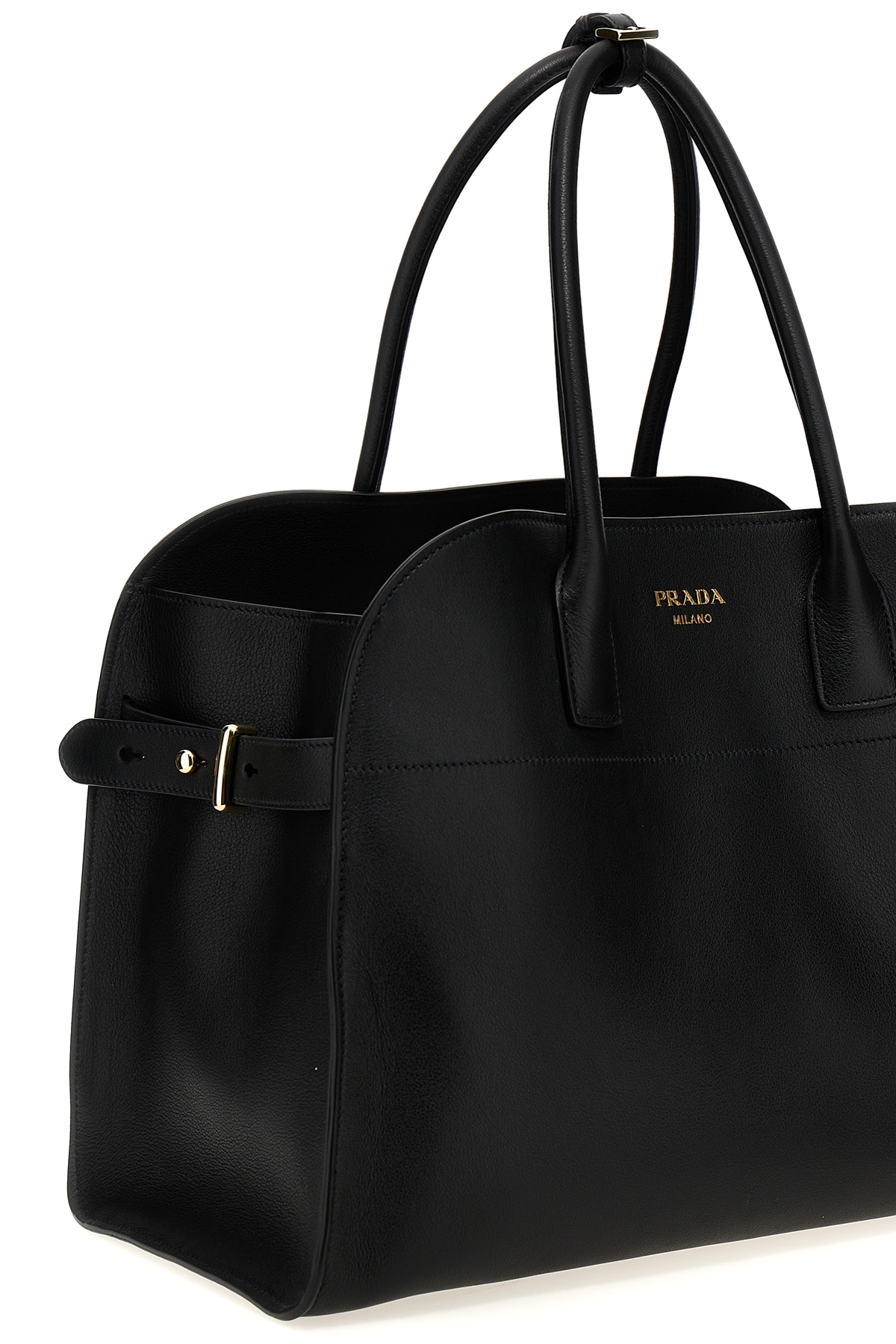 Large leather shopping bag with front embossed logo, double handle, gusset sides with straps.