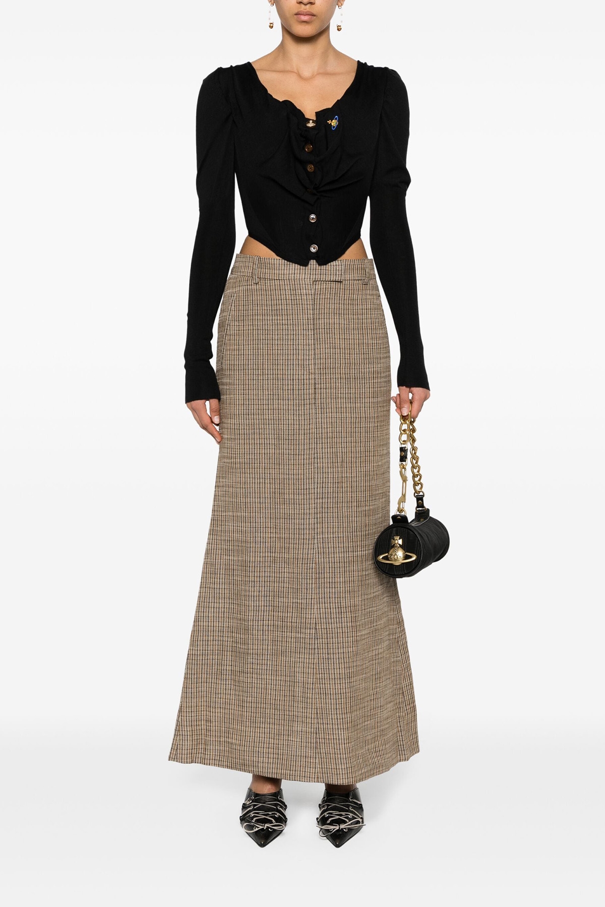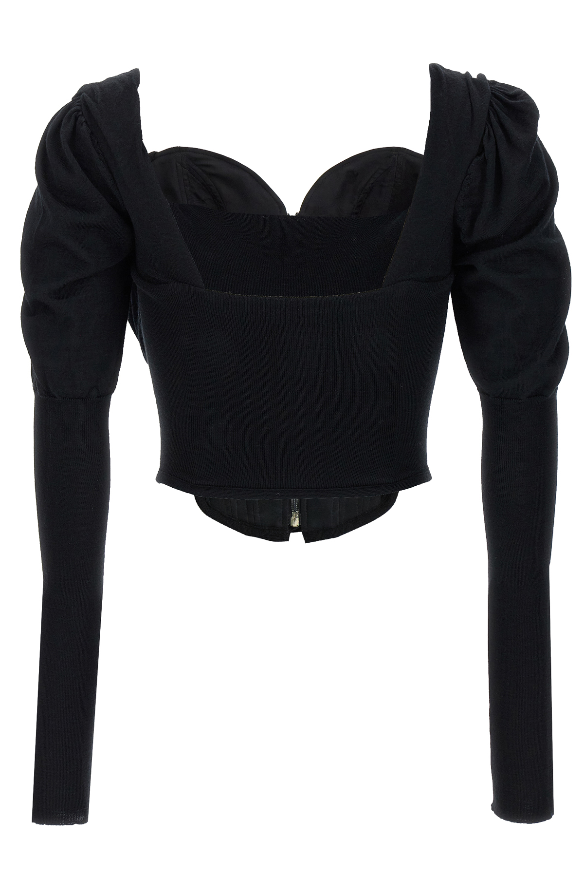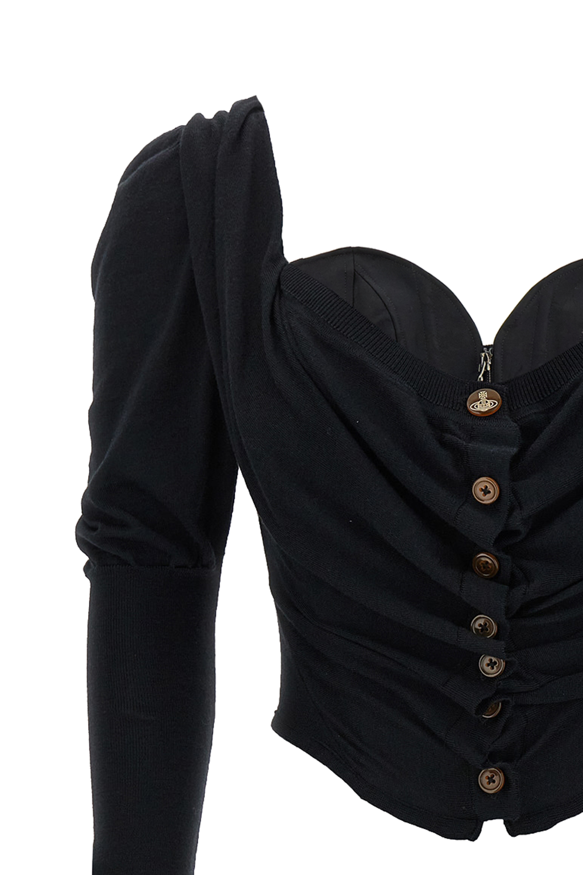 'Bea Cardi' crop and tight corset in wool and silk blend, boned bodice, front button and zip closure, long sleeves.