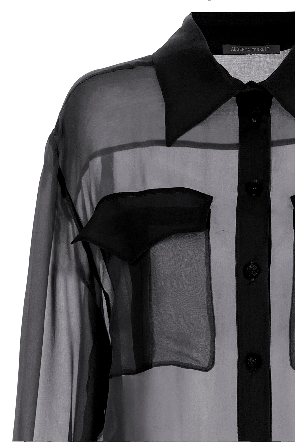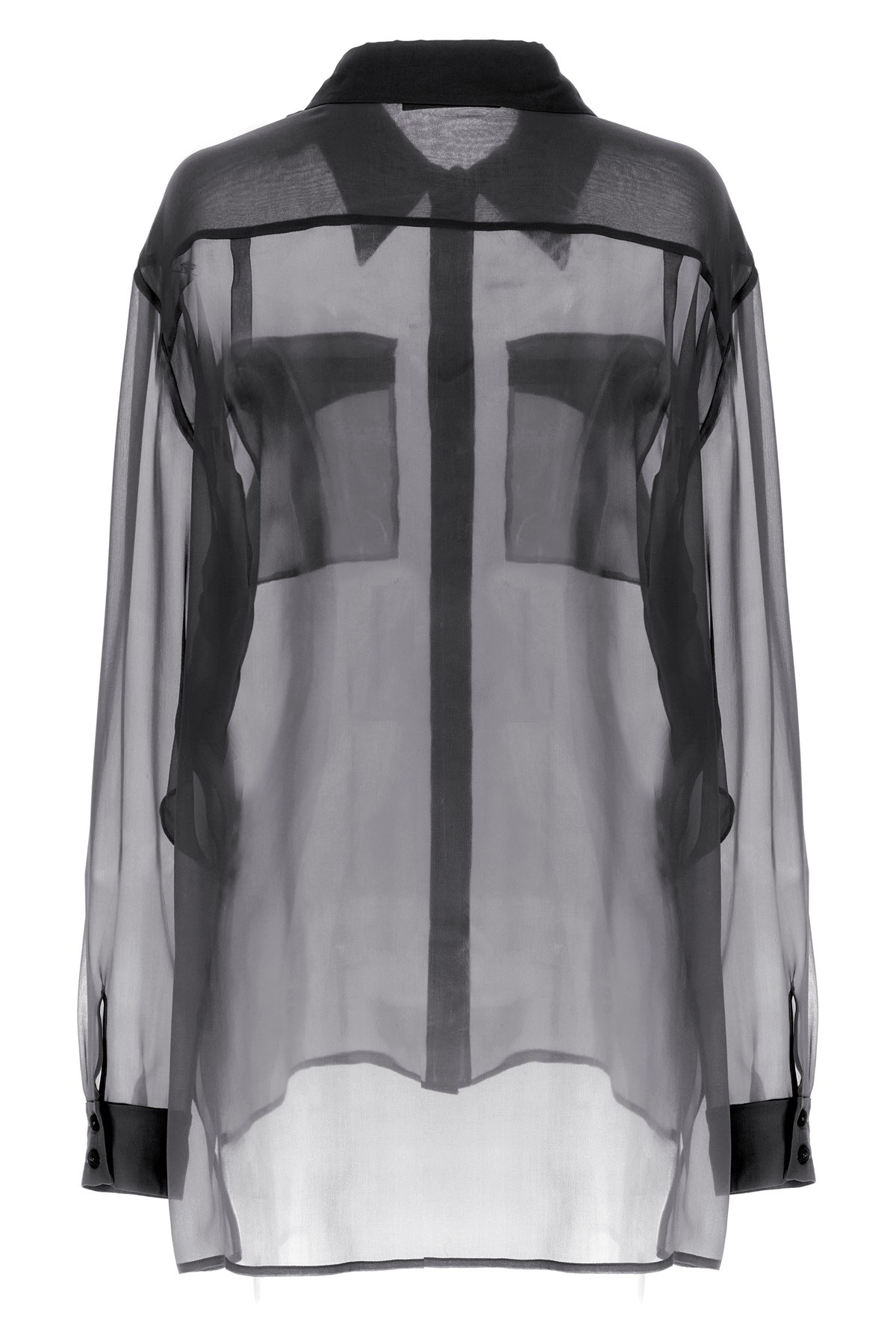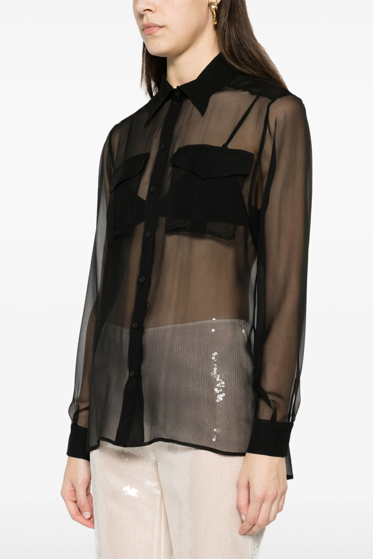 Transparent silk chiffon shirt, front pockets, button closure, long cuffed sleeves.