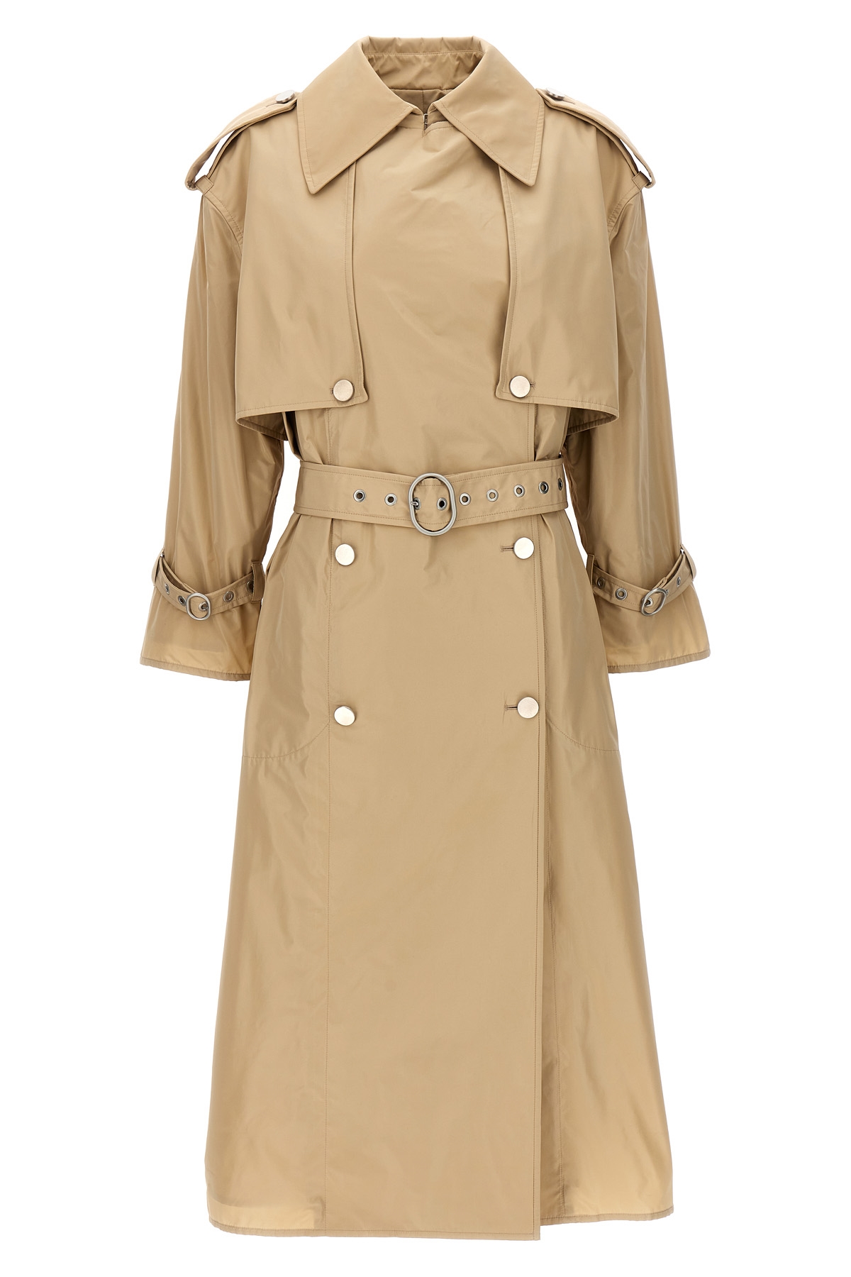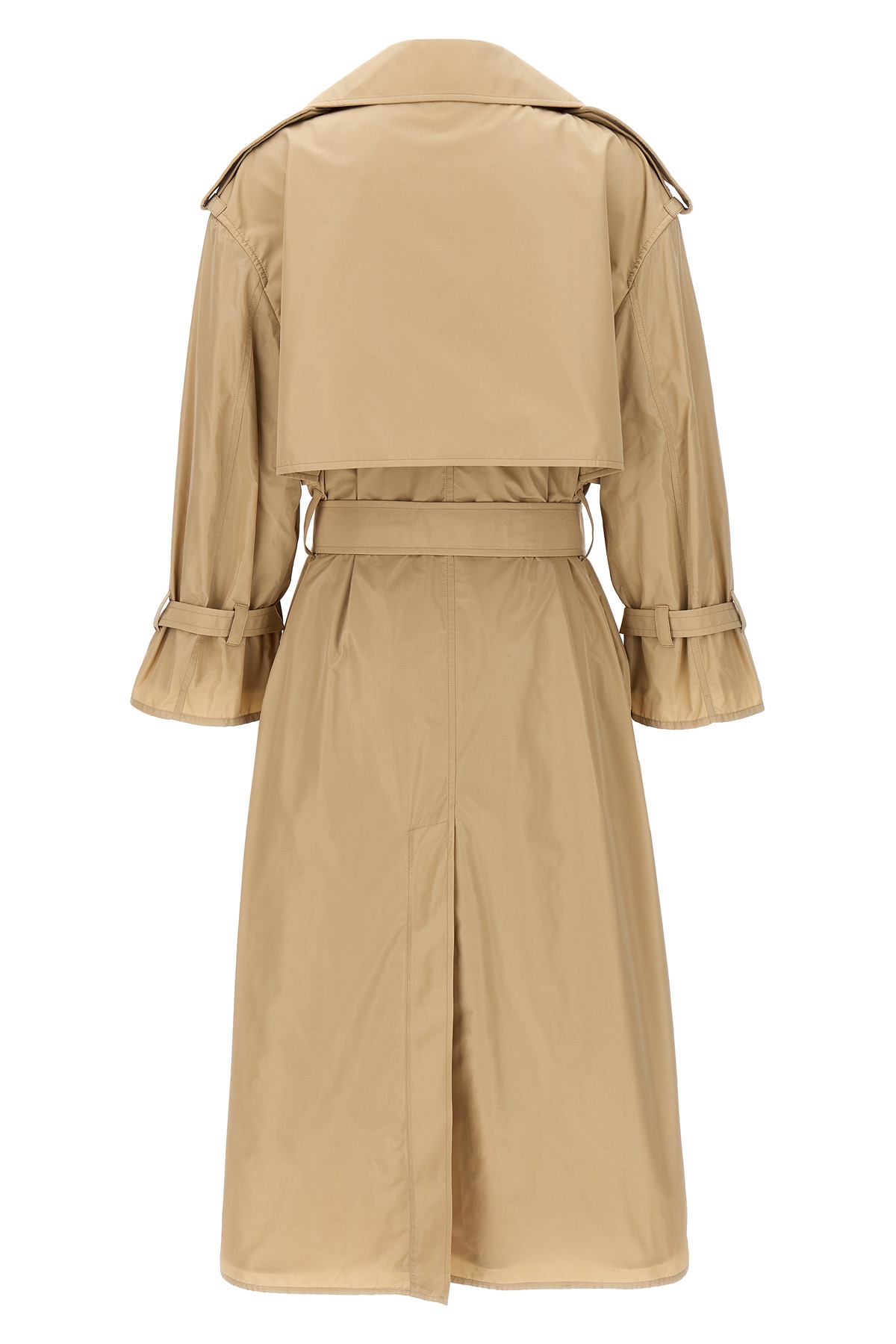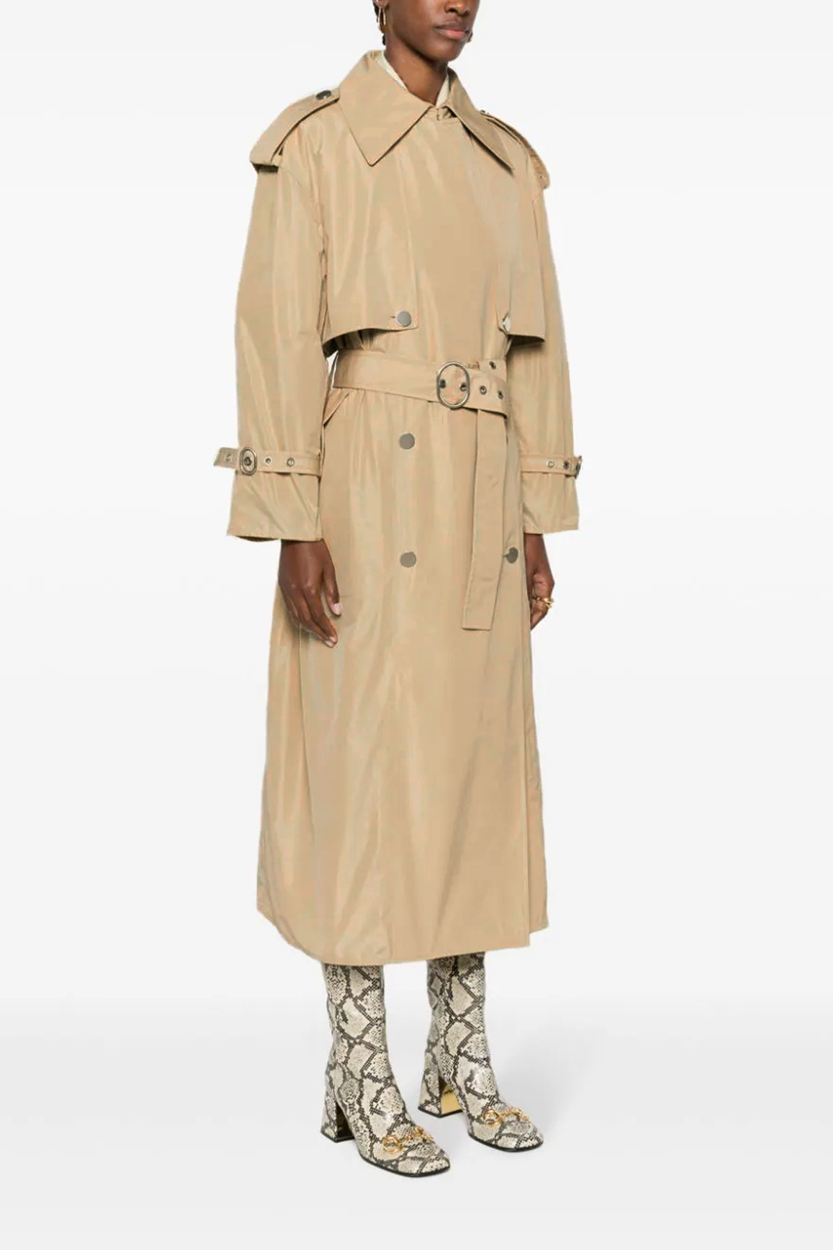 Oversize double-breasted nylon trench coat with button closure, pockets, long sleeves.