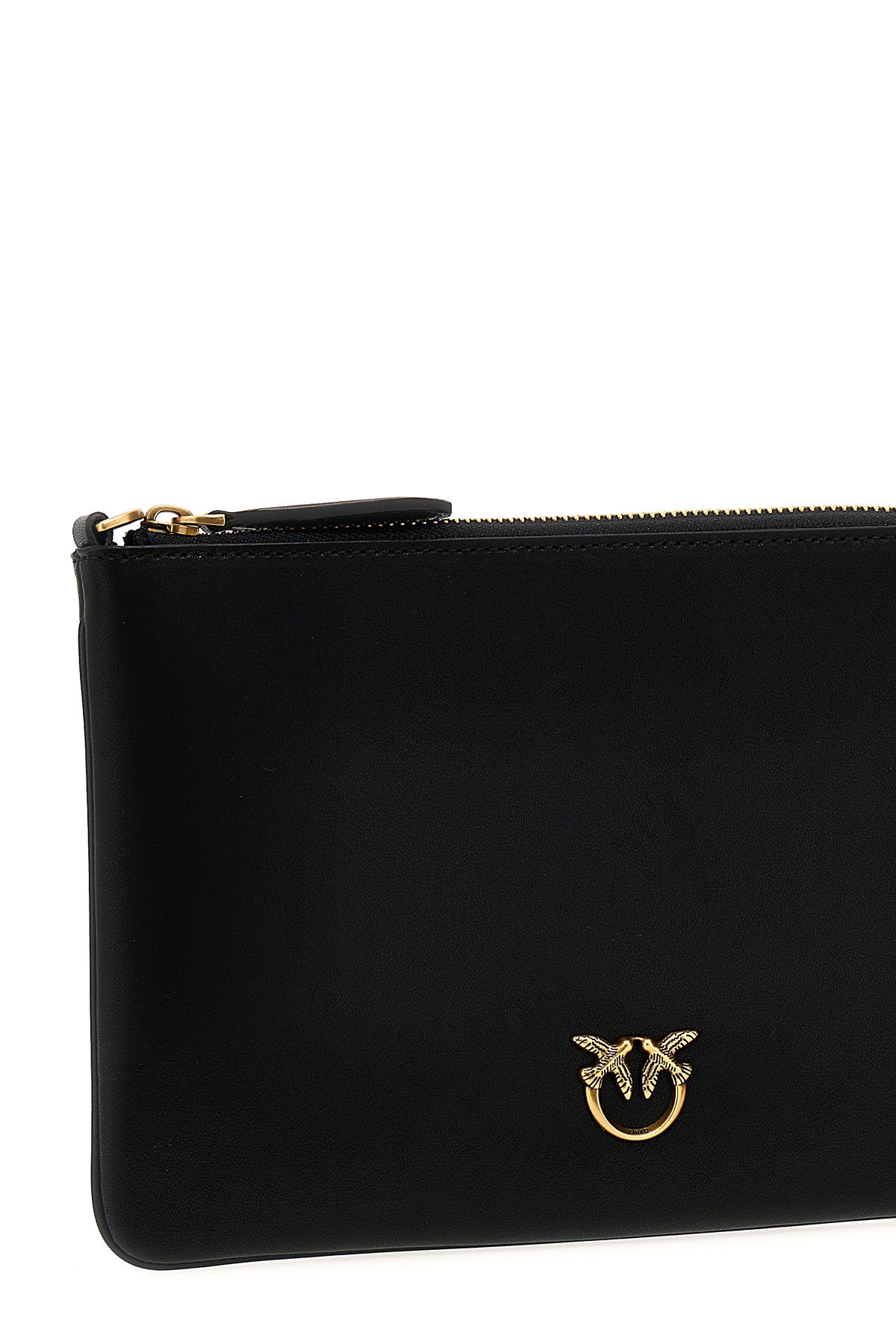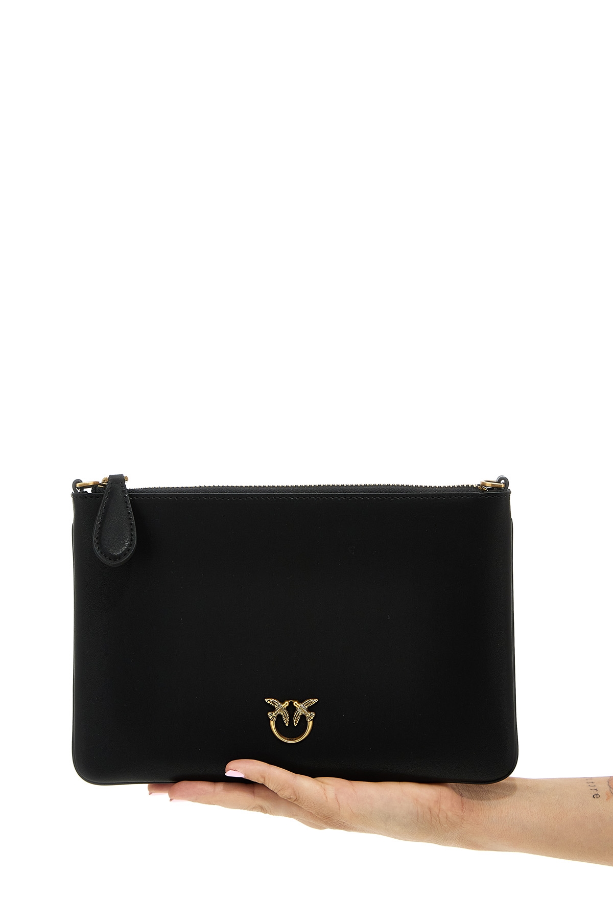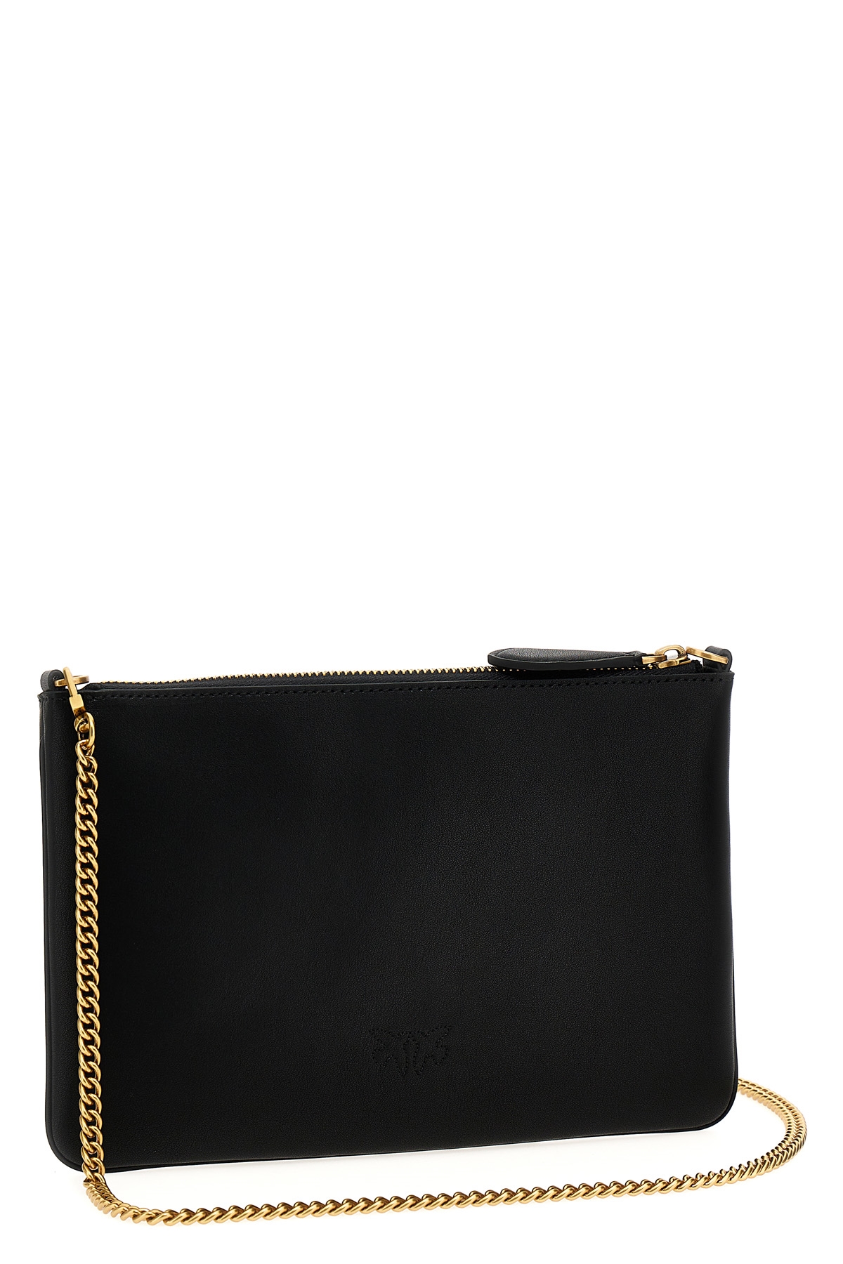 Flat' leather clutch bag with zip closure and a removable chain shoulder strap.