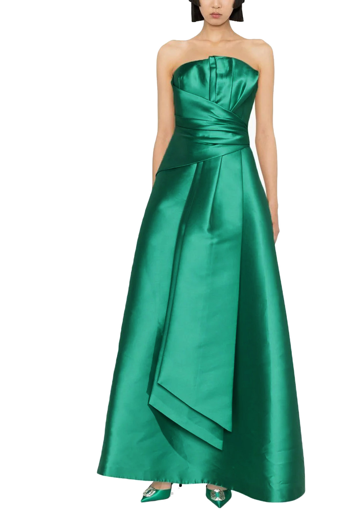 Strapless mikado maxi dress, with draped bustier, wide full skirt, long drape detail on the skirt, concealed zip at the side, inner bones and hook closure.