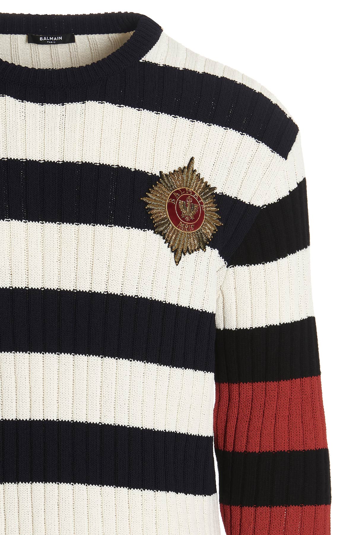 Striped cotton sweater with maxi ribbed detailing embellished with chest embroidery, a crewneck and destroyed details.