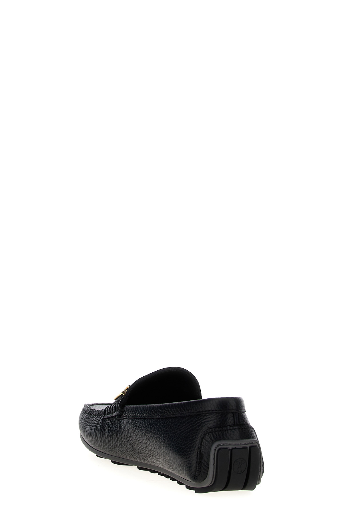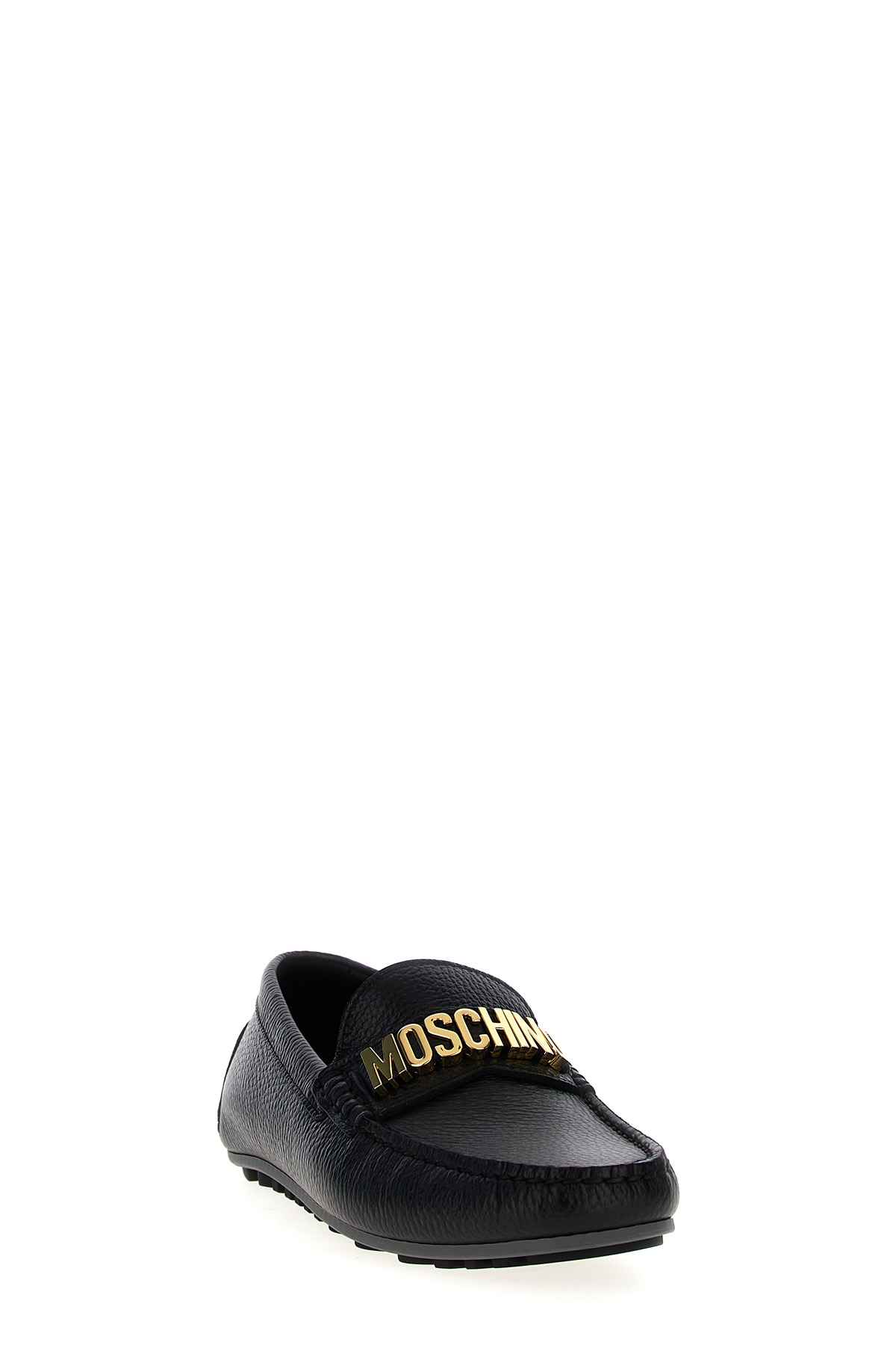 'Lettering' hammered leather loafers with gold logo detail, rubber sole.