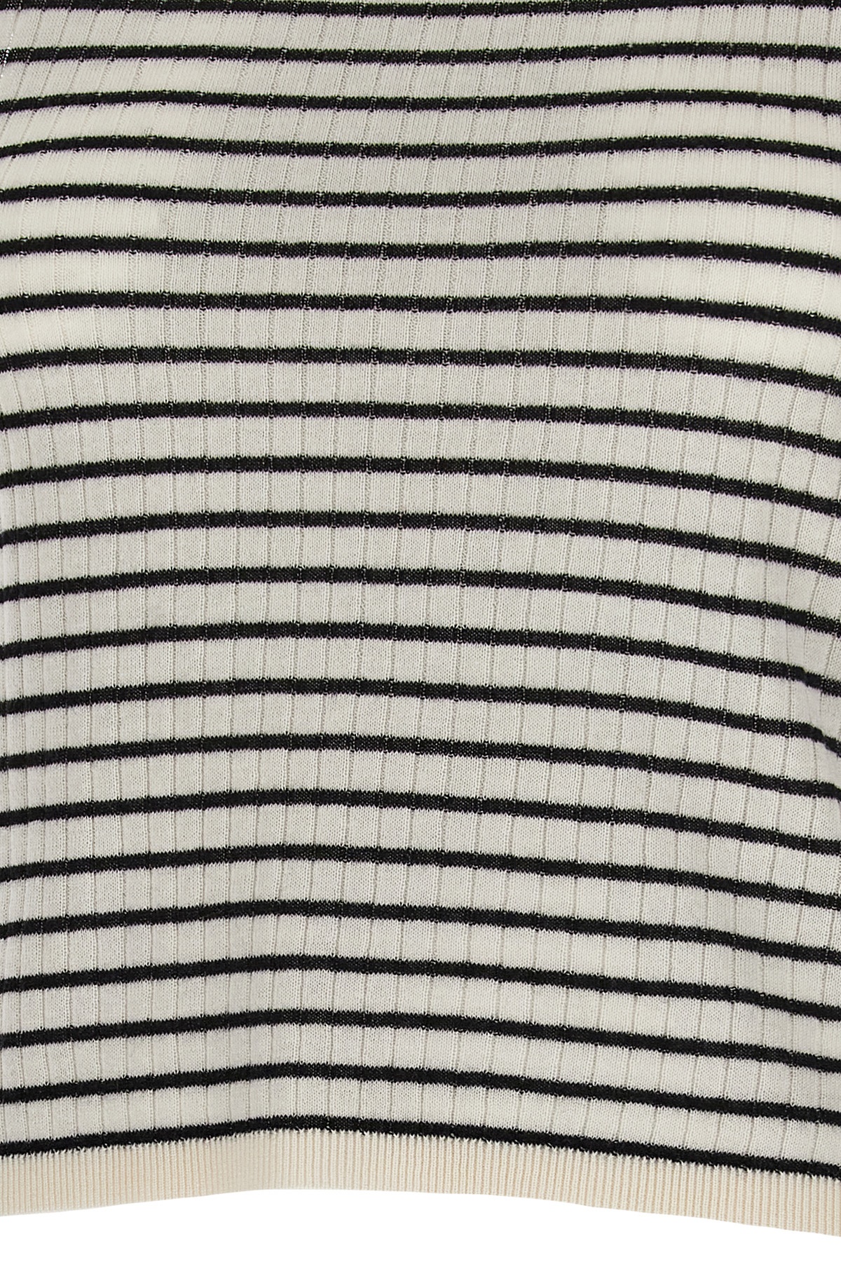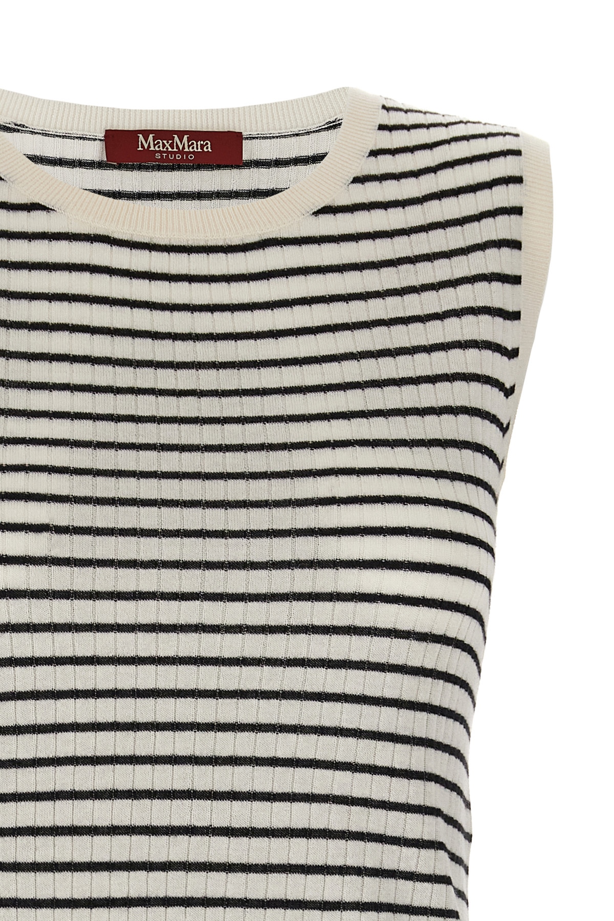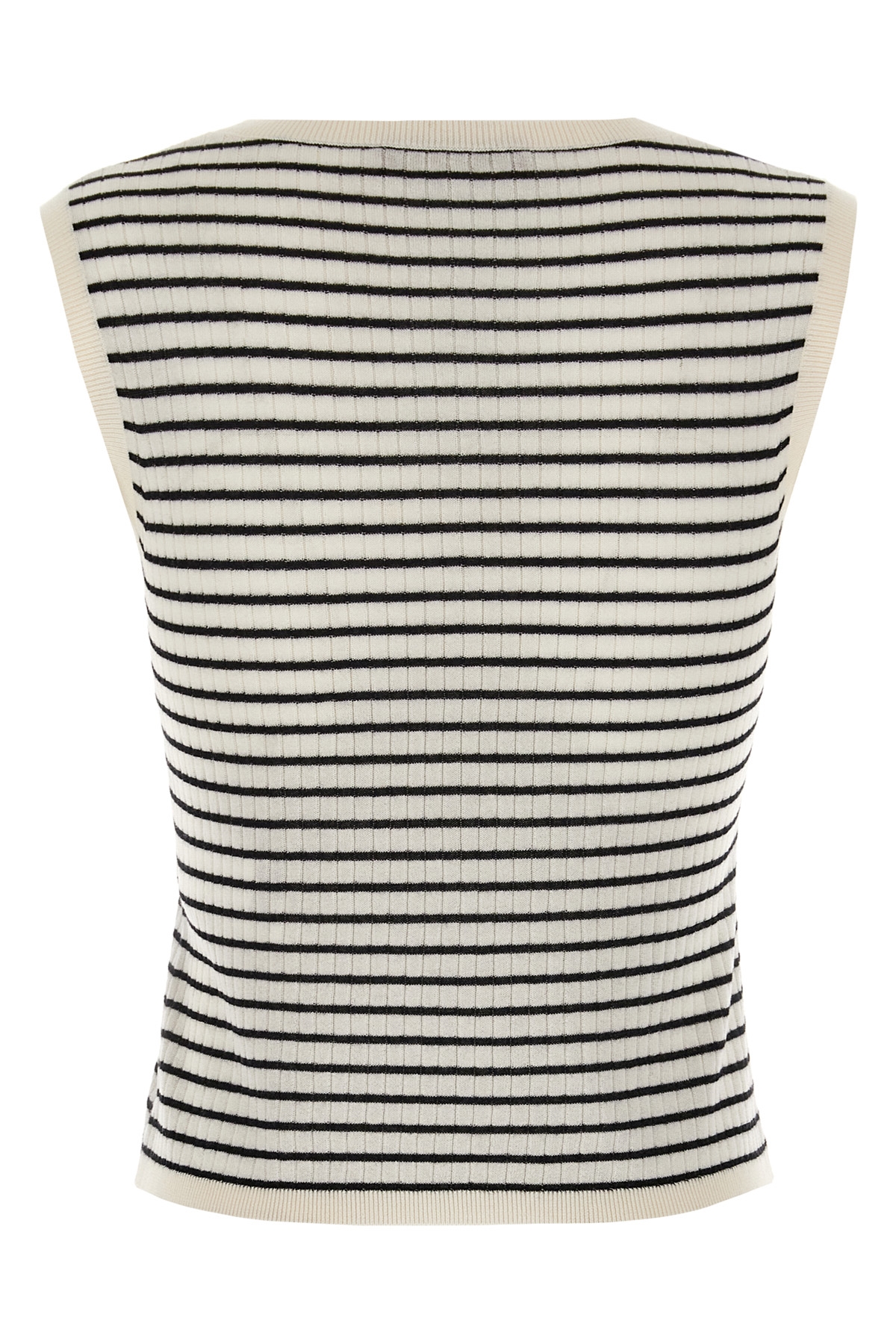 'Valeria' ribbed knit top with two-tone stripes, and sleeveless round neckline.