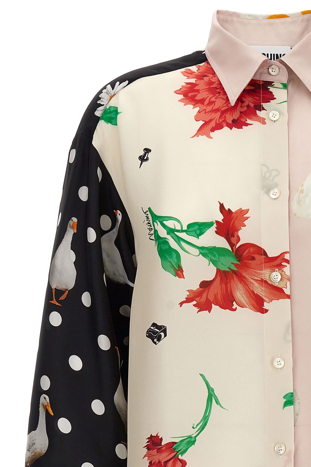 Silk shirt with all-over patchwork print, front button closure, long cuffed sleeves.