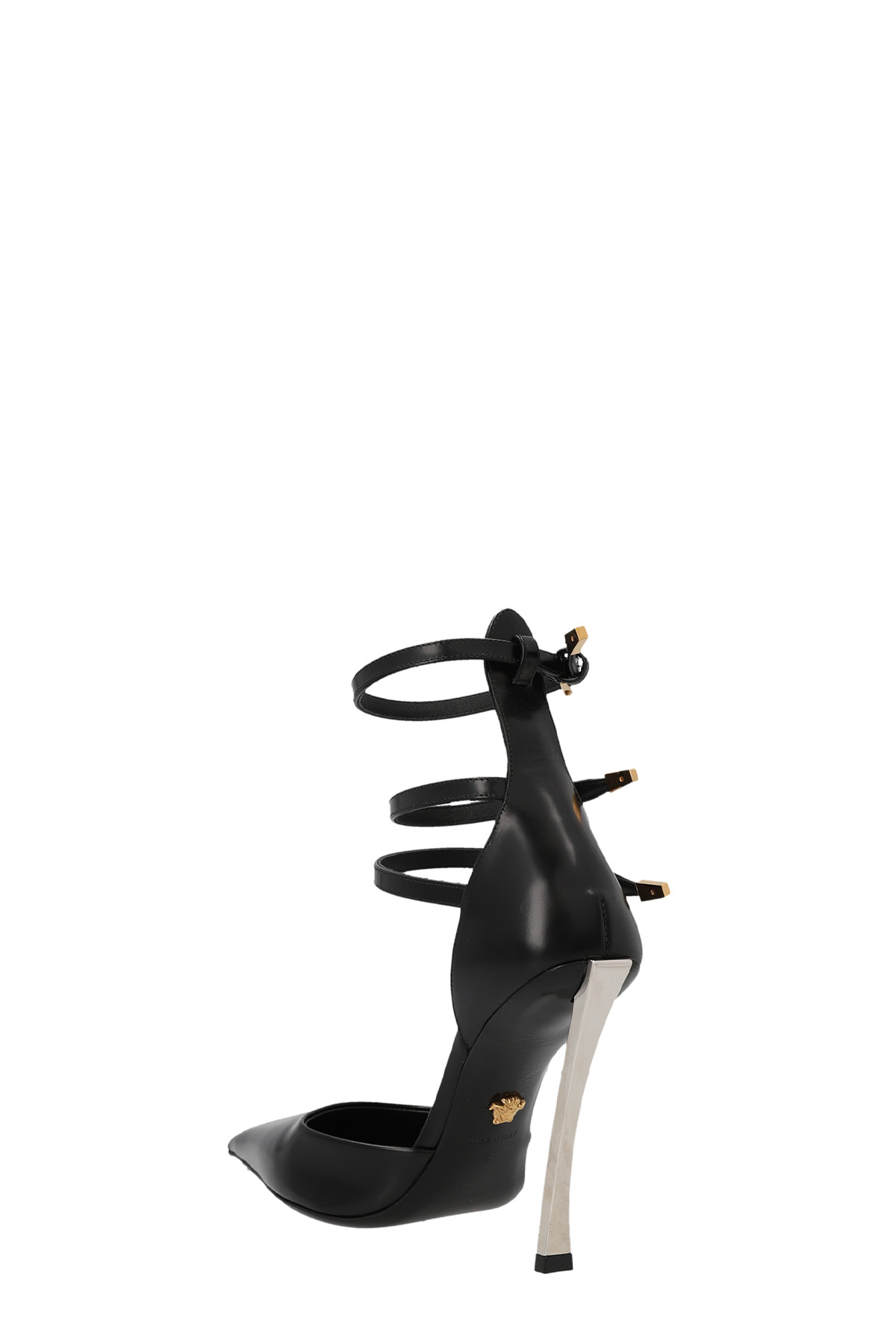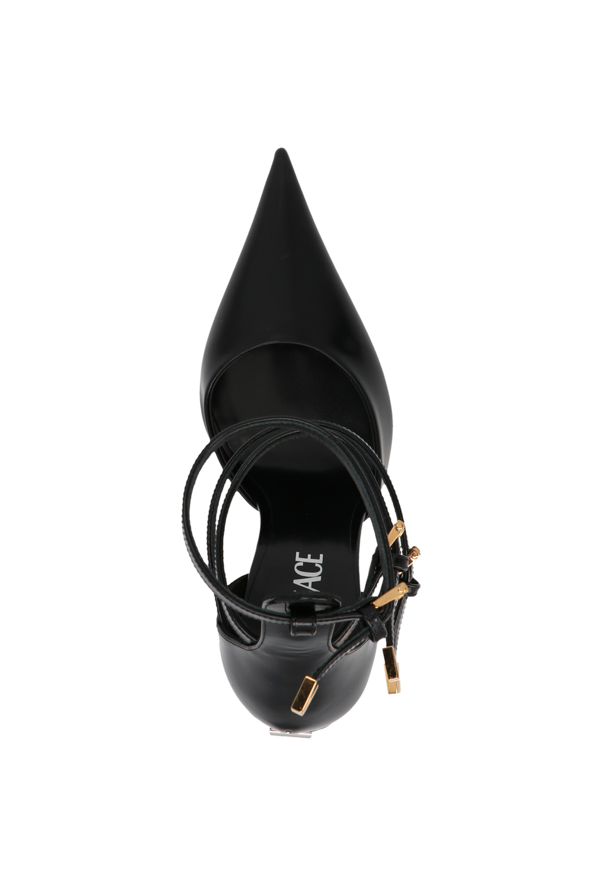 Pin-Point' leather pumps featuring high heel and silver metal plexiglass, pointed style, double strap with front buckle and gold metal V-elements.e.