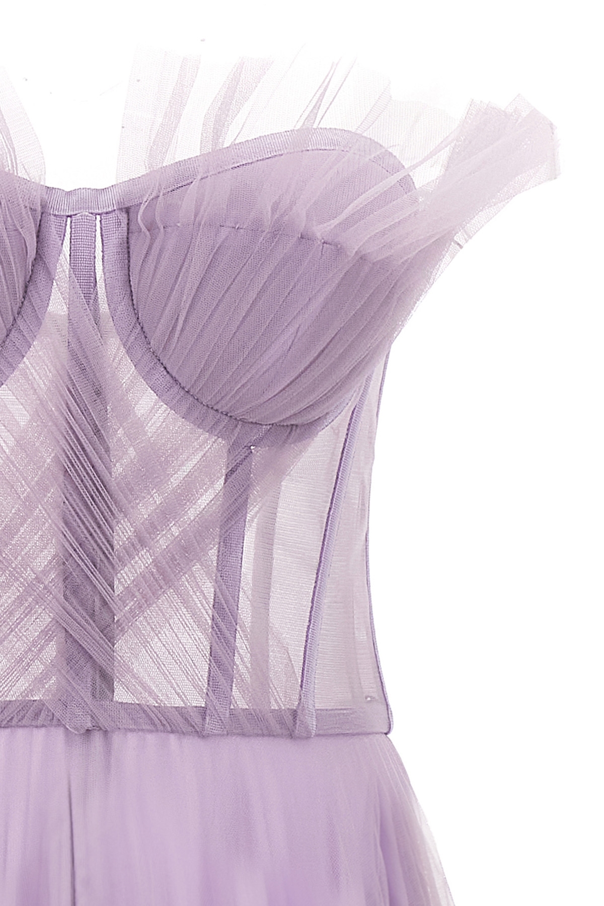 Strapless long dress in tulle with corset-style top with darting, and wide skirt. Concealed zipper closure.