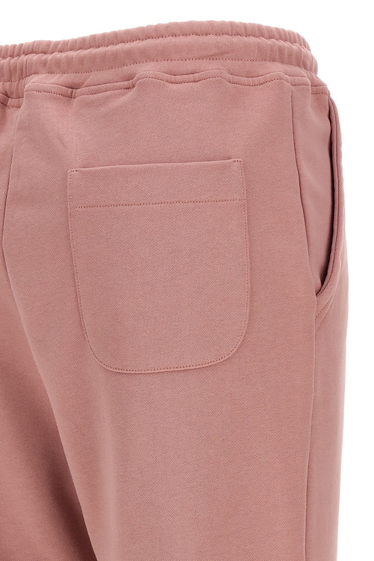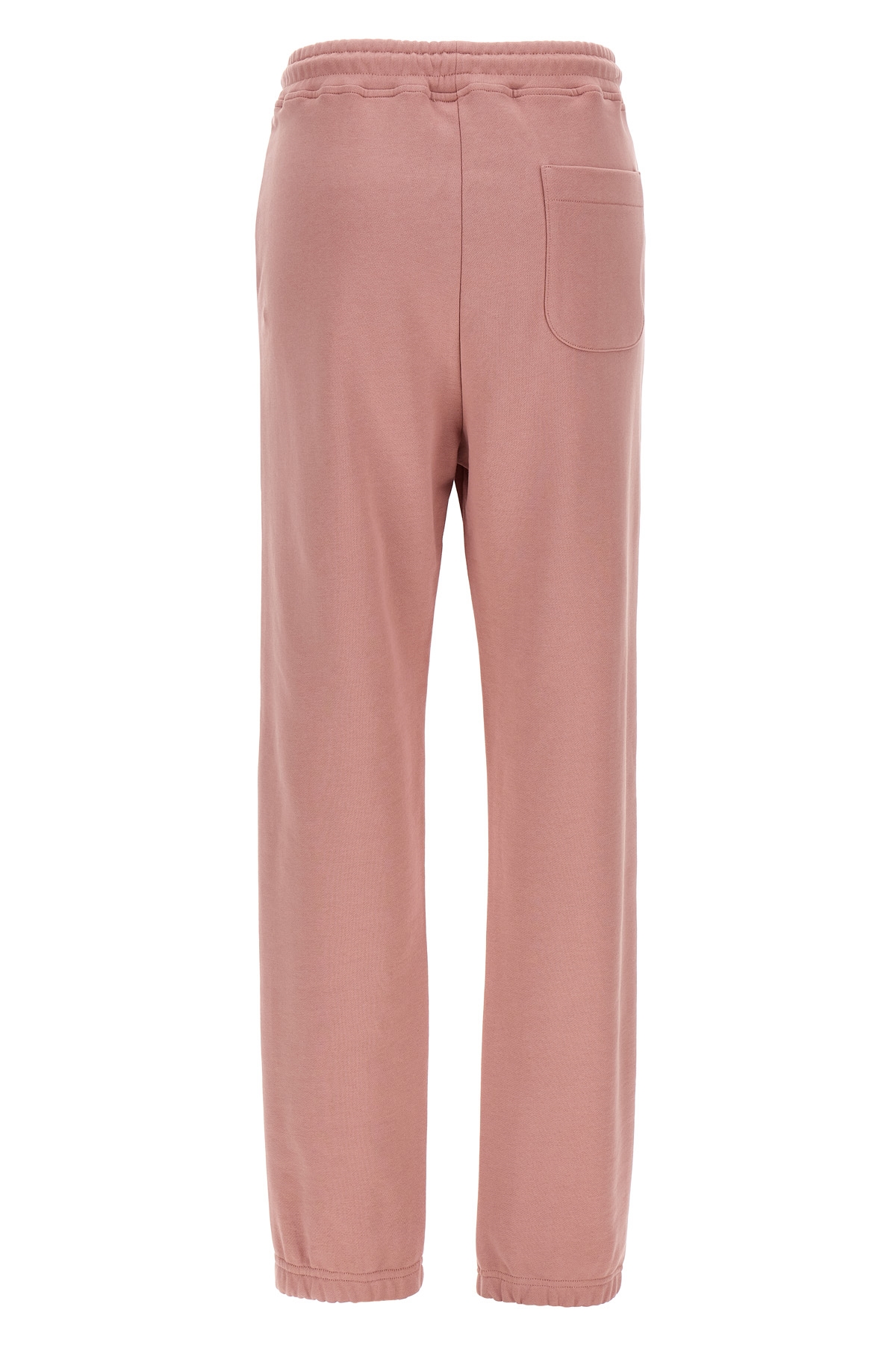 Cotton fleece pants with elastic waistband and drawstring, front logo print, side pockets, elastic ankle hem.
