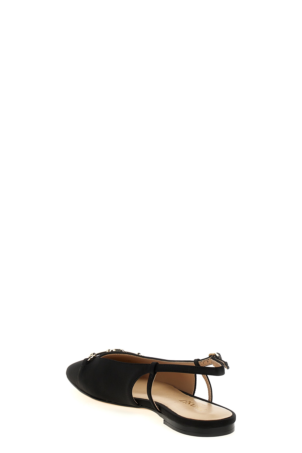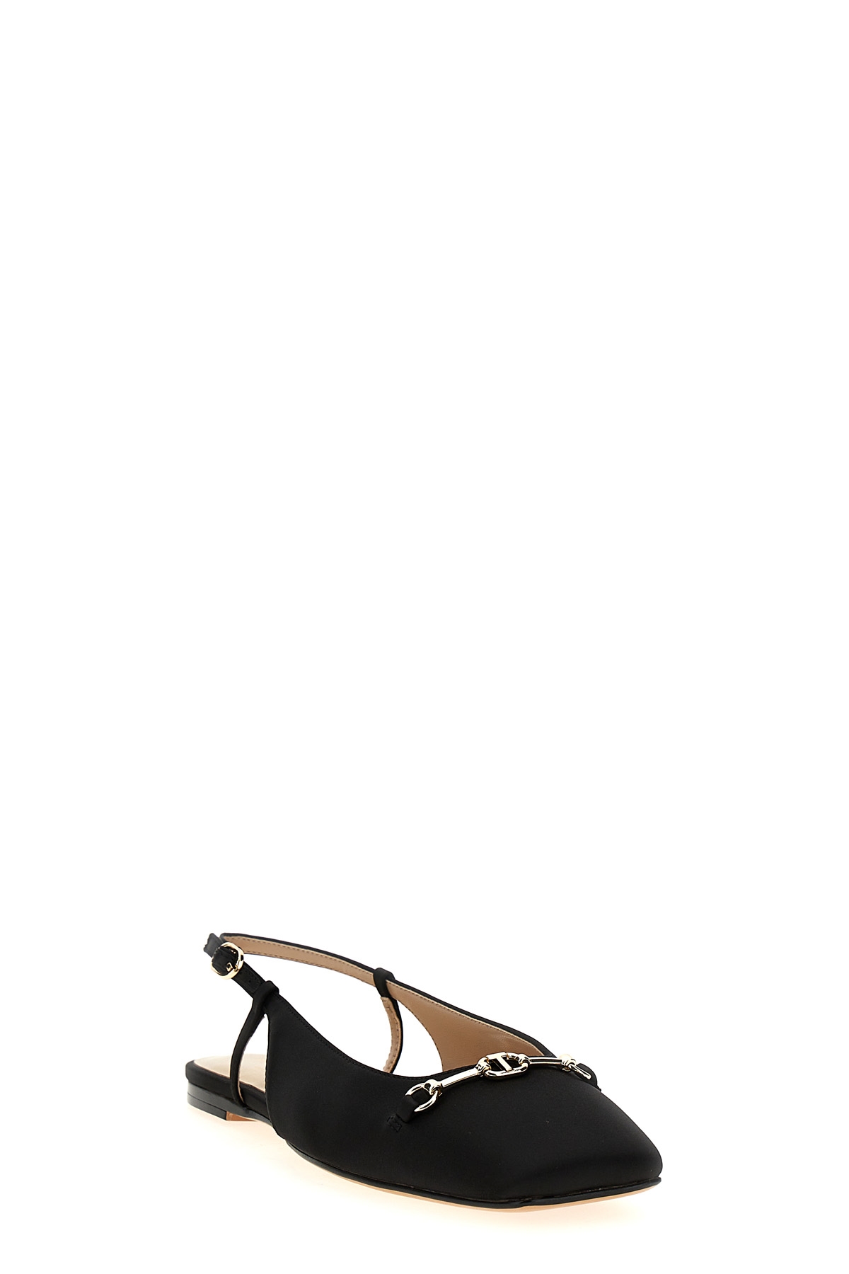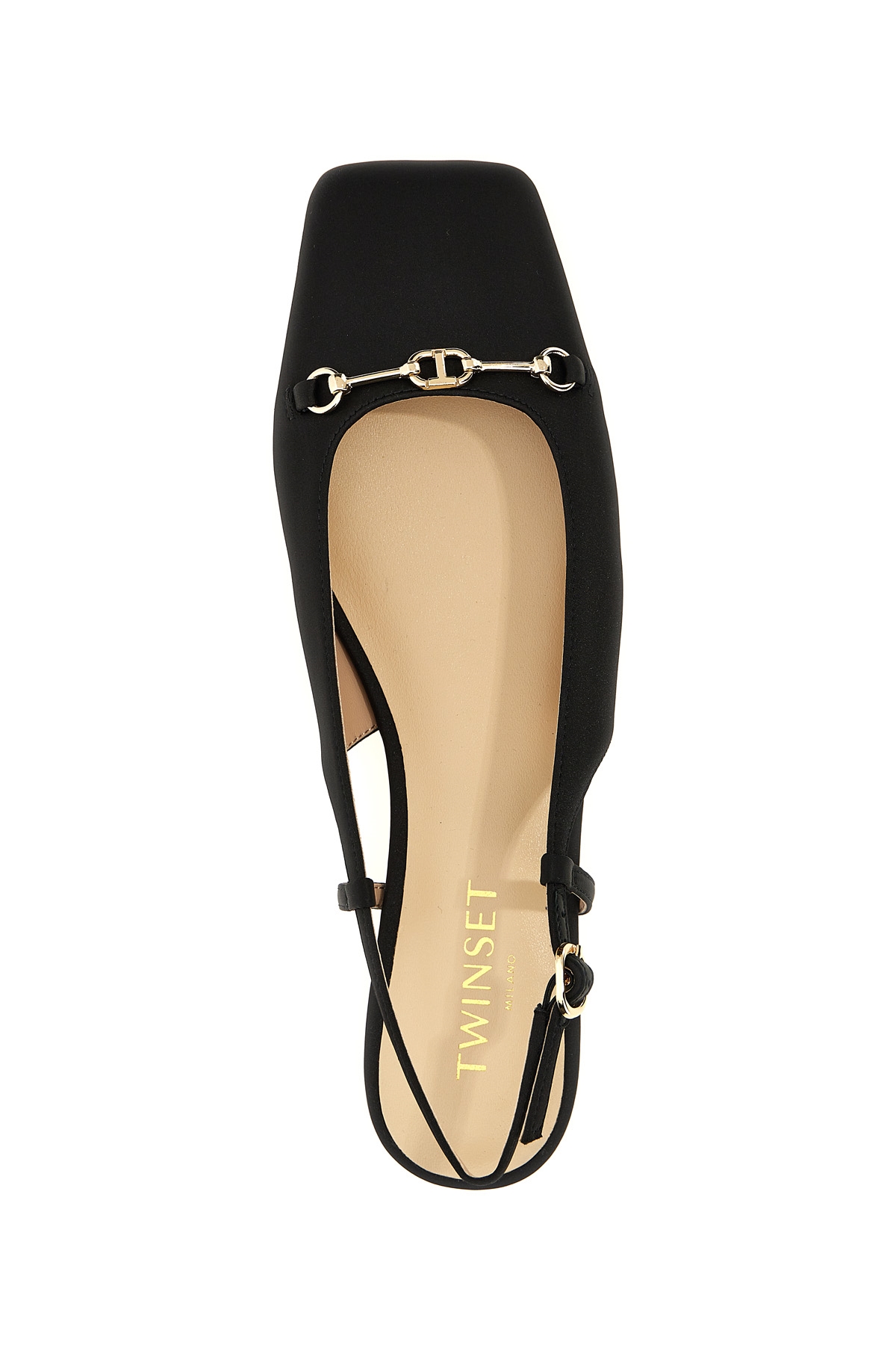 Satin-effect fabric slingbacks with metal Oval T detail at the front clamp, square toe, adjustable strap, rubber sole.