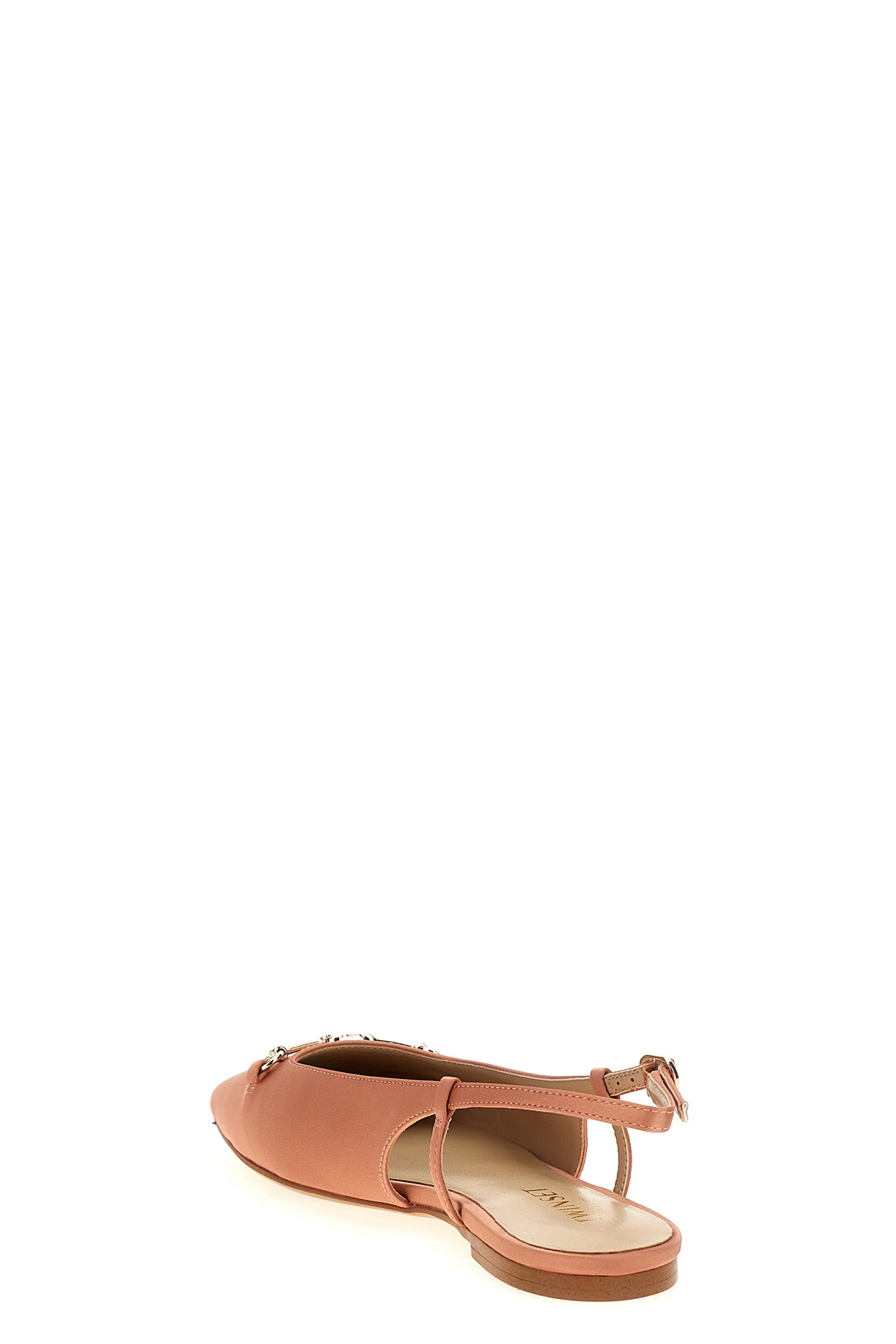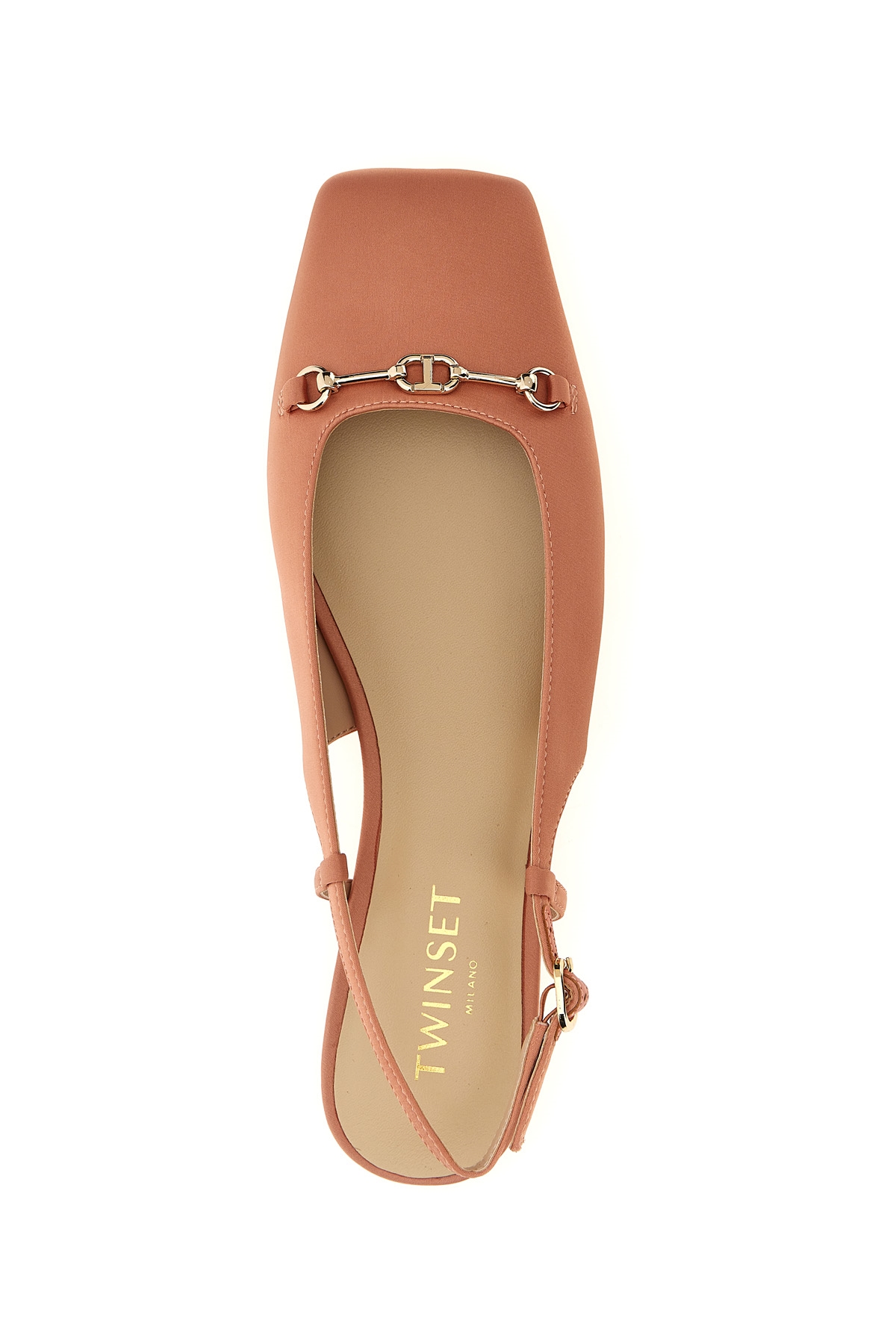 Satin-effect fabric slingbacks with metal Oval T detail at the front clamp, square toe, adjustable strap, rubber sole.