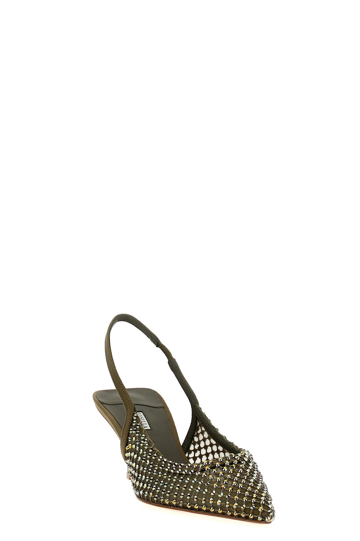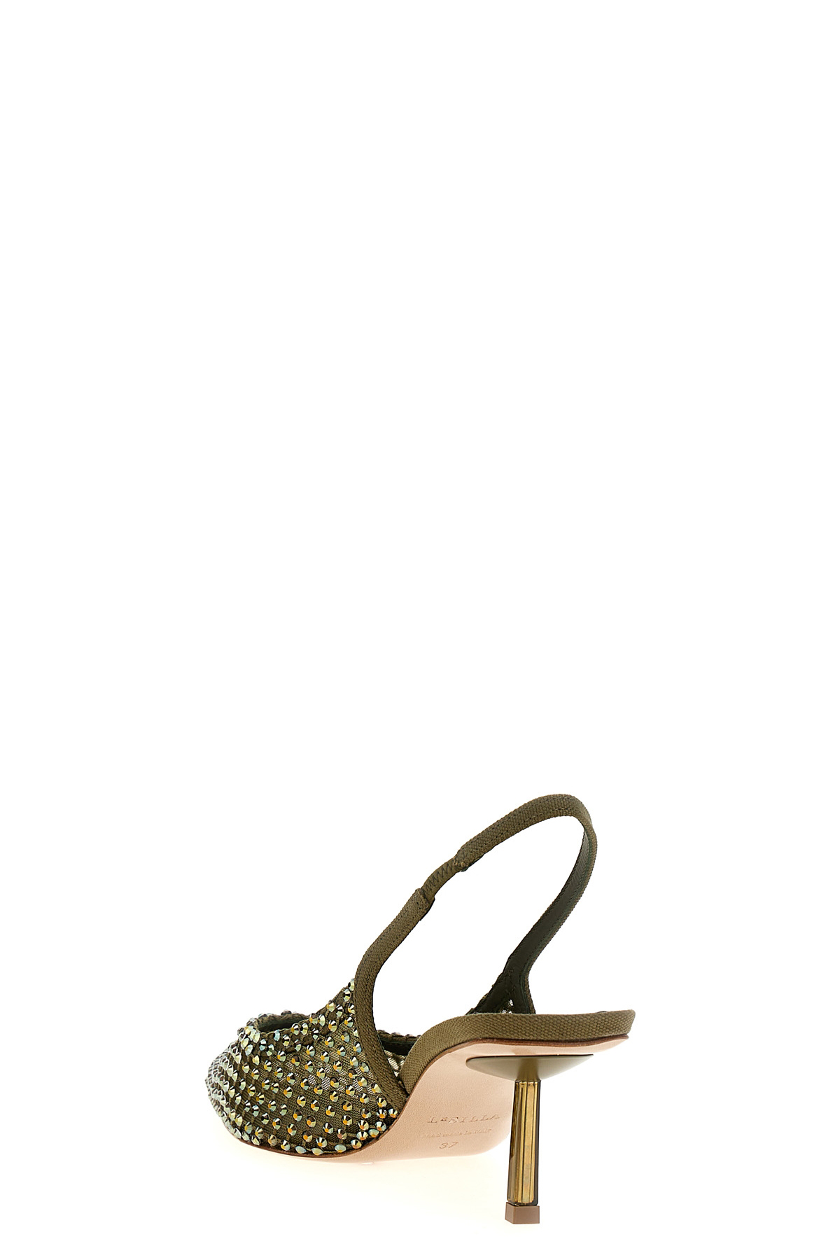 'Gilda' leather slingbacks with green stretch knit finished with crystals, stiletto heels.