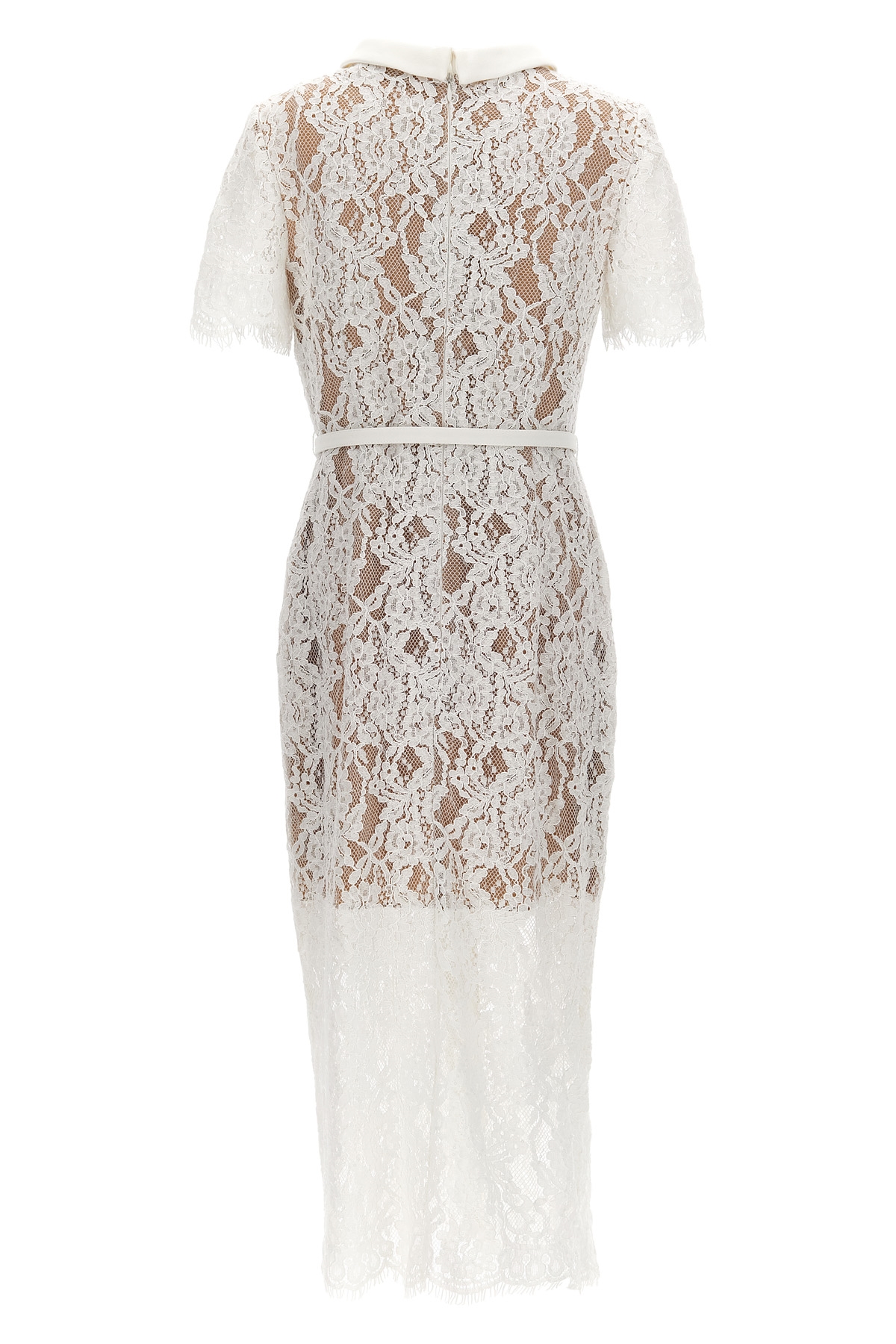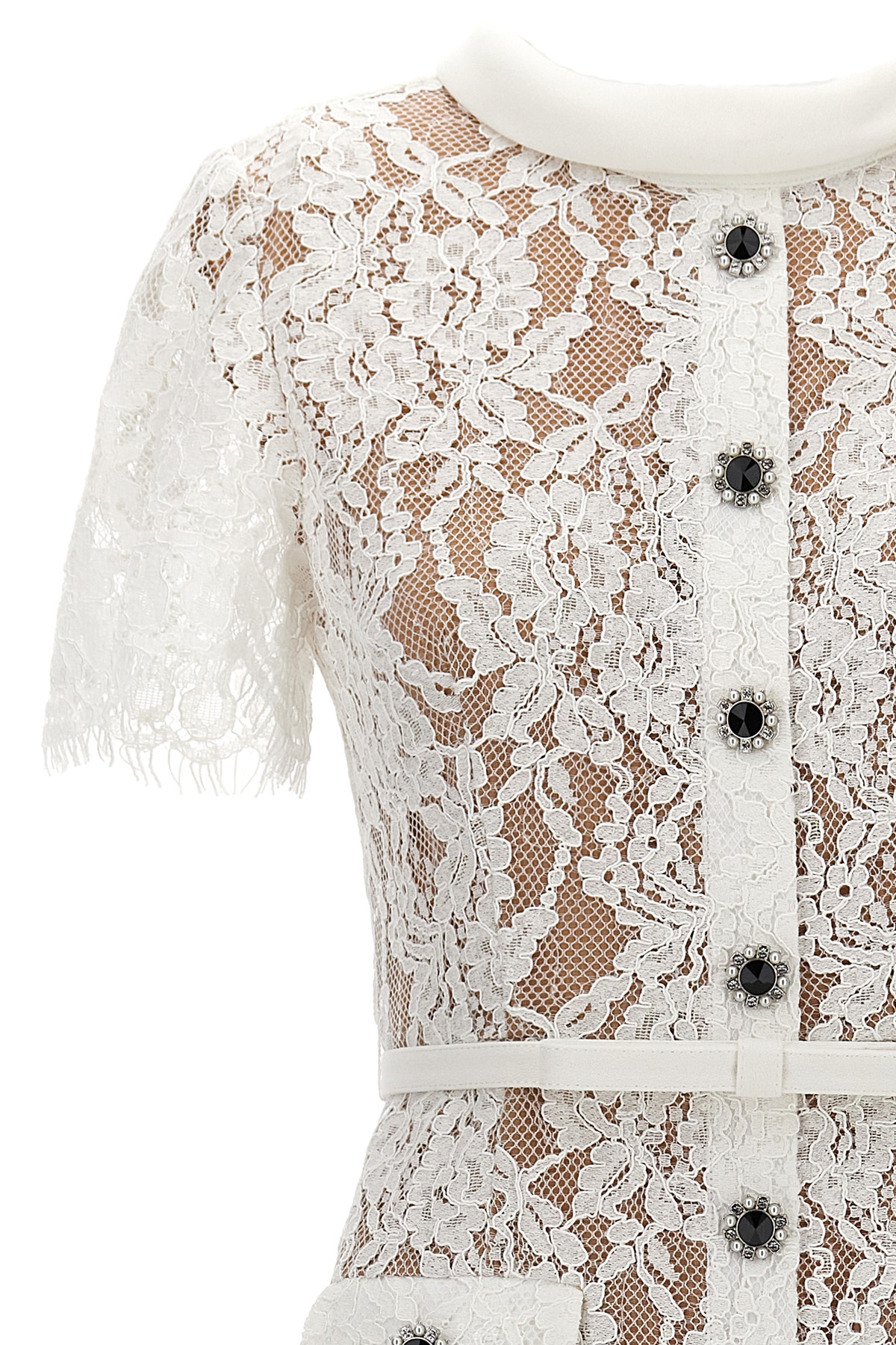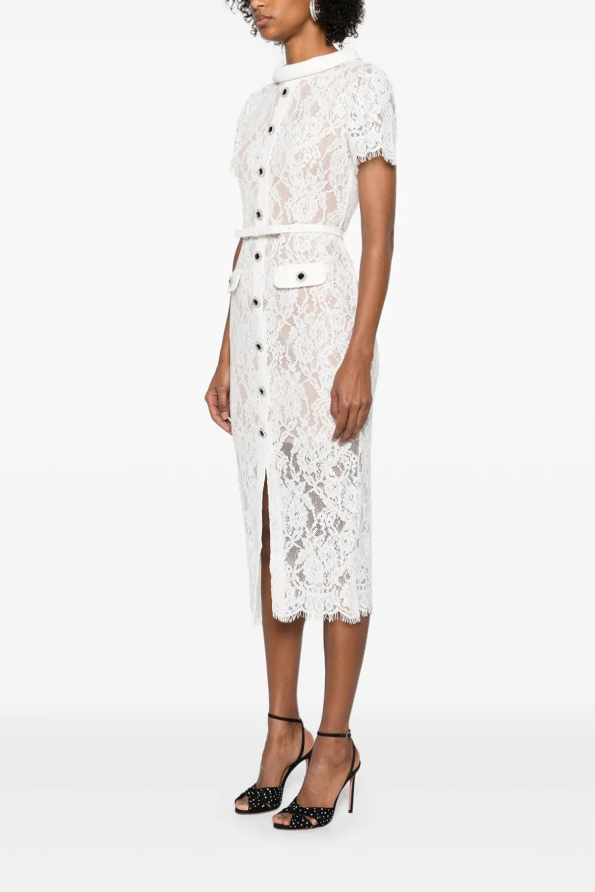 White Lace Button Midi' lace dress with contrast lining, crystal applique and jewel trompe l'oeil buttons at the front, satin high neck, short sleeves, back zip closure, front split, adjustable and removable belt.