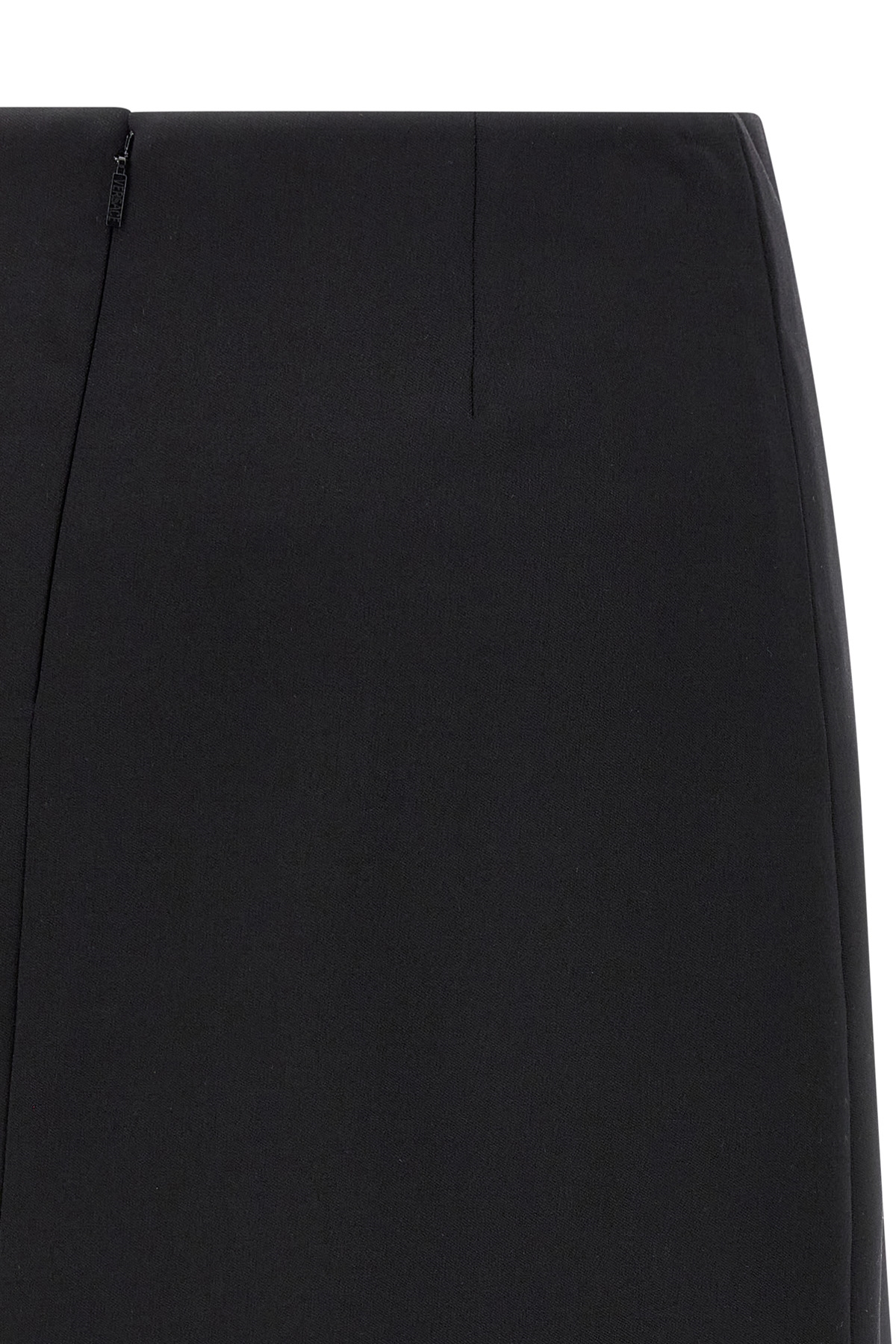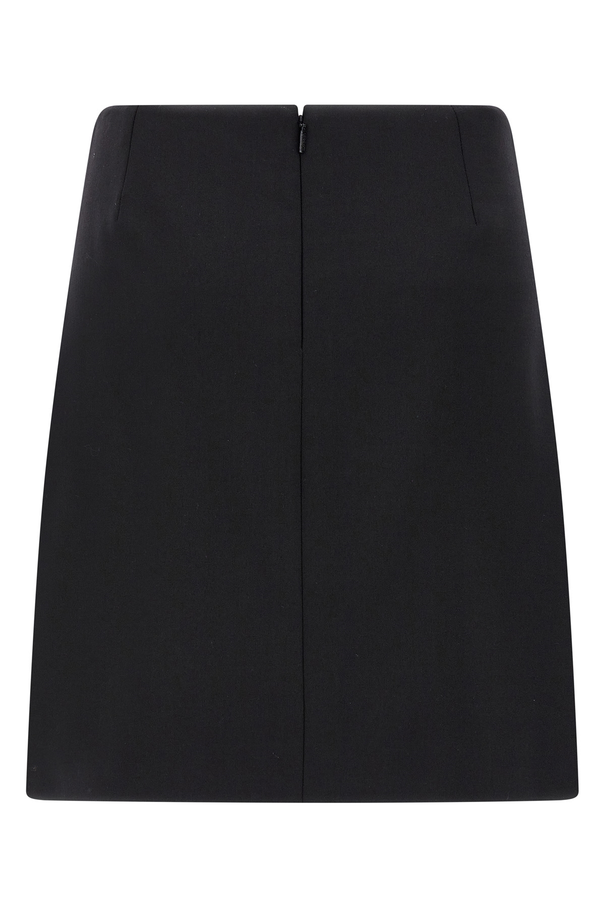 Flared mini skirt in stretch grain de poudre wool with metal 'Safety Pin' detail, slit and back zip closure.