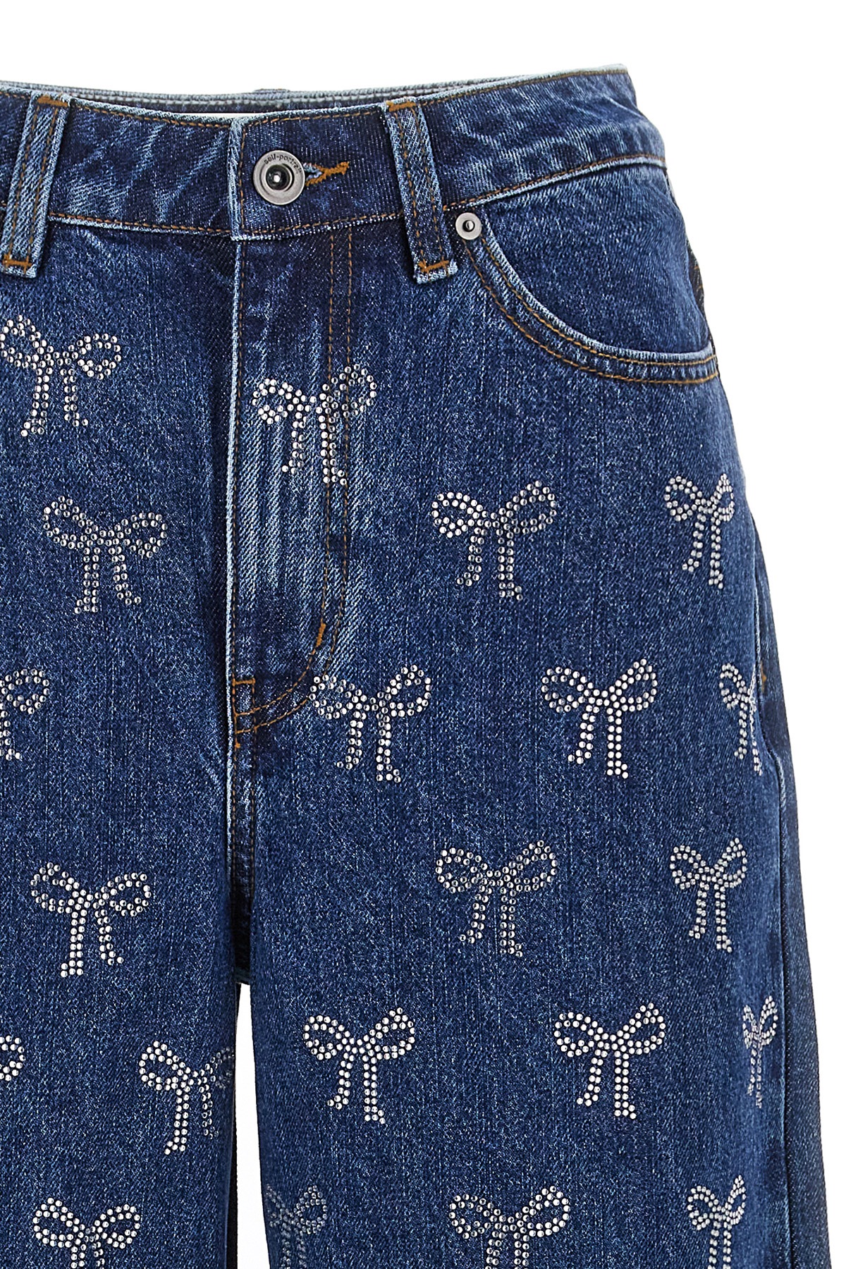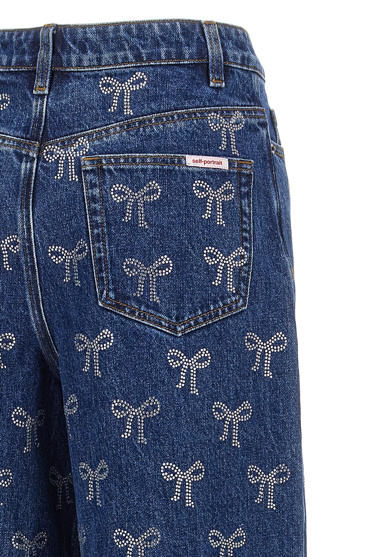 'Rhinestone Bow' cotton denim jeans with all-over rhinestone decorations, wide straight leg, zip and button closure, five pockets.