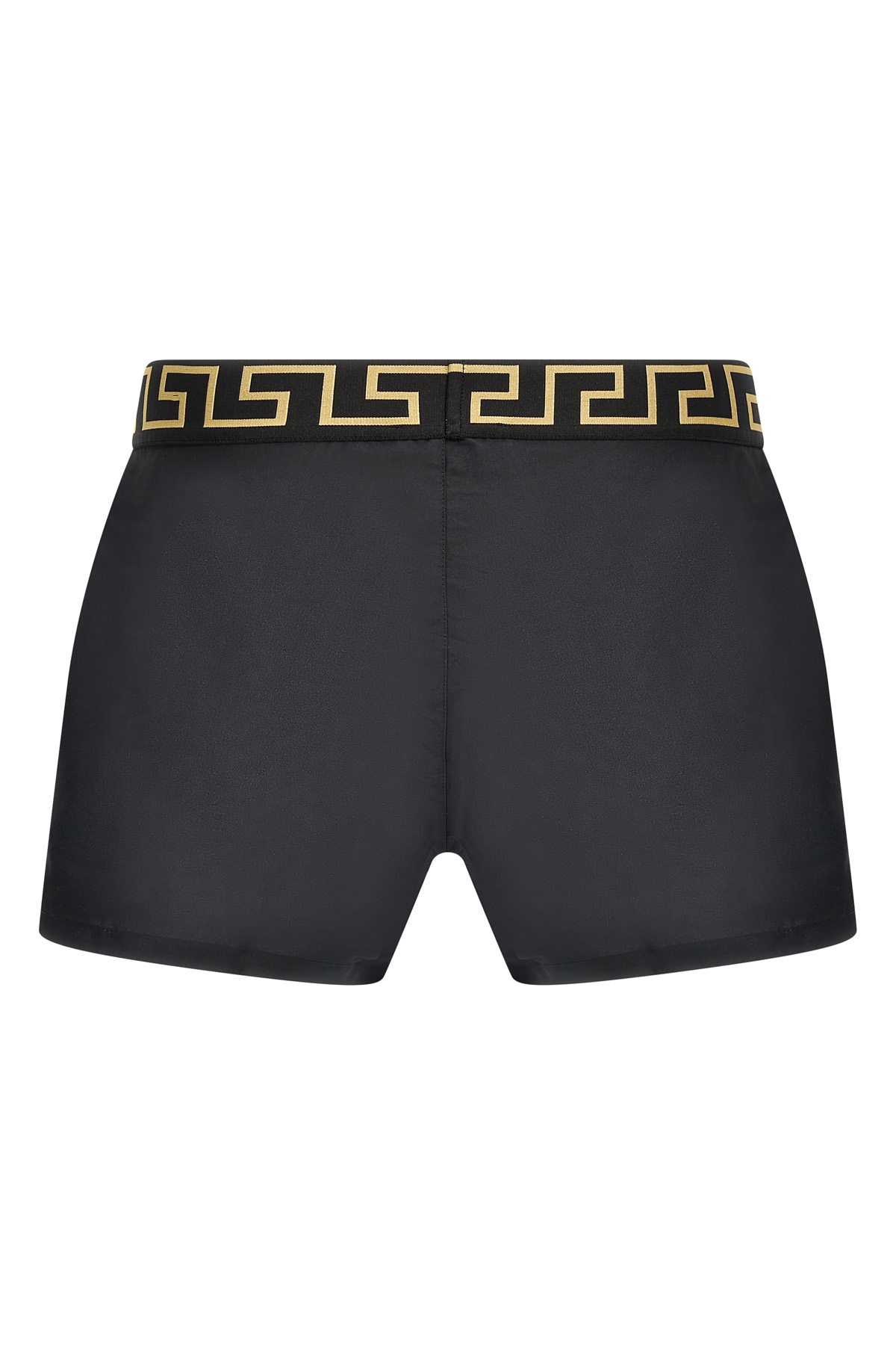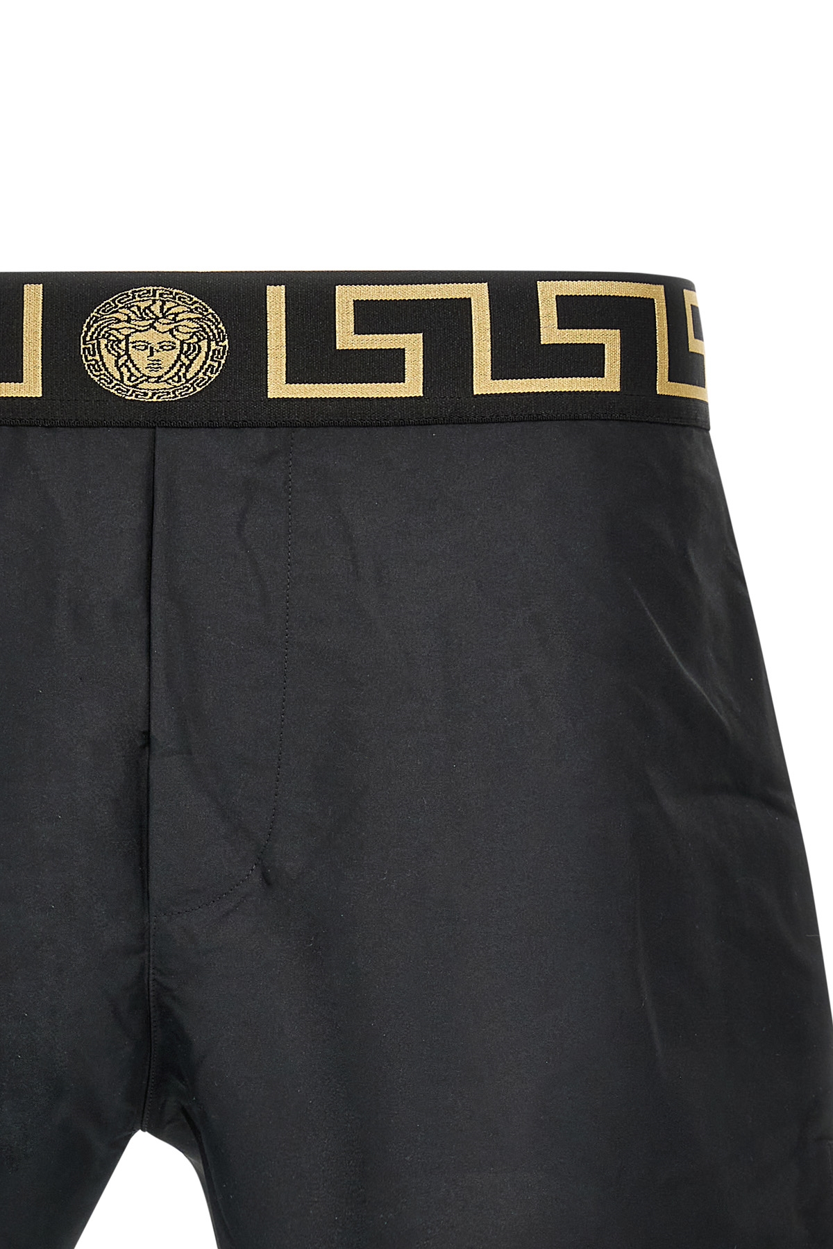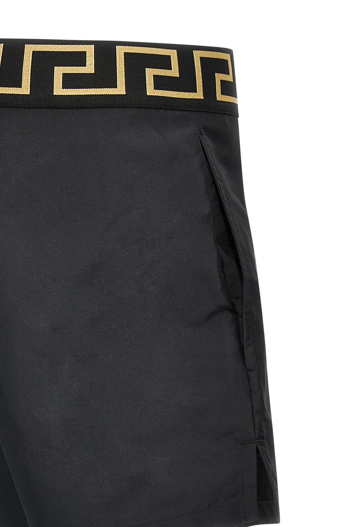 Nylon swimsuit with 'Greca' elastic waistband, pockets, inner mesh briefs.