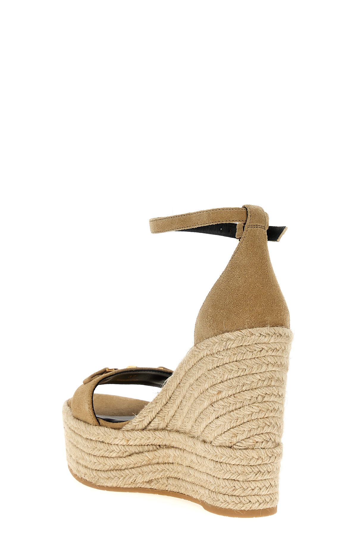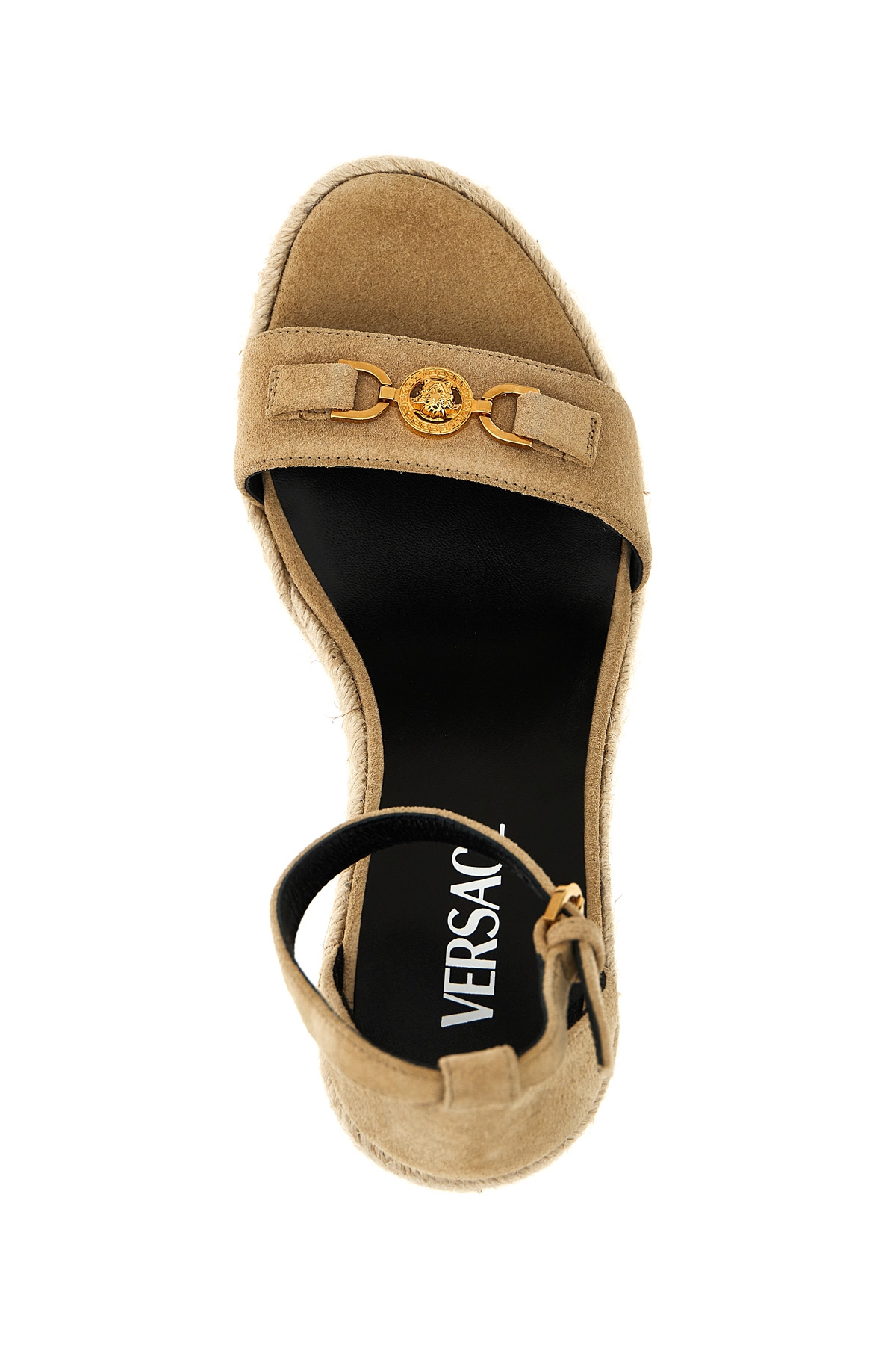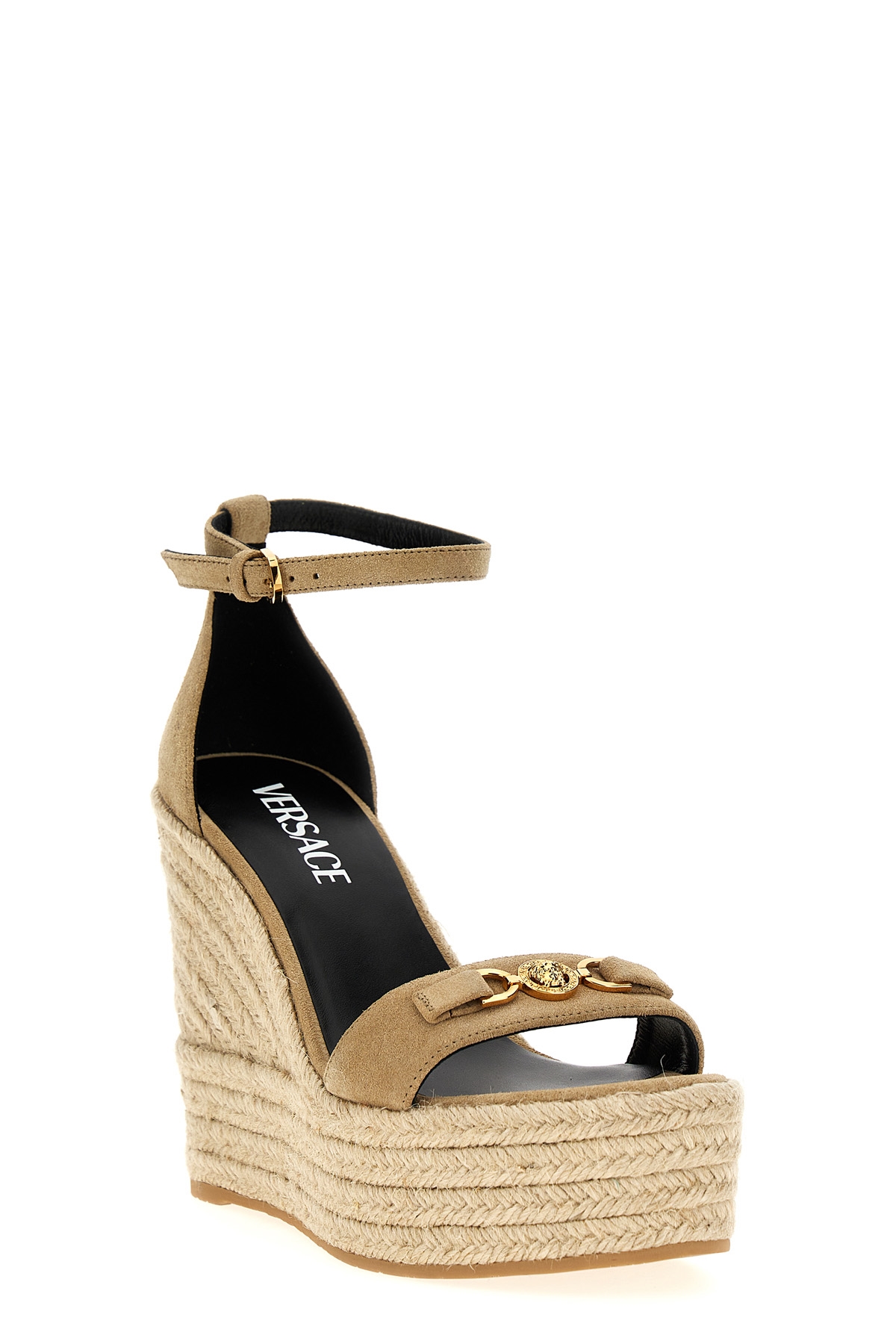 Suede wedge, front band with metal 'Medusa '95' detail, ankle strap, raffia wedge, rubber sole.