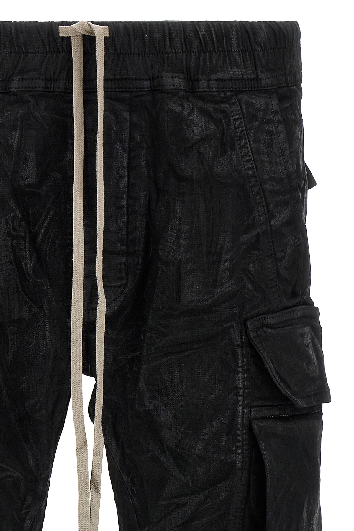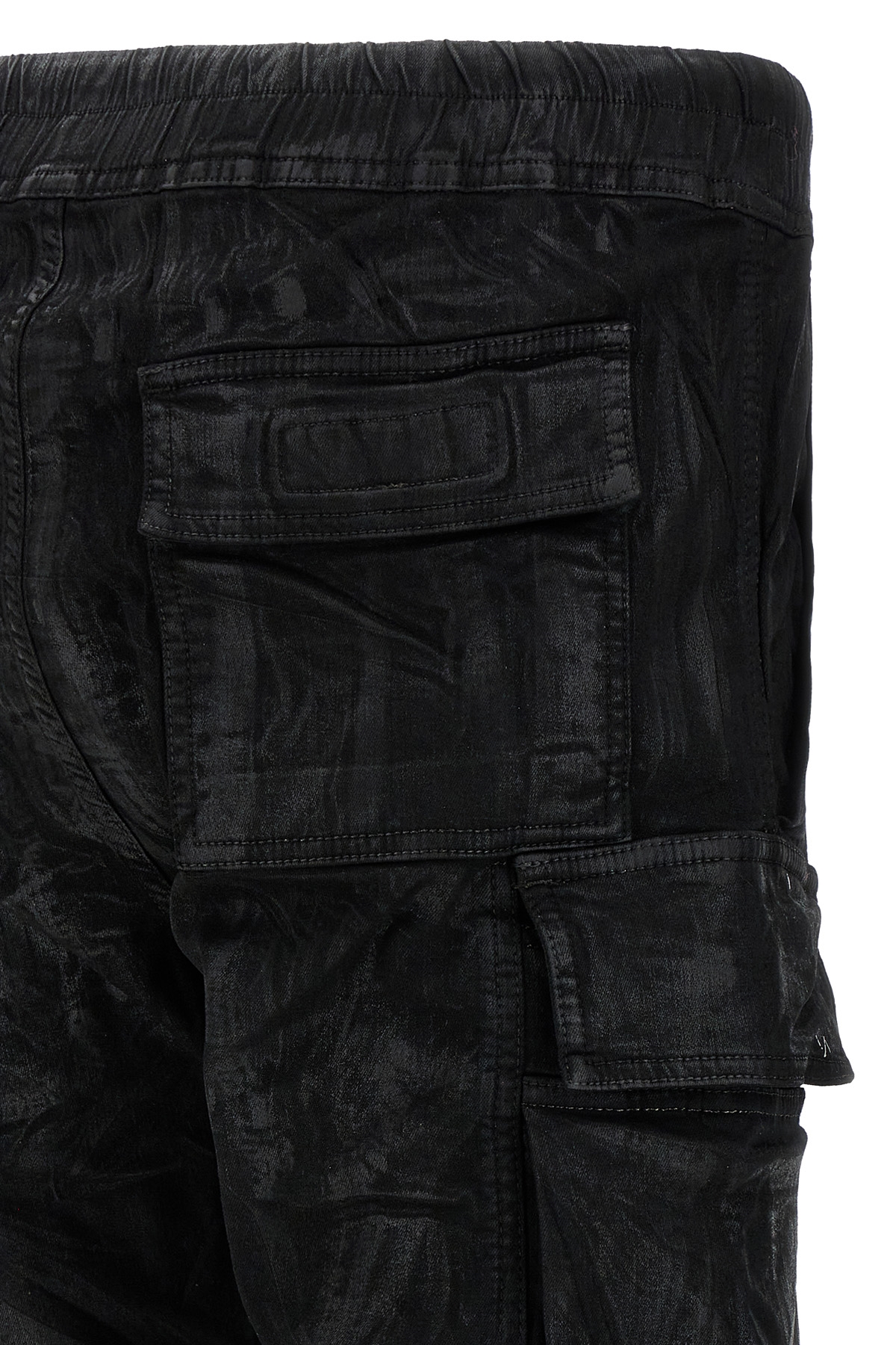 'Mastodon Cut' stretch denim pants overdyed foil with patent leather stains, elastic and drawstring at the waist, flap with buttons, pockets, elastic ankle cuffs.