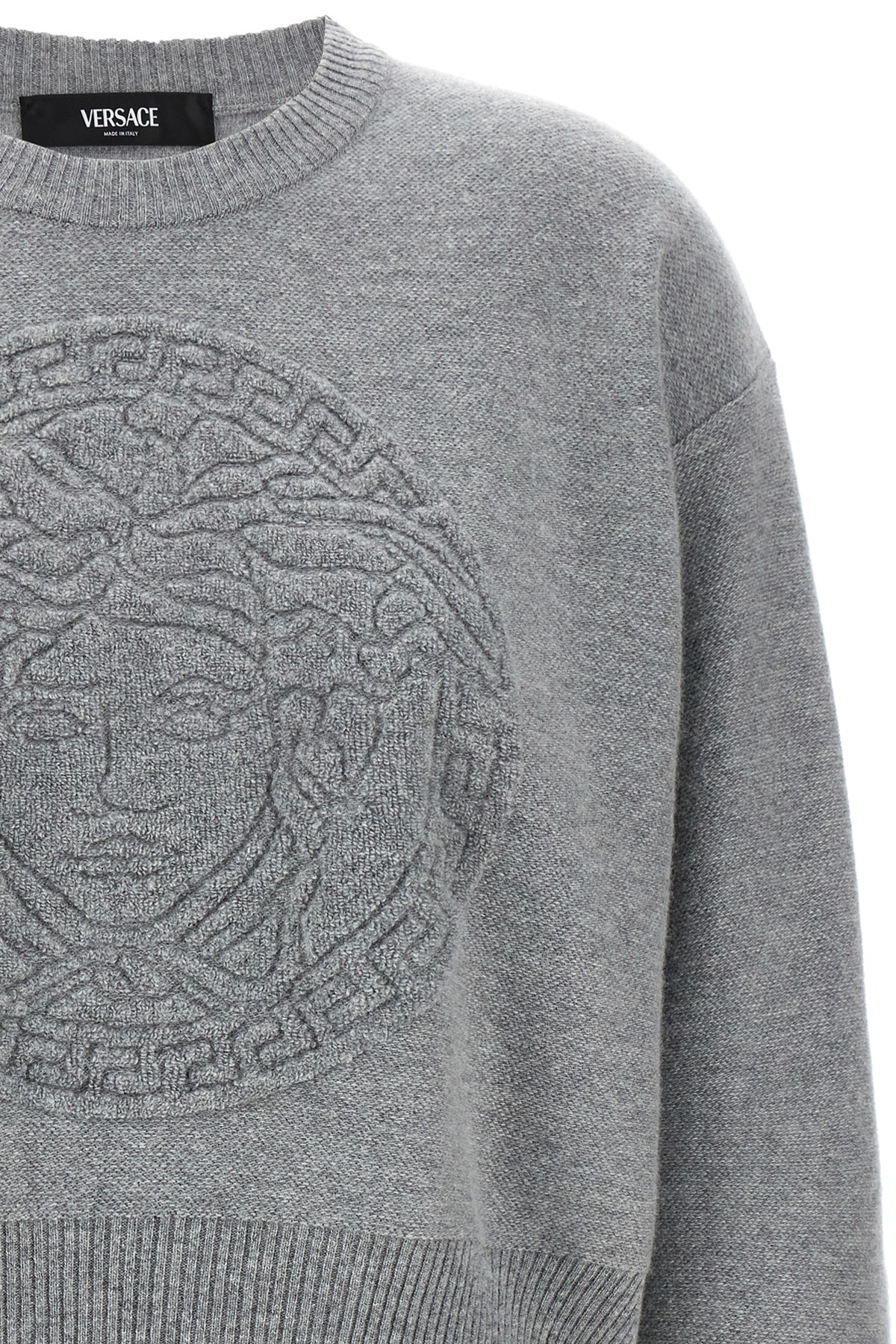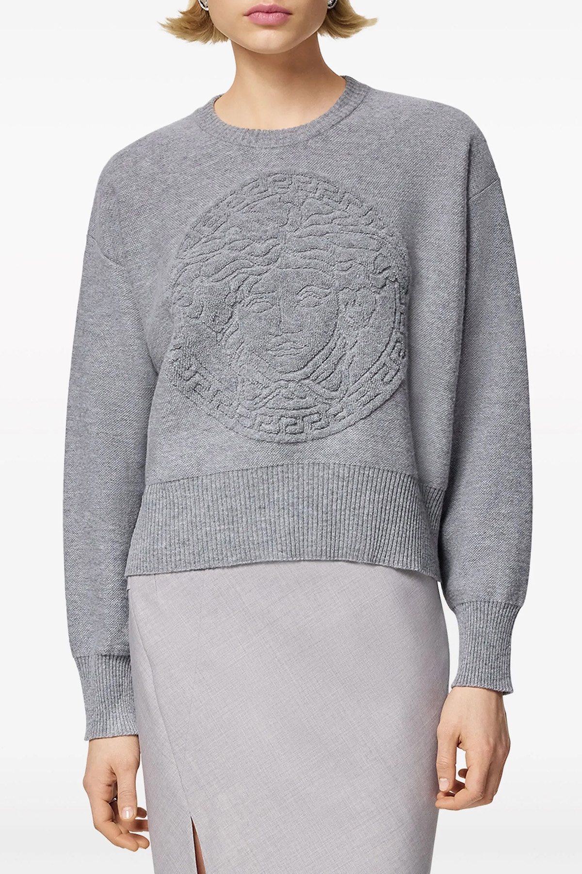 Wool and cashmere blend sweater with jacquard 'Medusa' terry cloth pattern, crew neck and long cuffed sleeves.