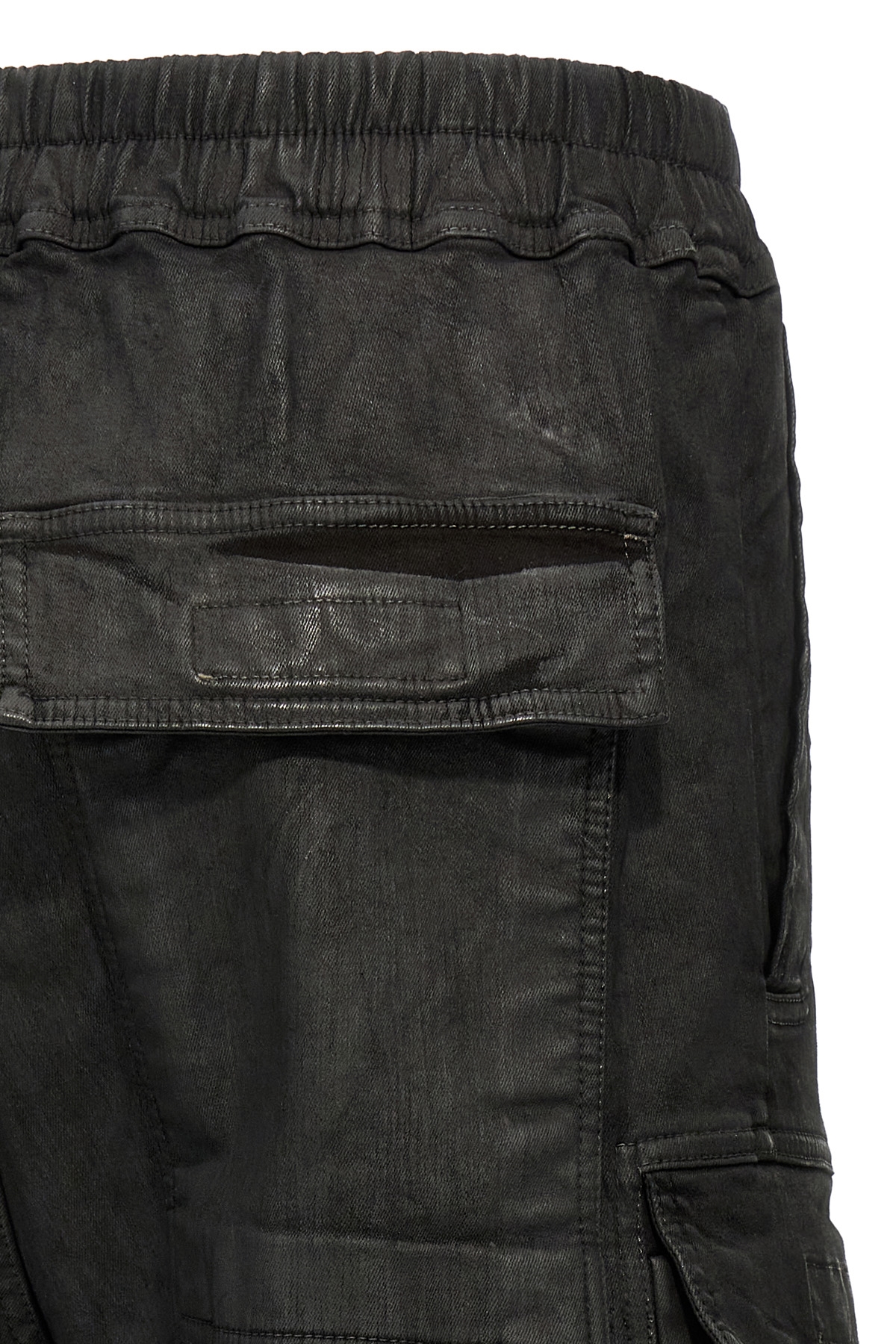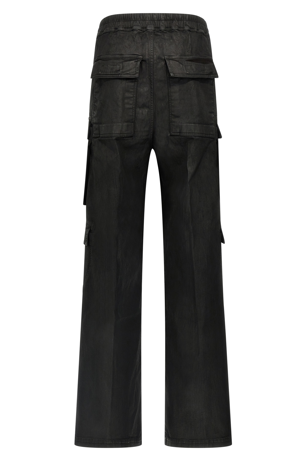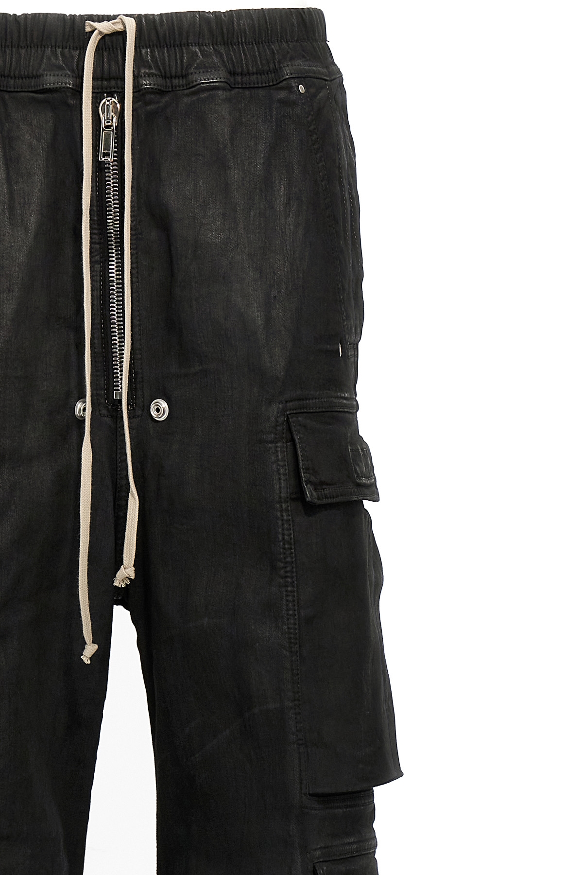 'Double Cargo Jumbo Belas' jeans in stretch cotton denim overdyed and treated with wax finish, low crotch and wide leg, elastic with adjustable drawstring at the waist, zip closure, pockets.