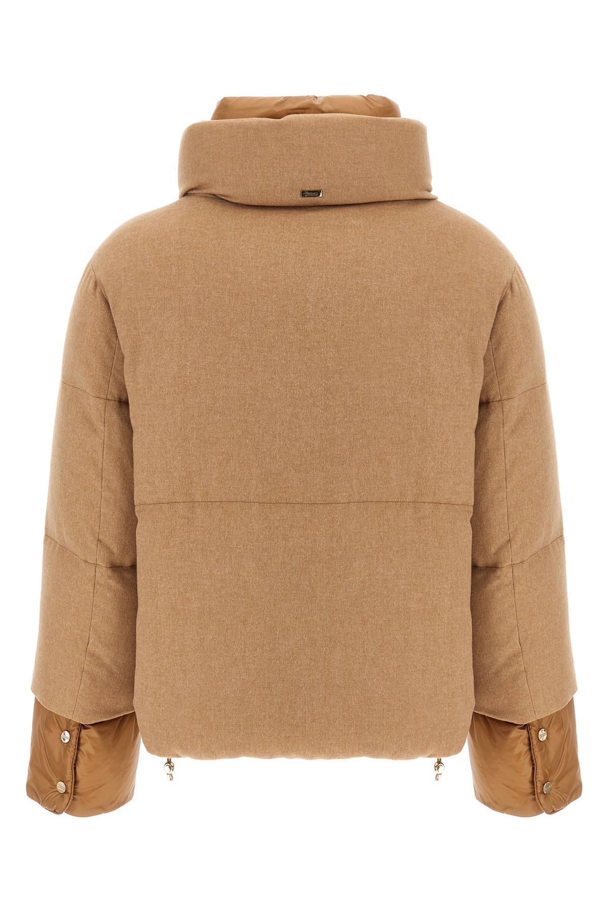 Two-material silk and cashmere down jacket, nylon lining with feather padding, zip closure, high neck, pockets, long sleeves, adjustable drawstring at the hem.