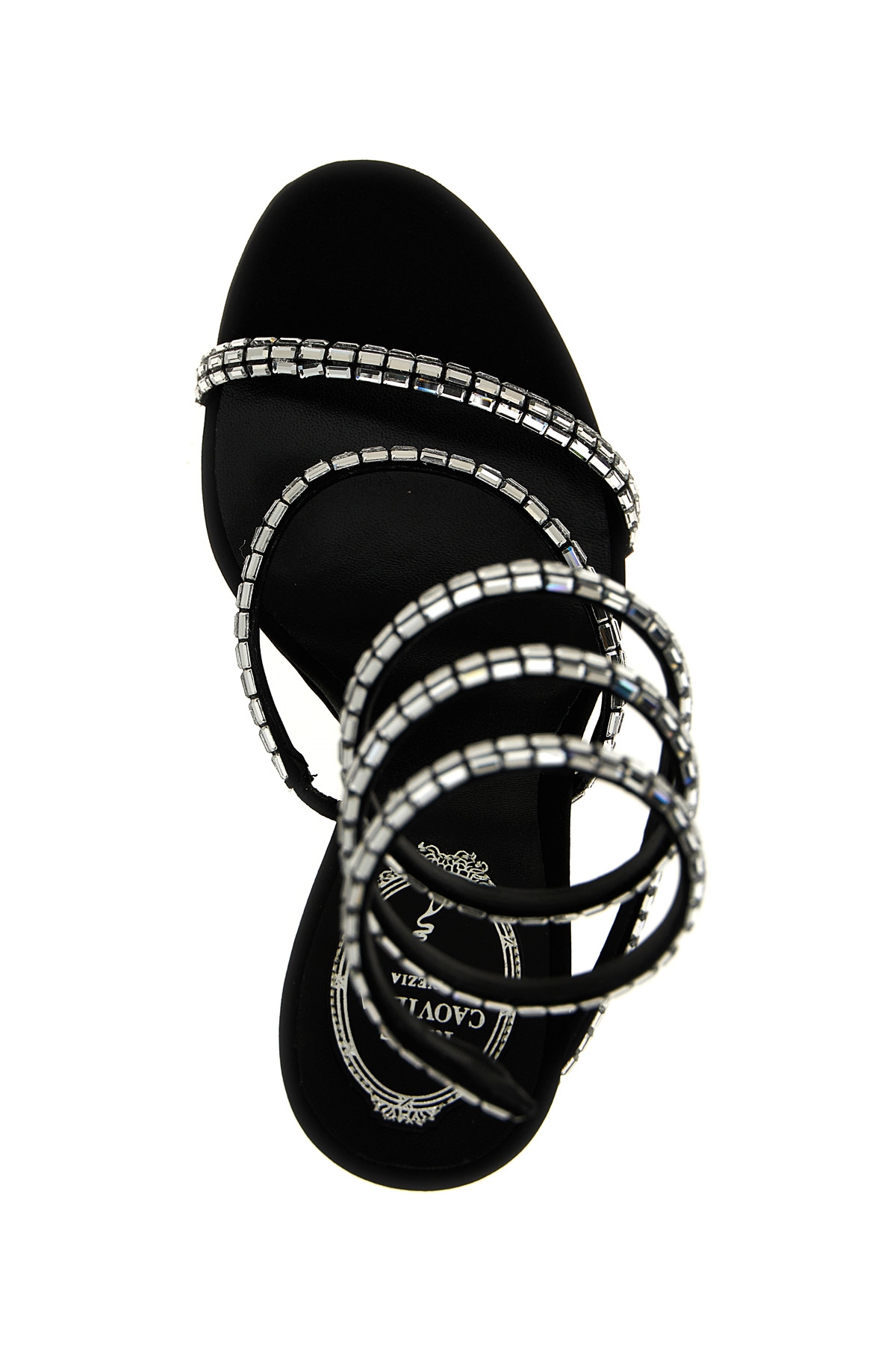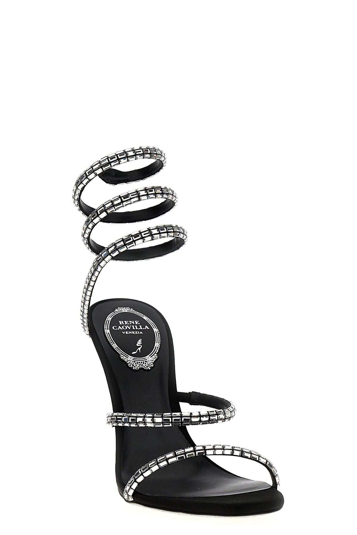 'Cleo Chandelier' satin sandals with all-over rhinestone applique, band wrapping around the ankle, heel, stardust sole.