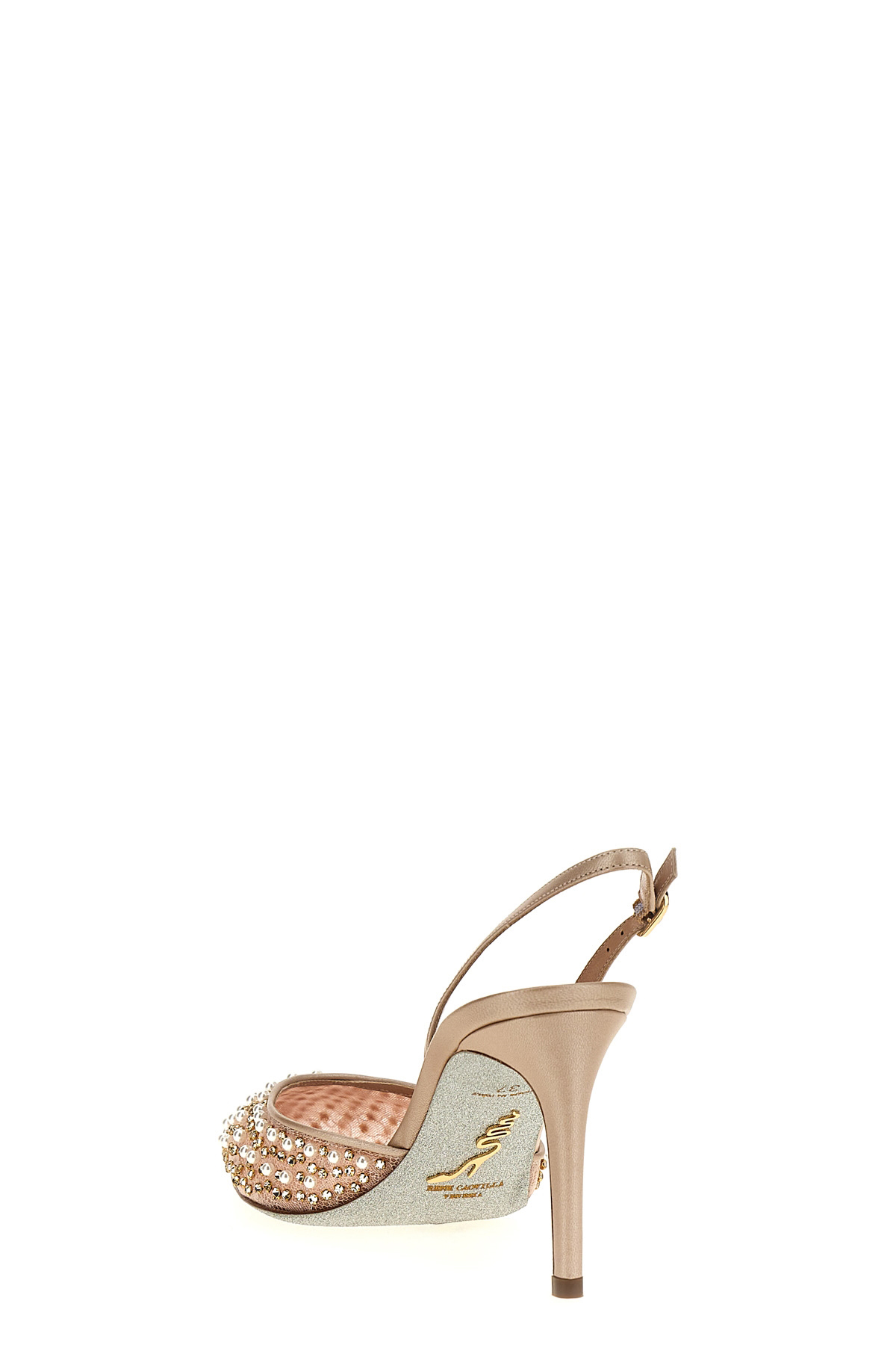 'Aretha' leather and lace slingbacks with rhinestone and pearl applique, adjustable strap, pointed toe, stardust sole.