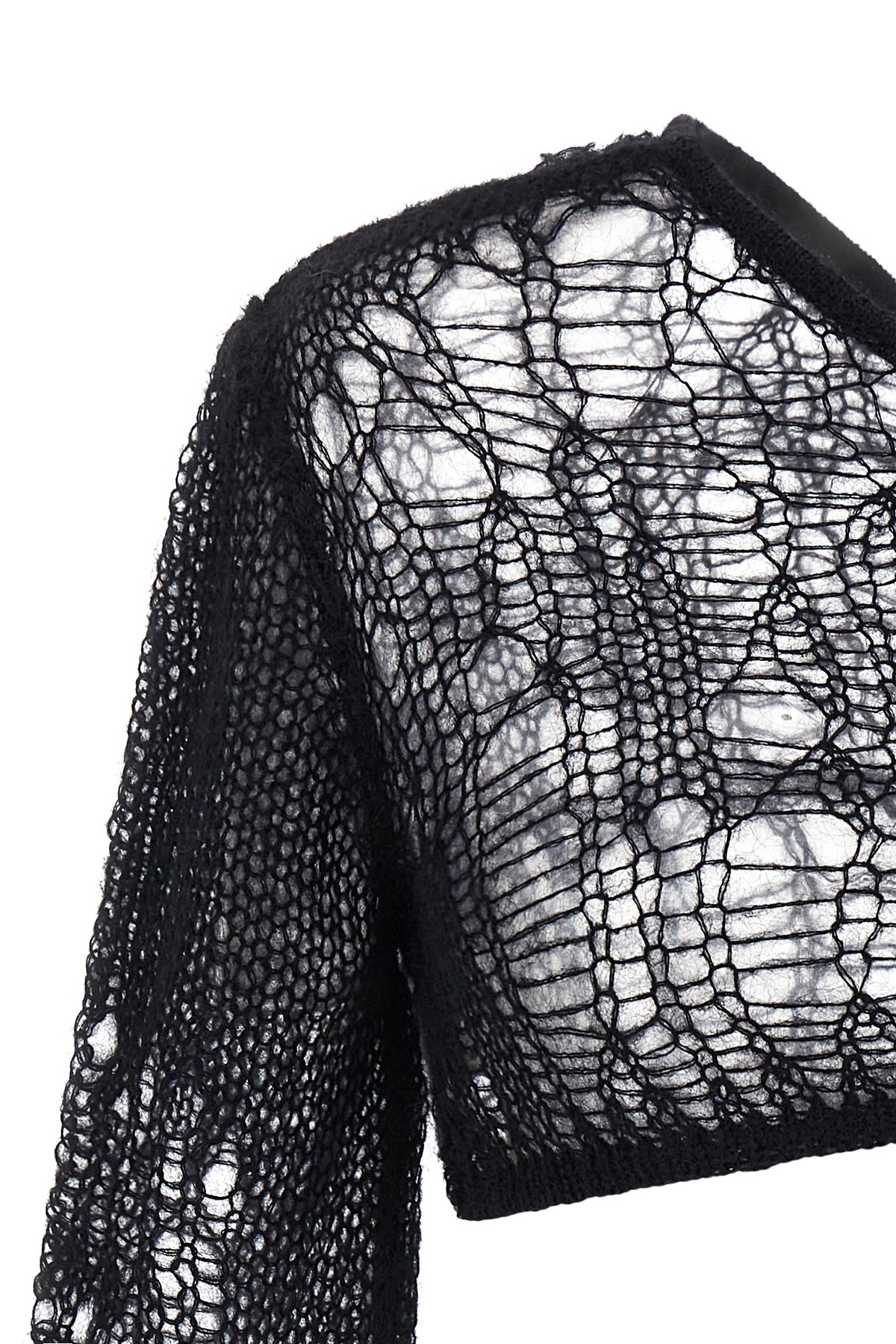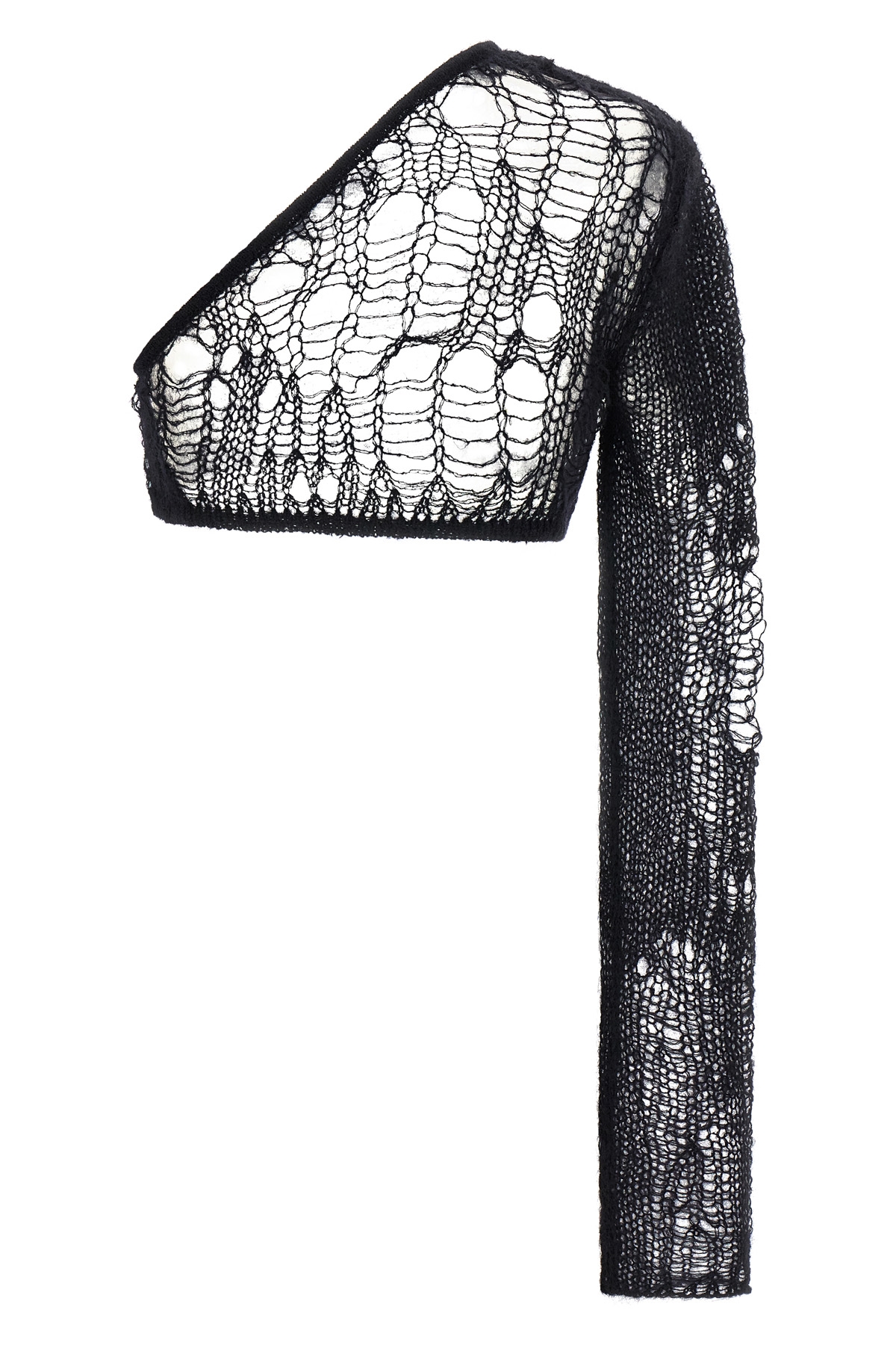 'Spider Ziggy' top in openwork mohair blend, one-shoulder model with long sleeves.
