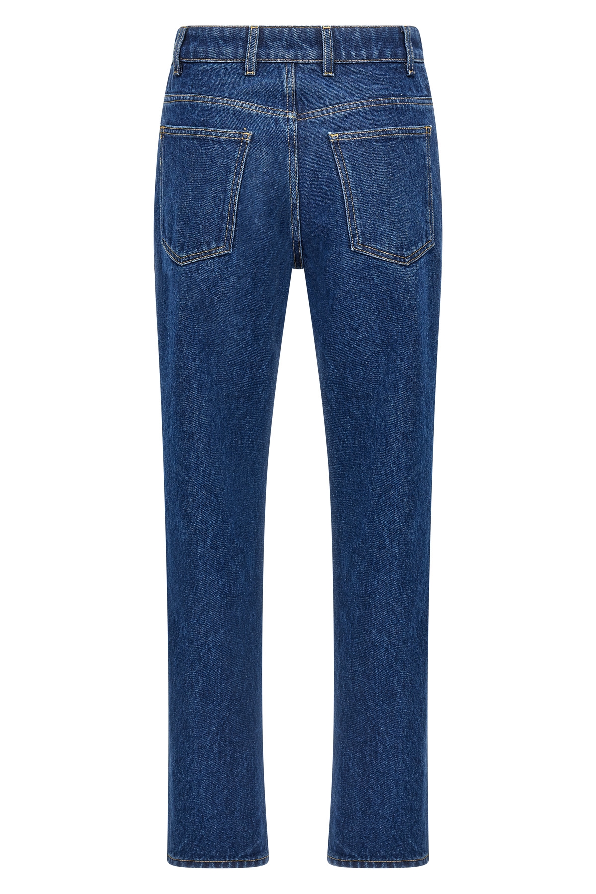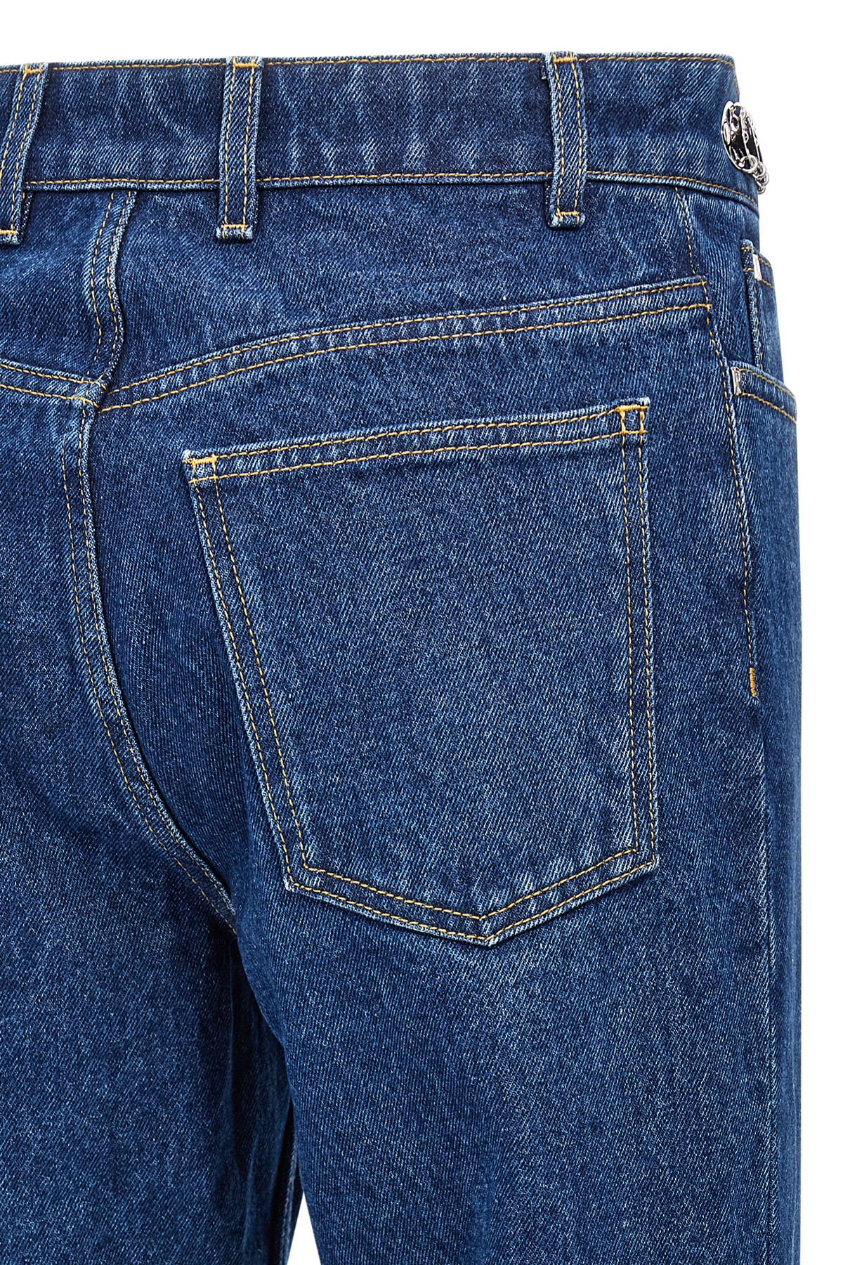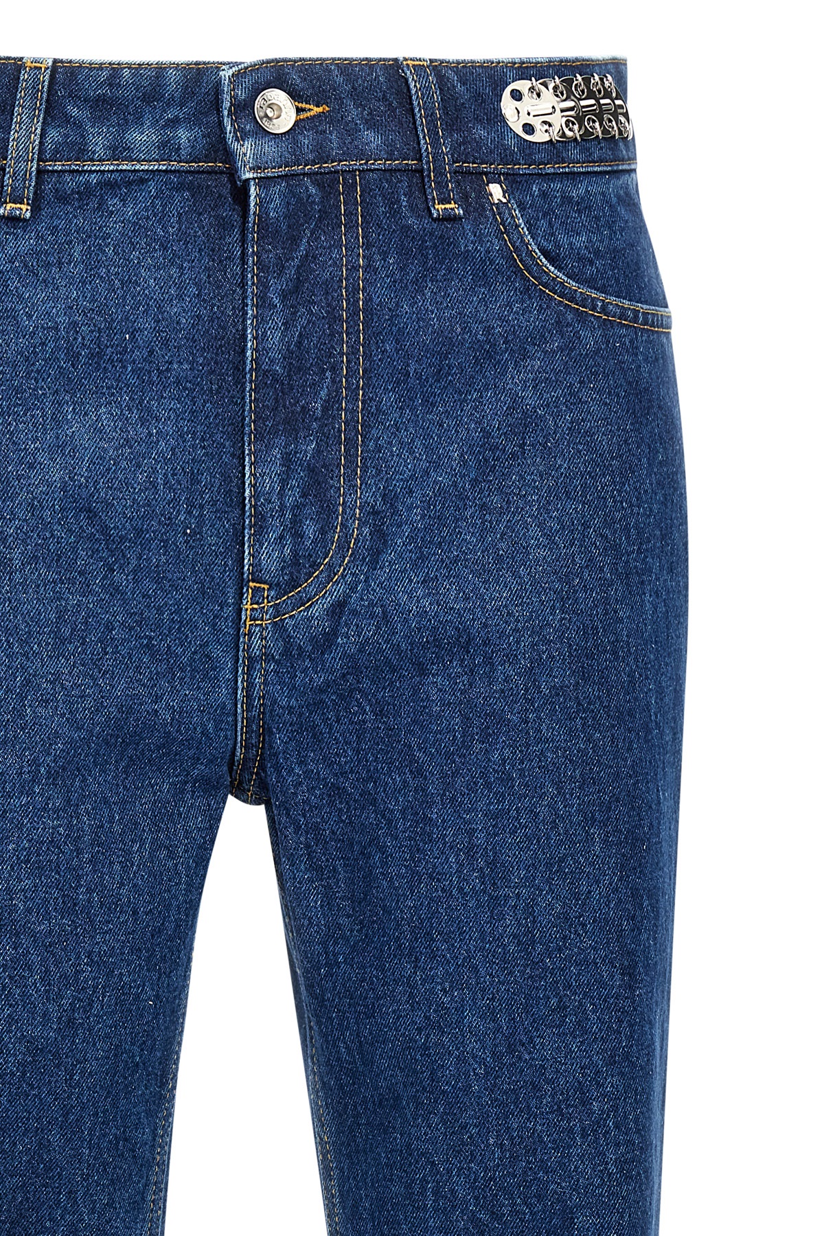 Cotton denim jeans with silver metal pads at the waist on the sides, straight leg, five pockets, zip and button closure.