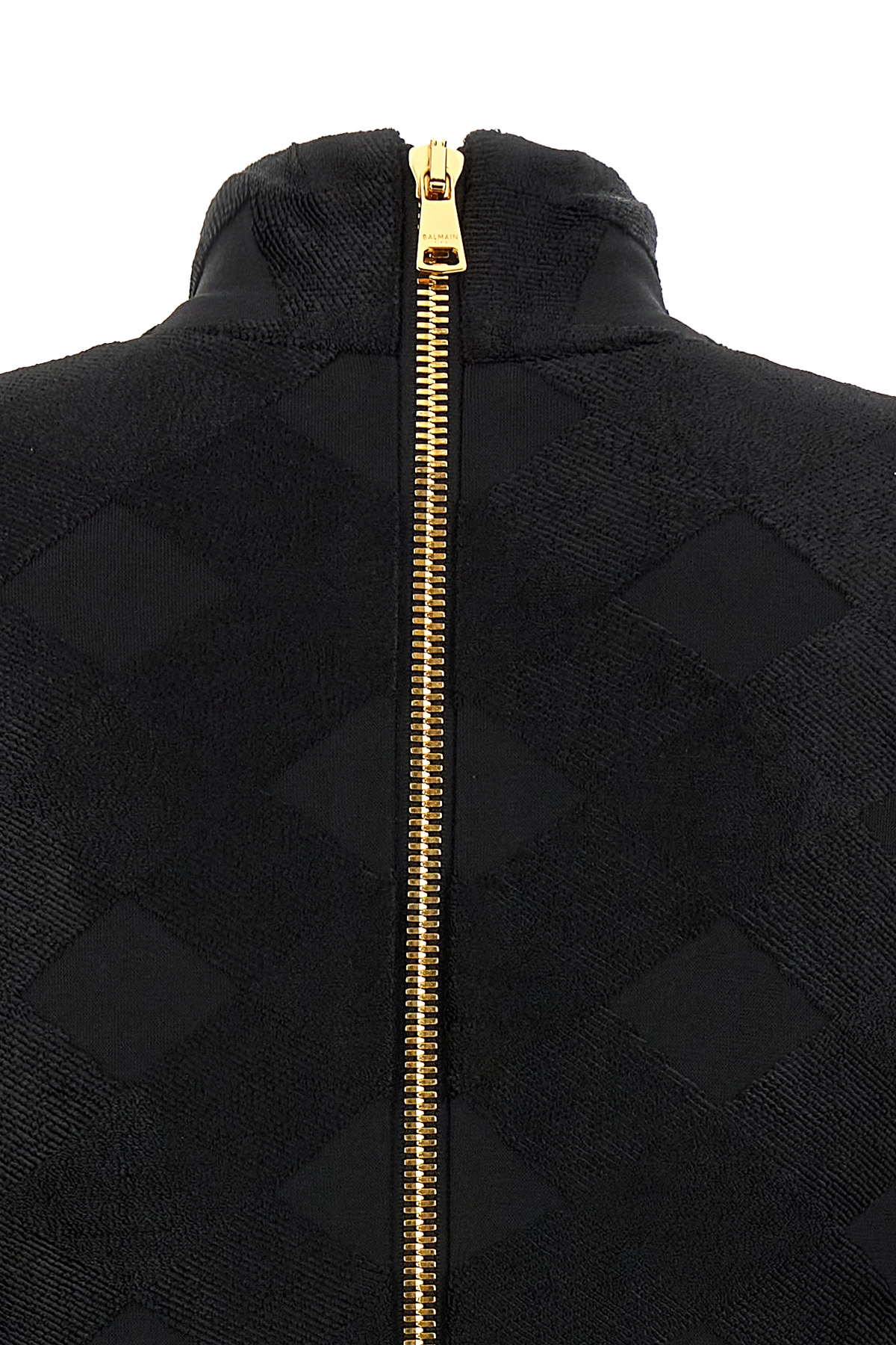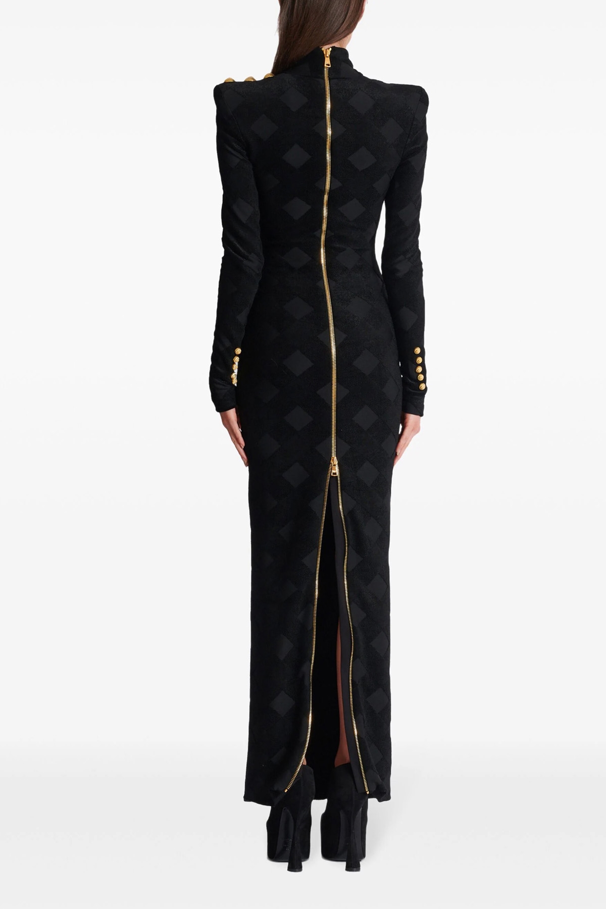 Long vichy bouclette knit dress, high neck, gold metal 'Chiocciola' button applique, long sleeves, padded shoulders, back zip closure.