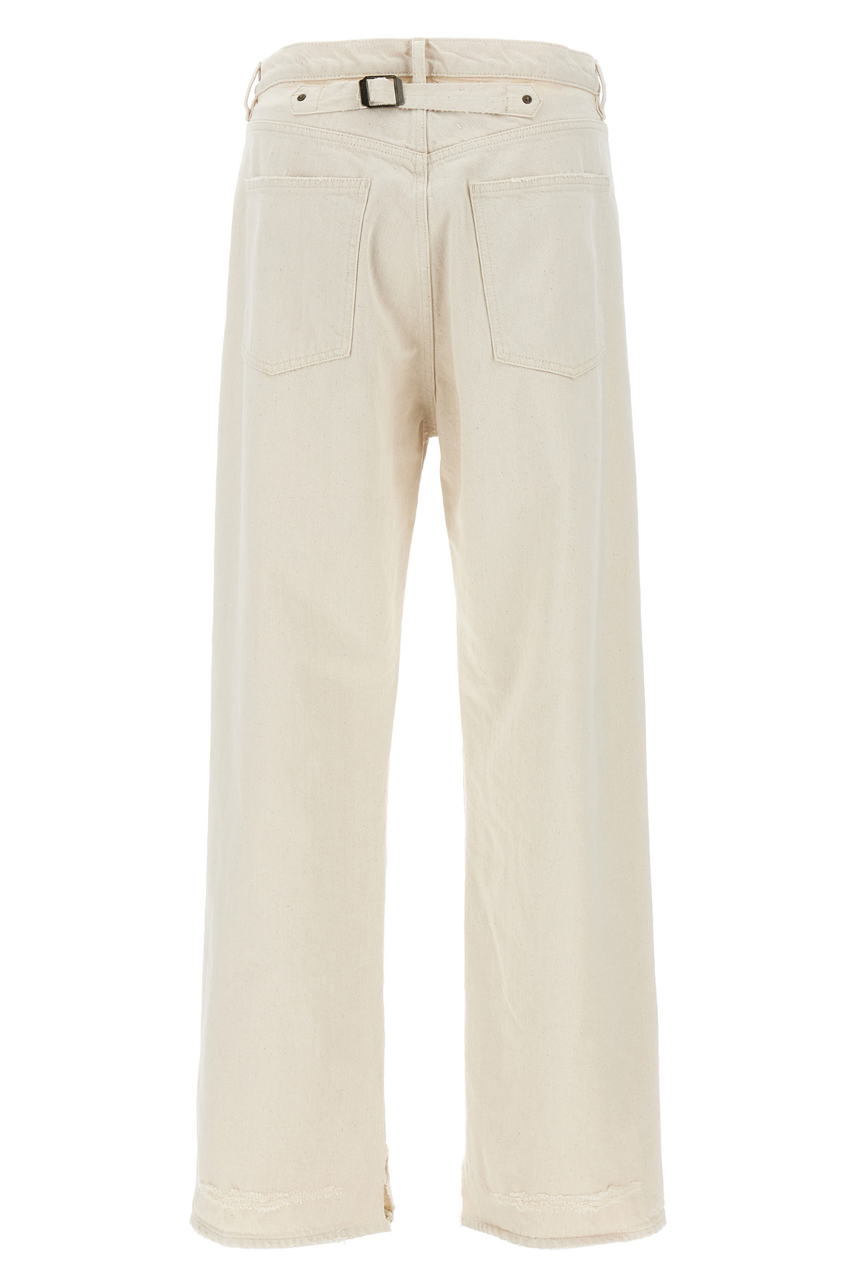 Five-pocket cotton denim jeans, button closure, adjustable back strap, slits and used fabric on the leg bottoms.